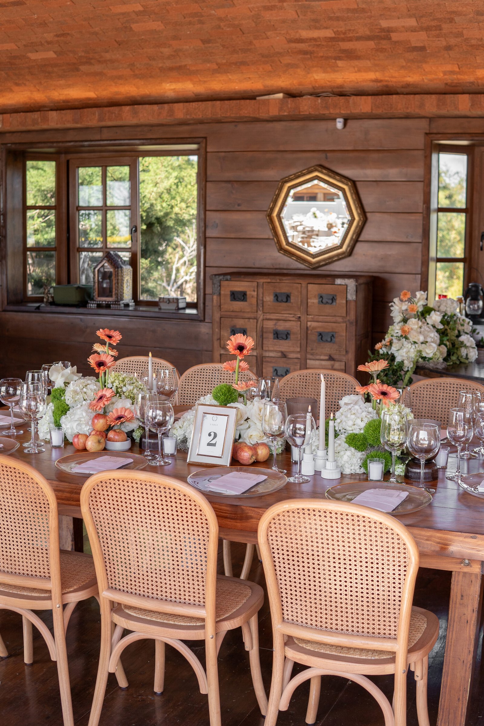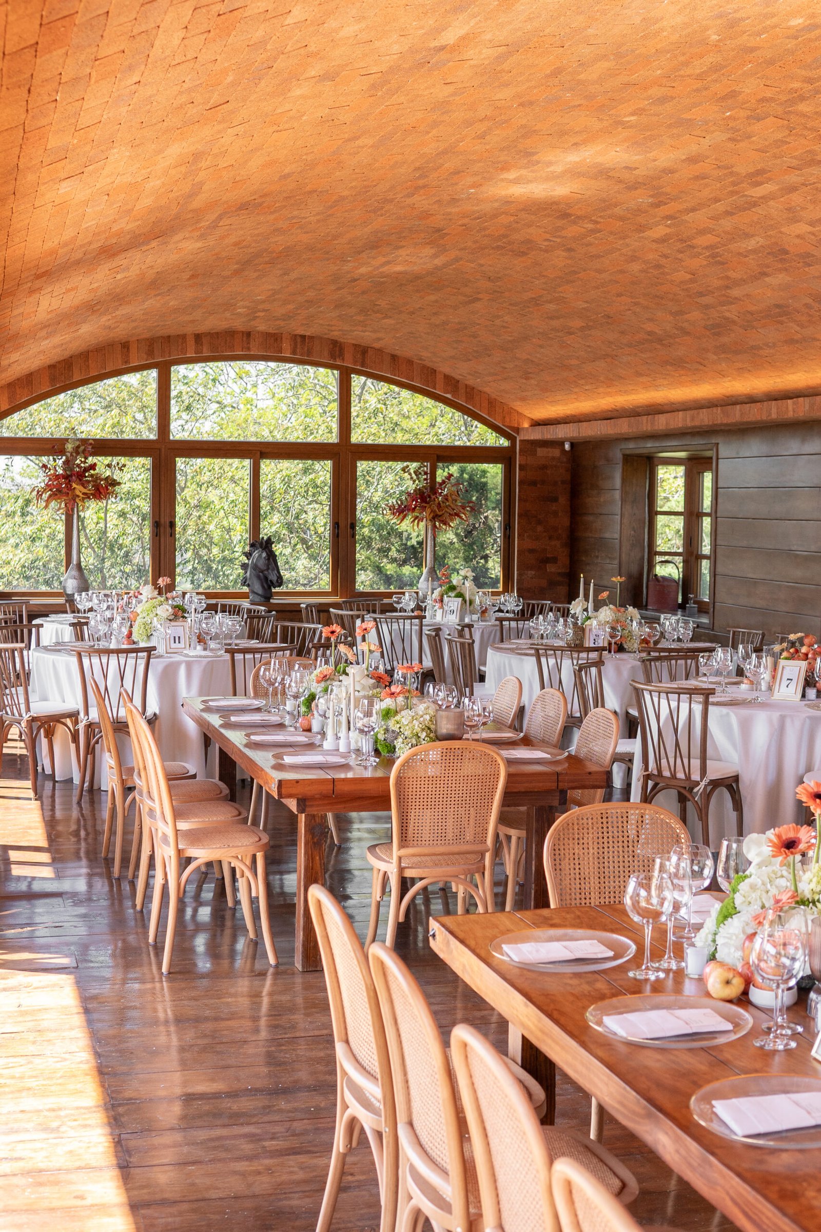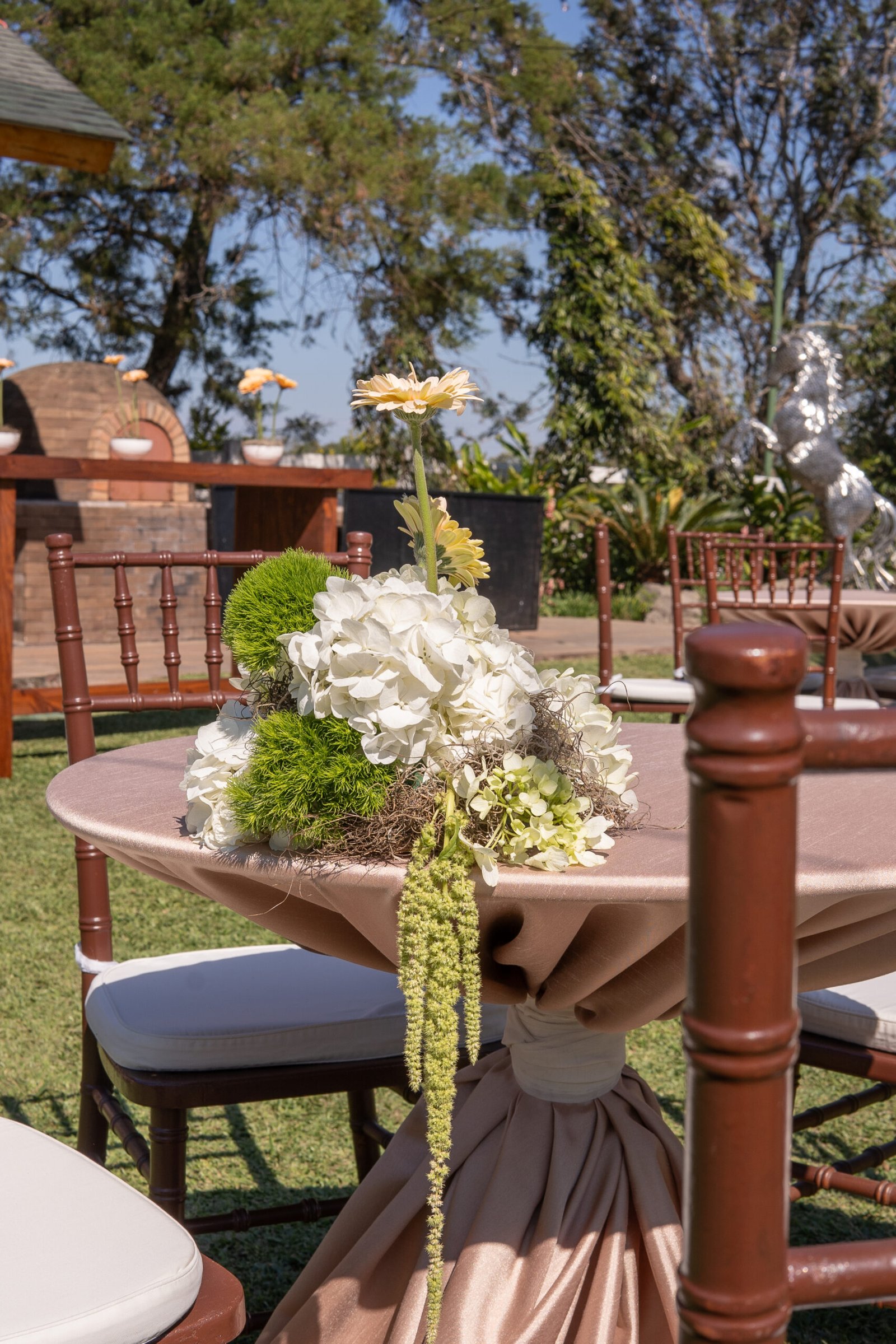 Ari & César’s floral design was created to blend naturally with the rustic charm of their countryside venue. The proposal sought to enhance the warmth of the space through a refined harmony of fresh, modern elements—resulting in a look that felt both grounded and contemporary.