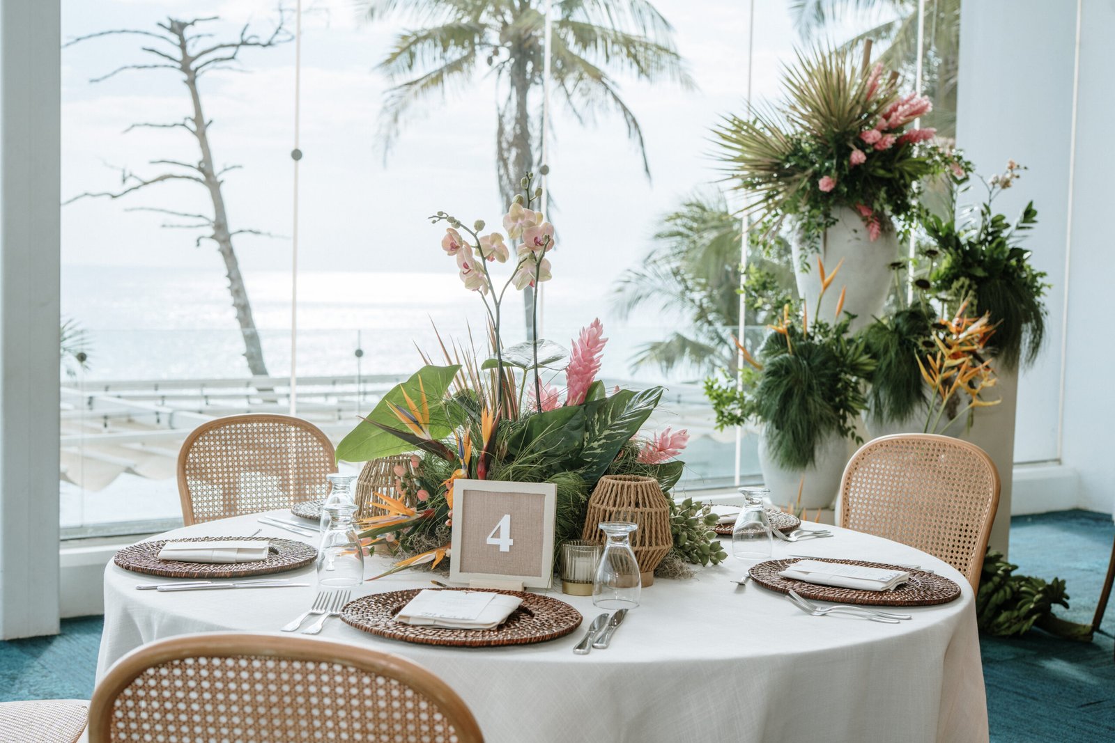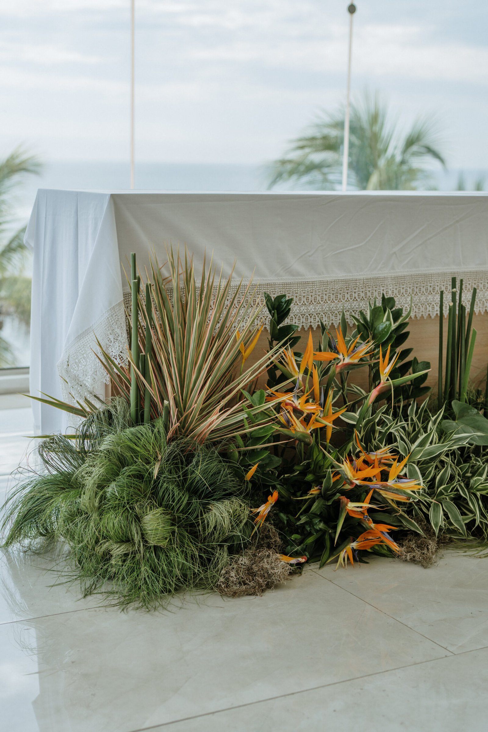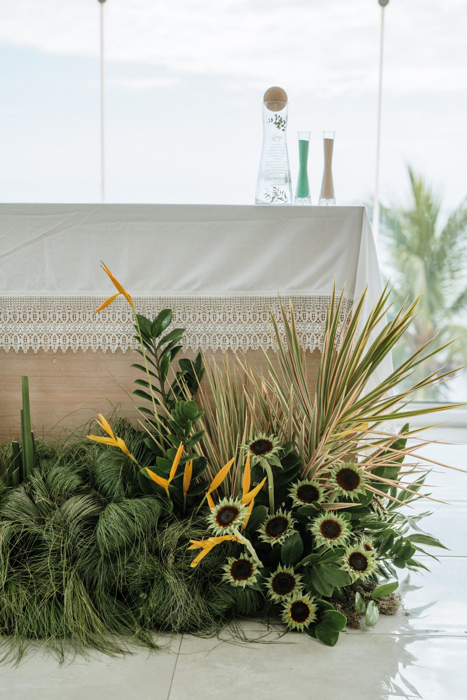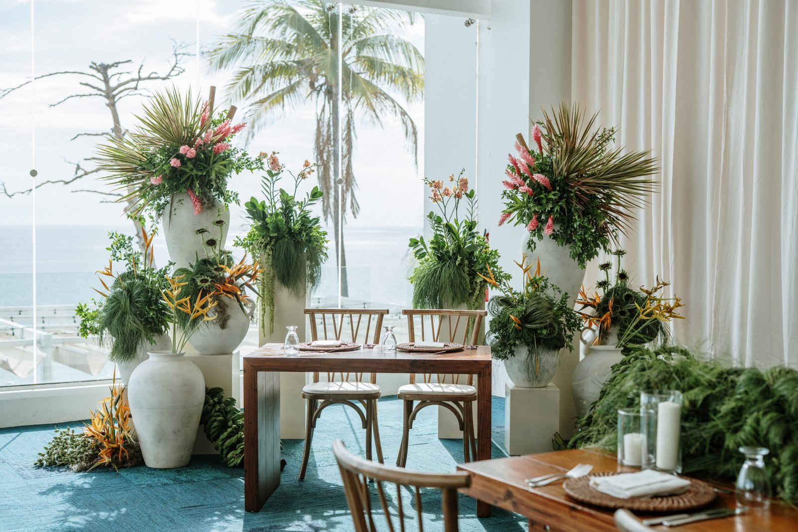 We leaned into the natural scale of tropical elements to build visual weight in all the right places oversized installations, grounded table moments, and a sweetheart area that felt both bold and organic. The goal wasn’t to fill the space, but to let it breathe with purpose. As sunset hit the cliffs, the palette softened, and the whole setting took on a glow that made the tropicals feel editorial.