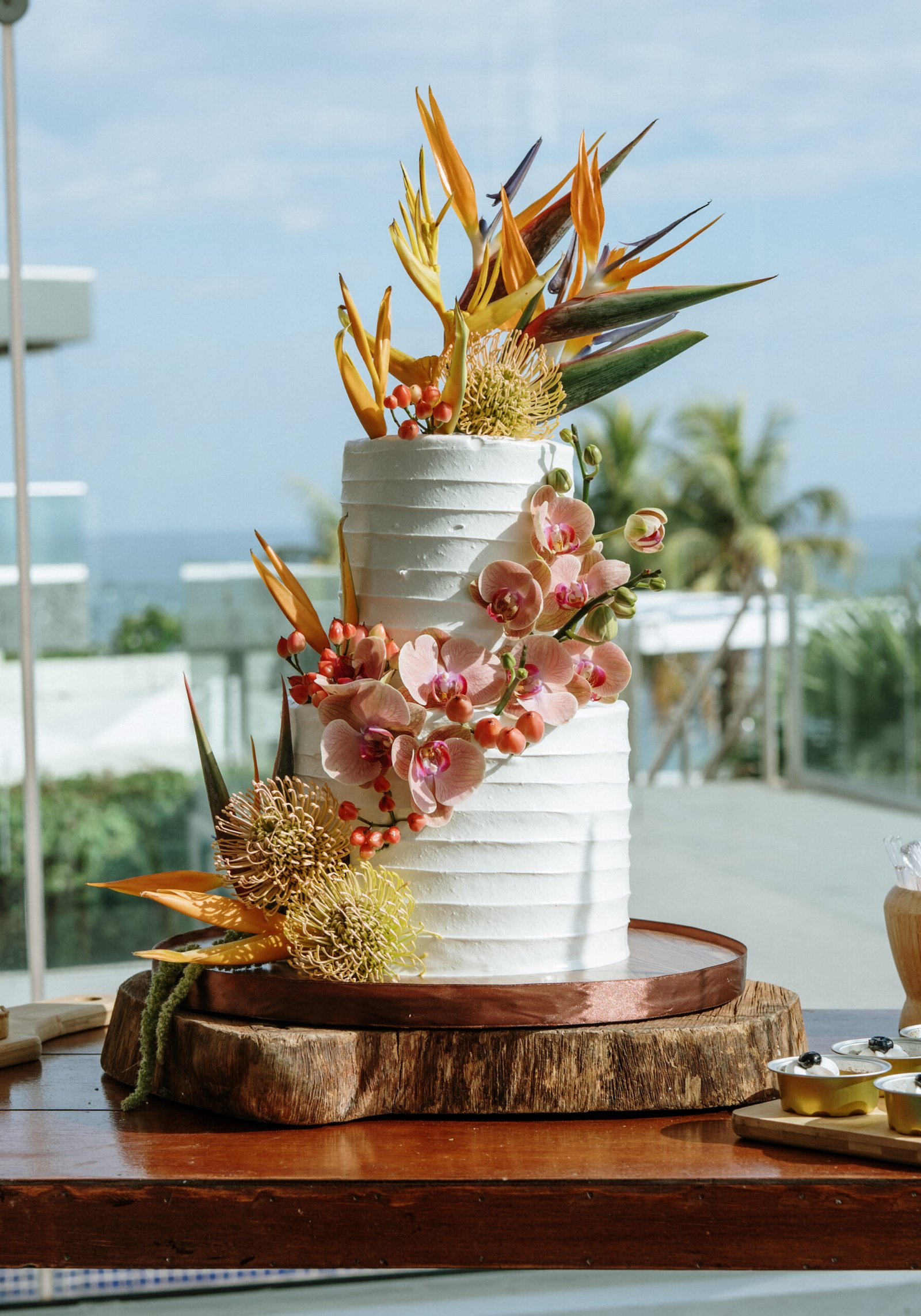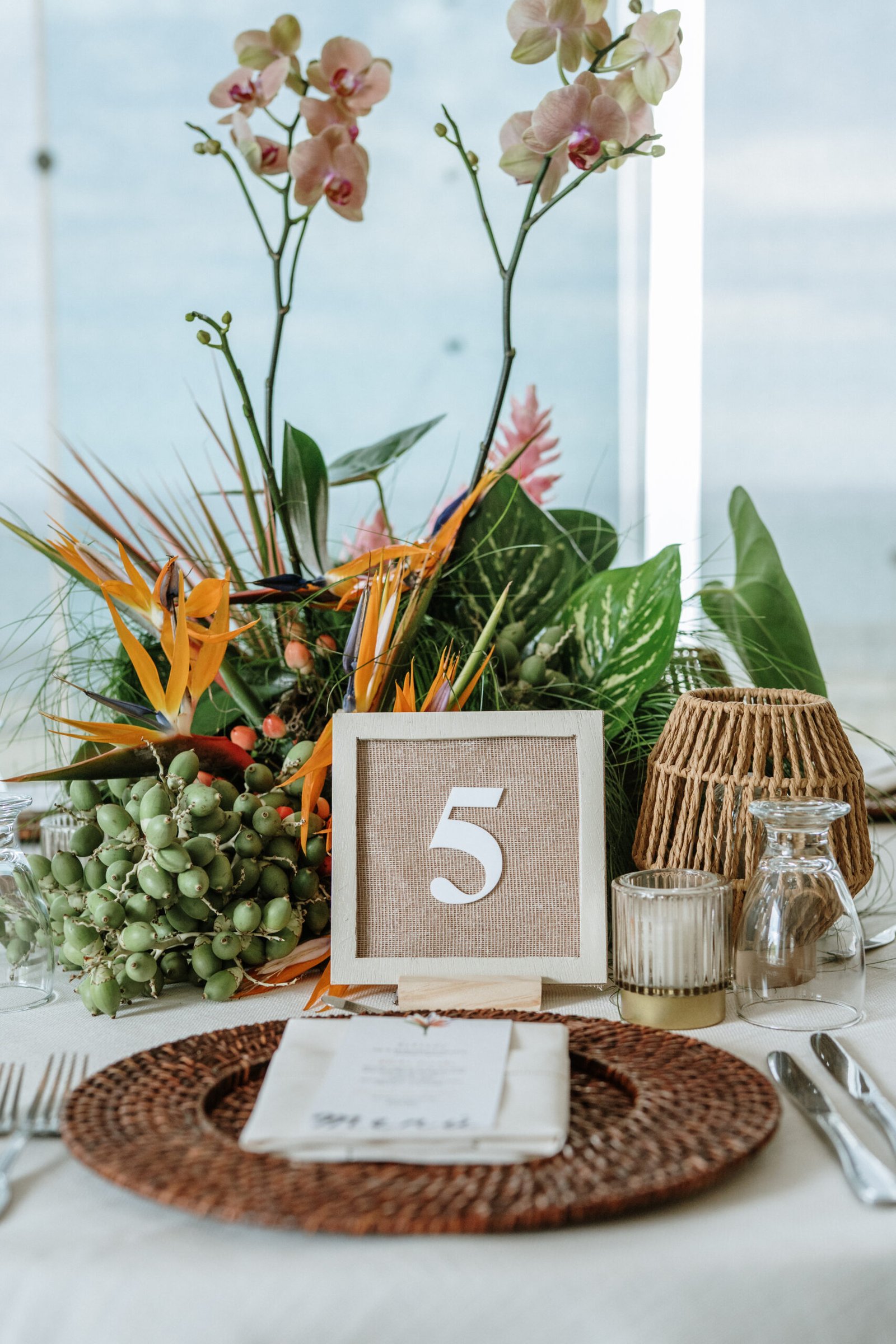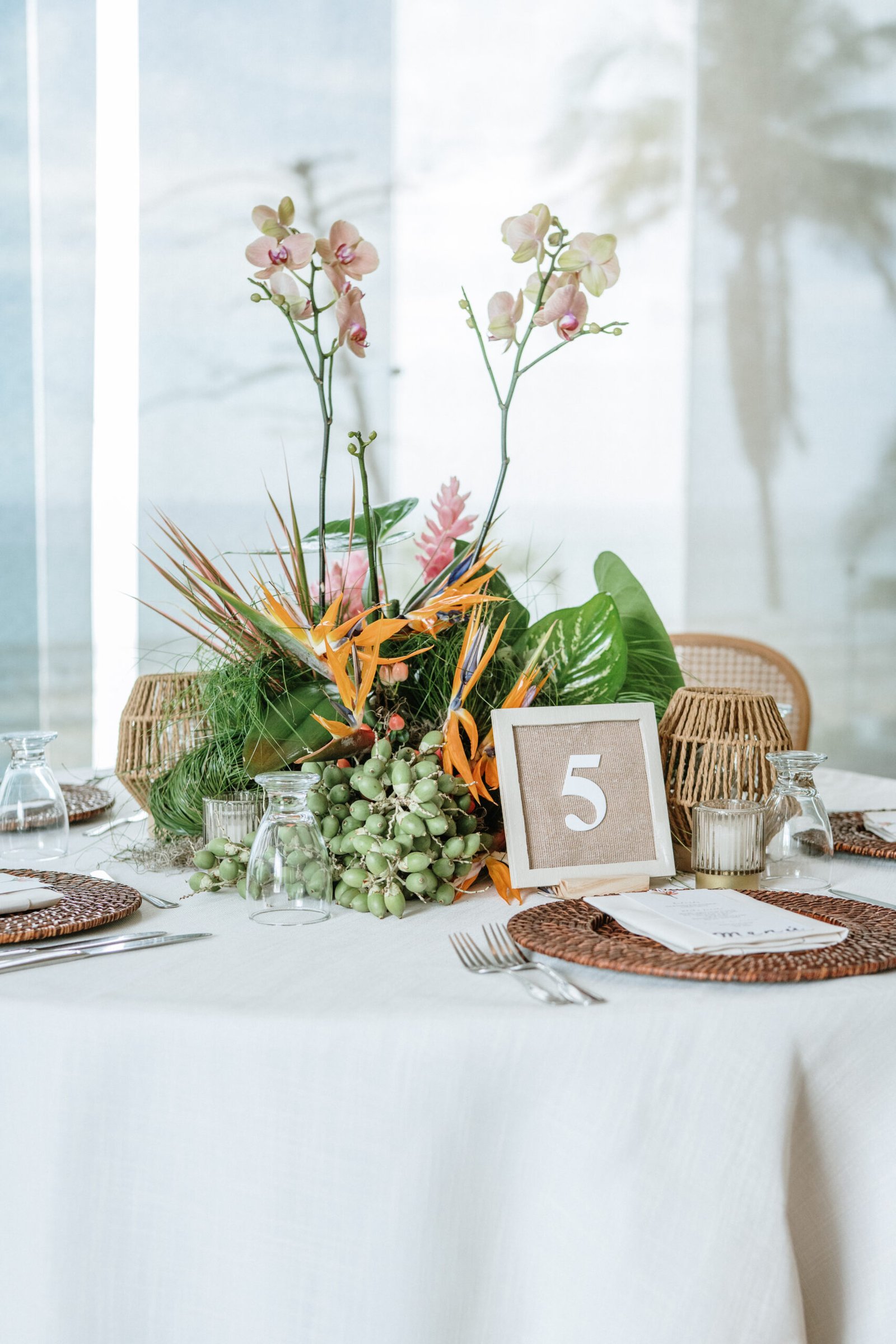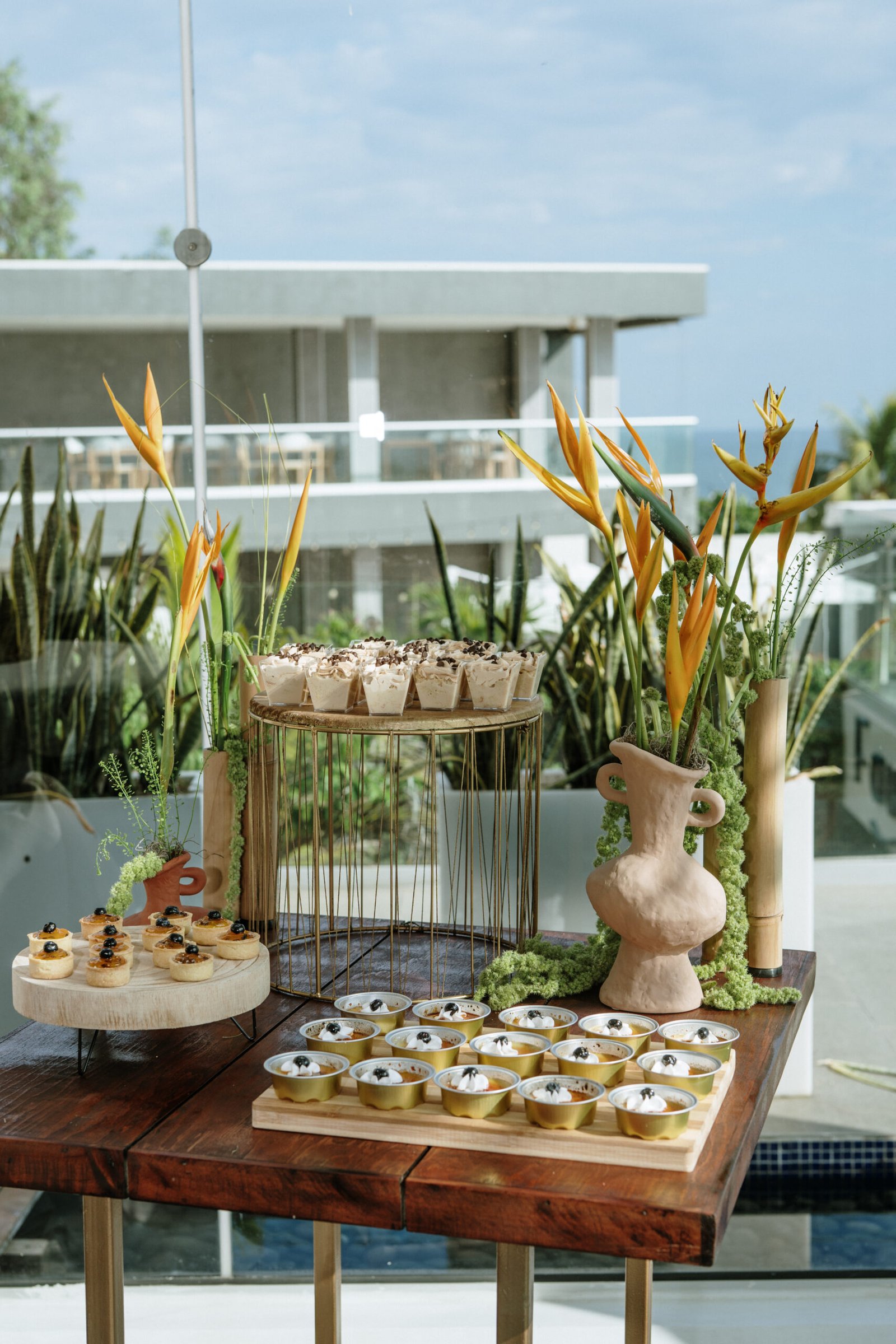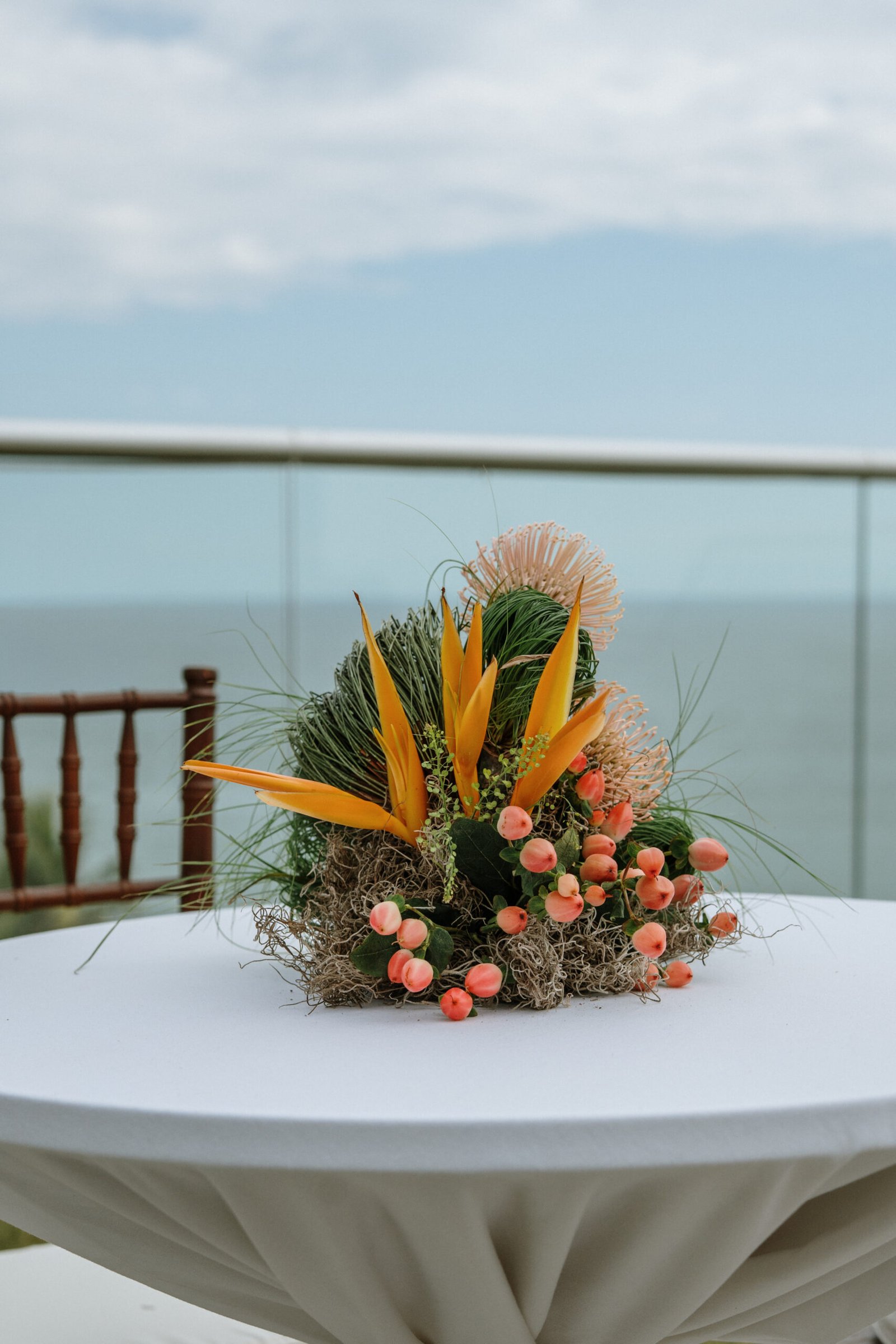 We leaned into the natural scale of tropical elements to build visual weight in all the right places oversized installations, grounded table moments, and a sweetheart area that felt both bold and organic. The goal wasn’t to fill the space, but to let it breathe with purpose. As sunset hit the cliffs, the palette softened, and the whole setting took on a glow that made the tropicals feel editorial.