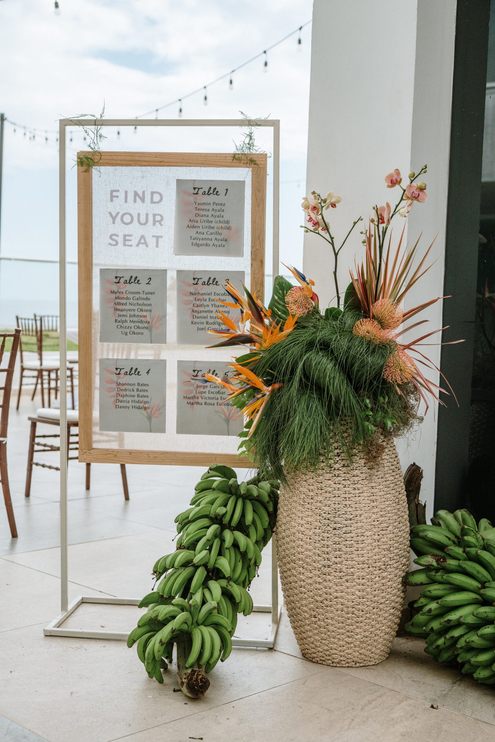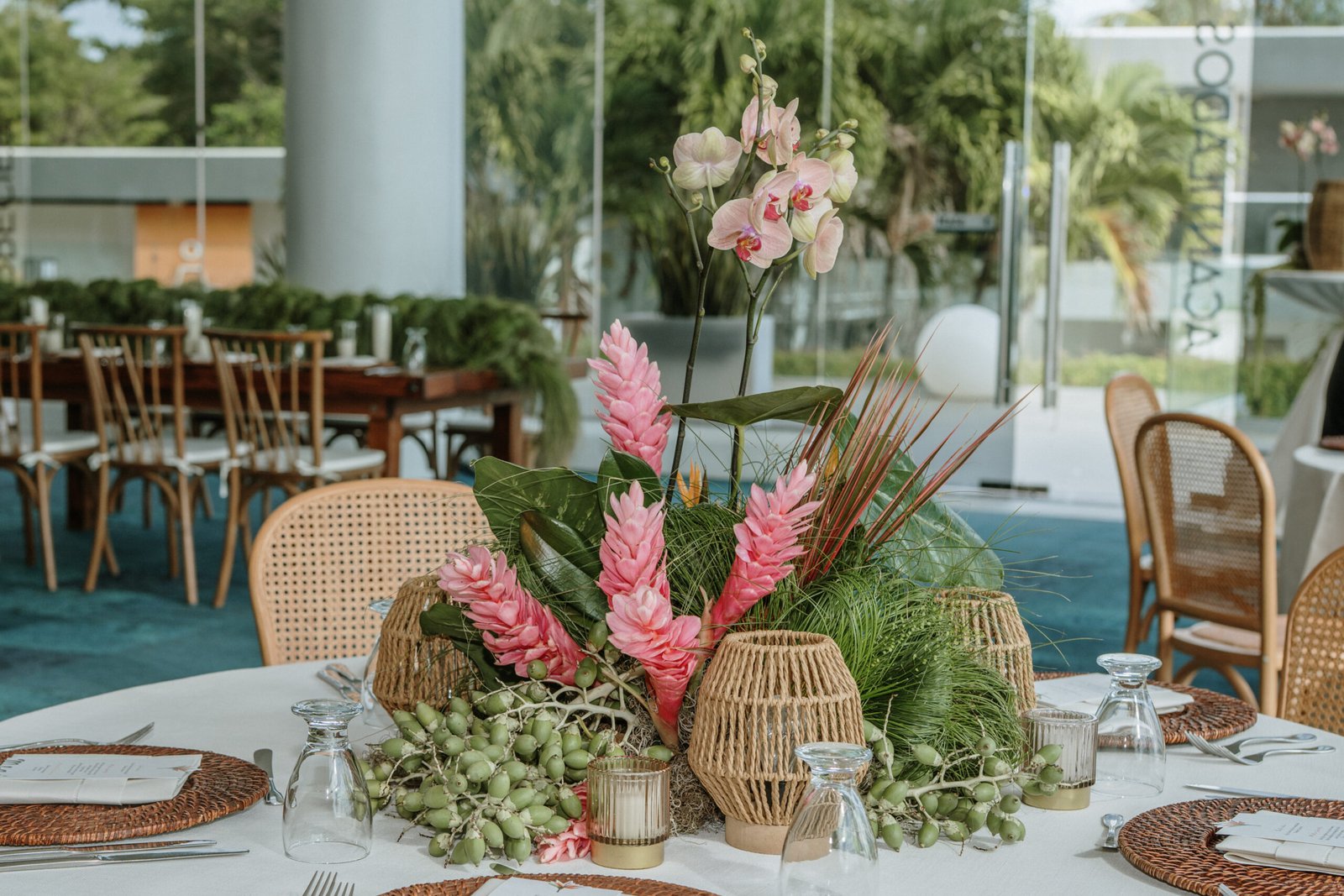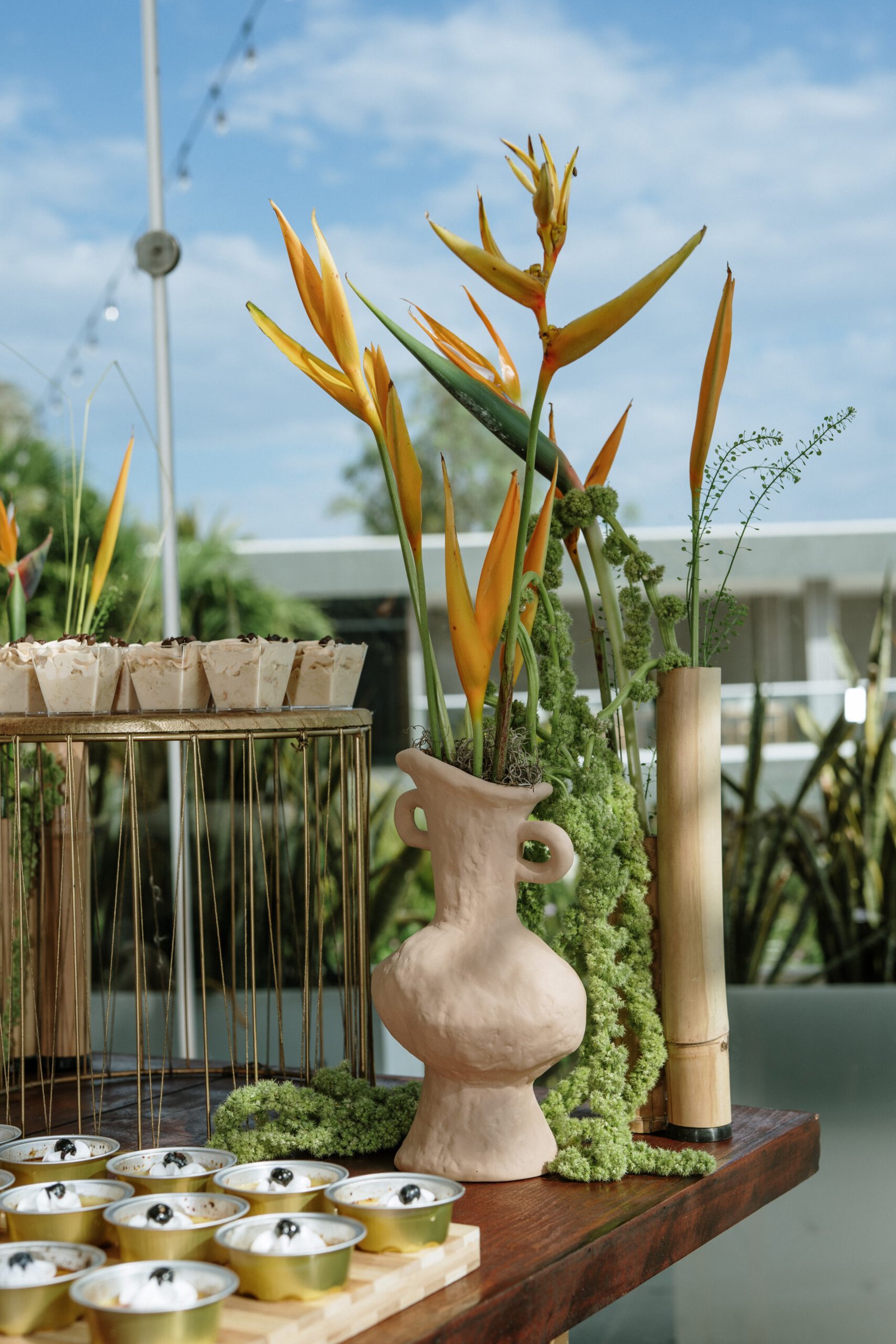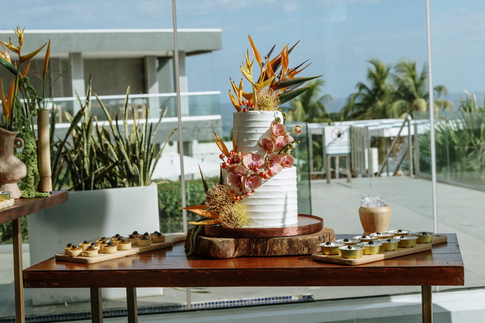 We leaned into the natural scale of tropical elements to build visual weight in all the right places oversized installations, grounded table moments, and a sweetheart area that felt both bold and organic. The goal wasn’t to fill the space, but to let it breathe with purpose. As sunset hit the cliffs, the palette softened, and the whole setting took on a glow that made the tropicals feel editorial.