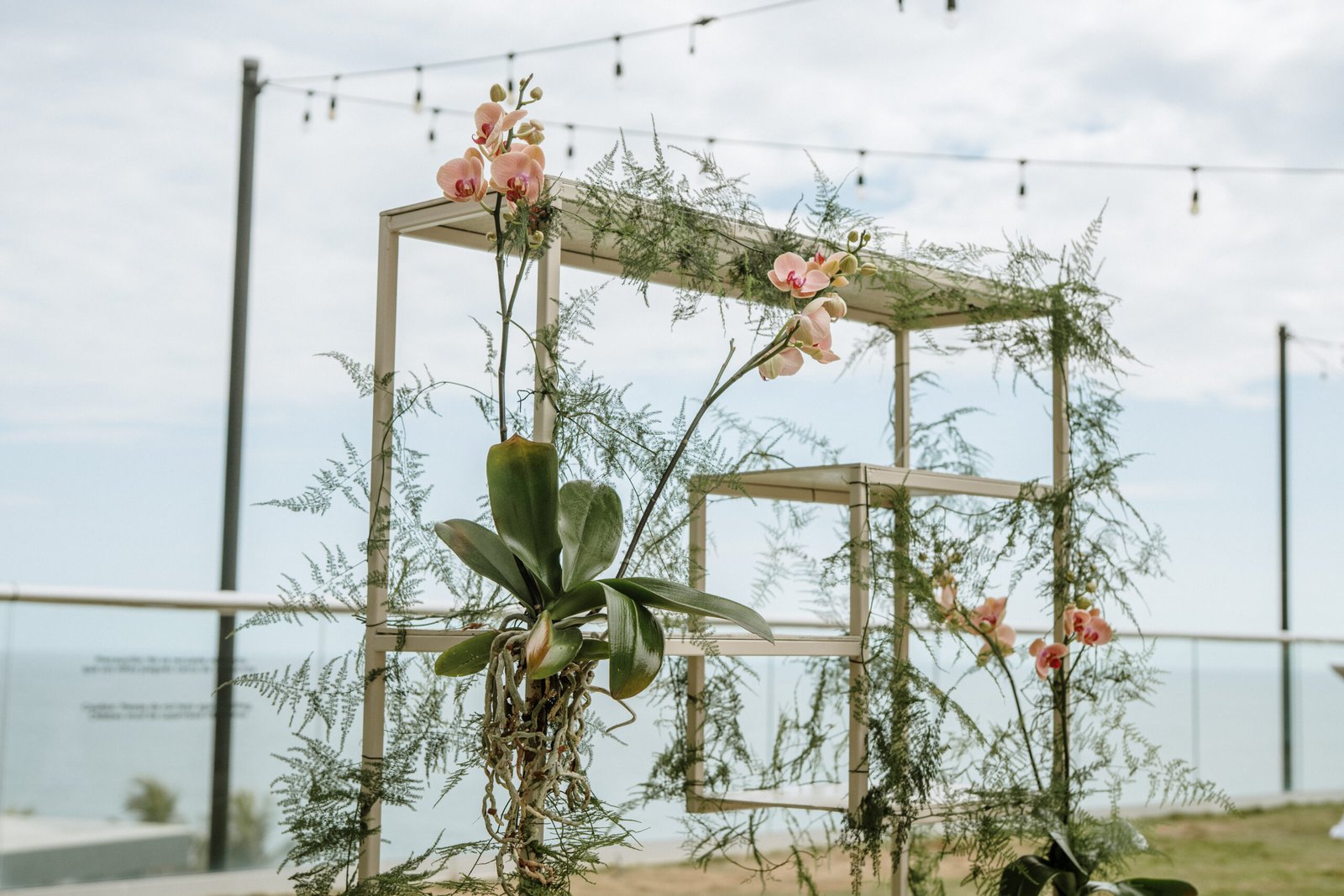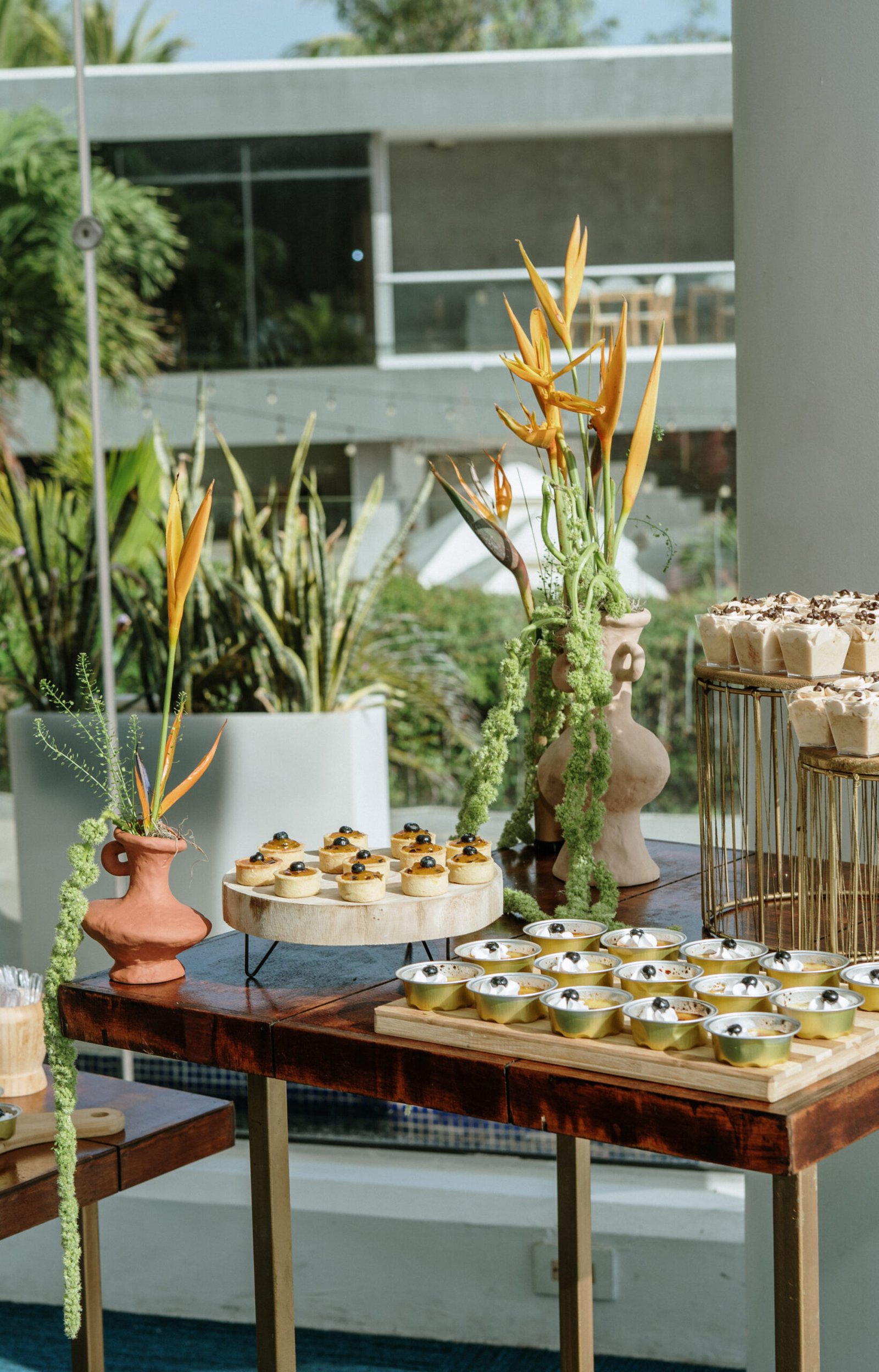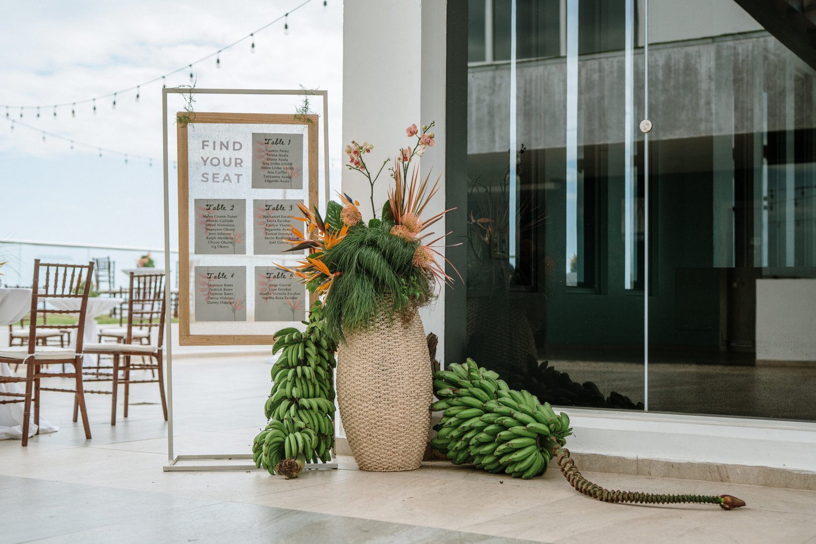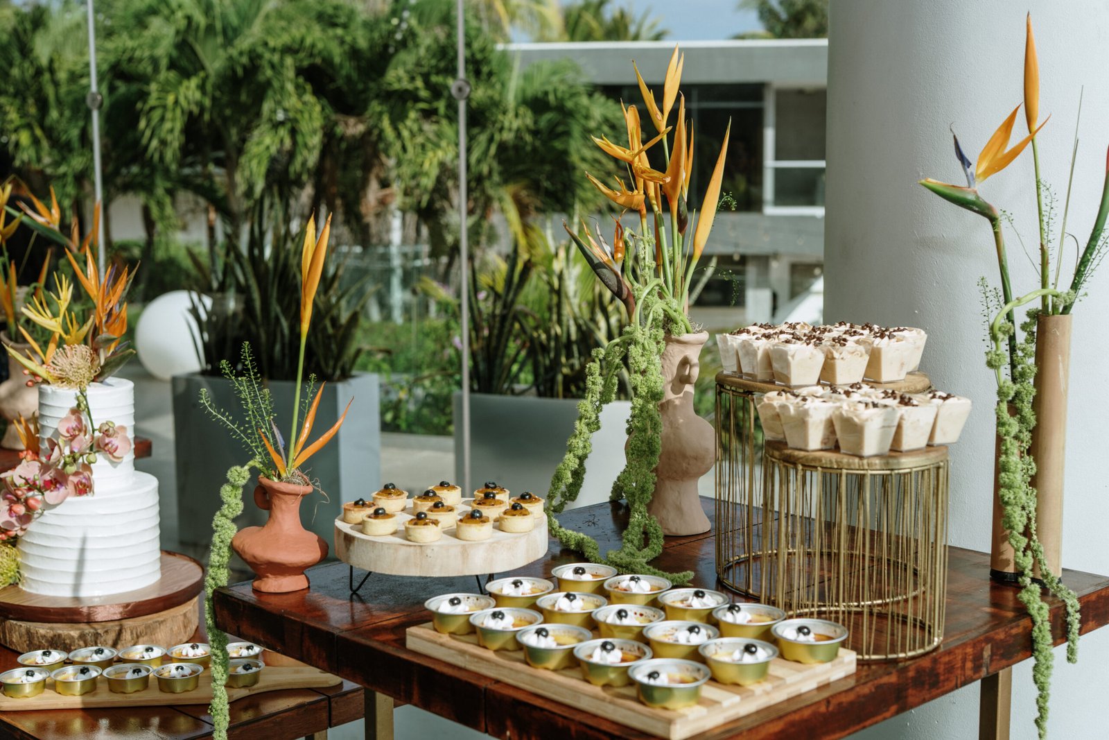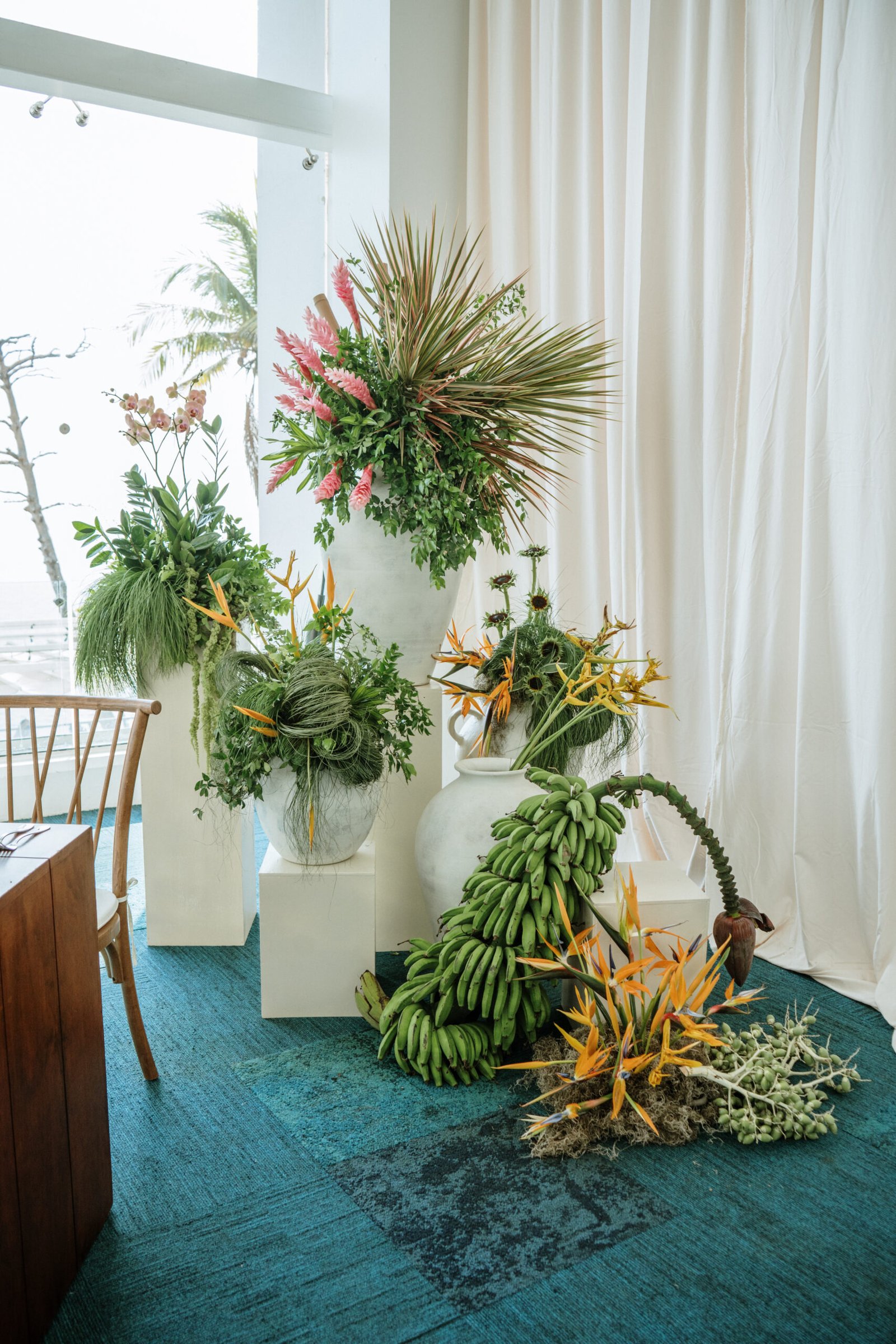 We leaned into the natural scale of tropical elements to build visual weight in all the right places oversized installations, grounded table moments, and a sweetheart area that felt both bold and organic. The goal wasn’t to fill the space, but to let it breathe with purpose. As sunset hit the cliffs, the palette softened, and the whole setting took on a glow that made the tropicals feel editorial.