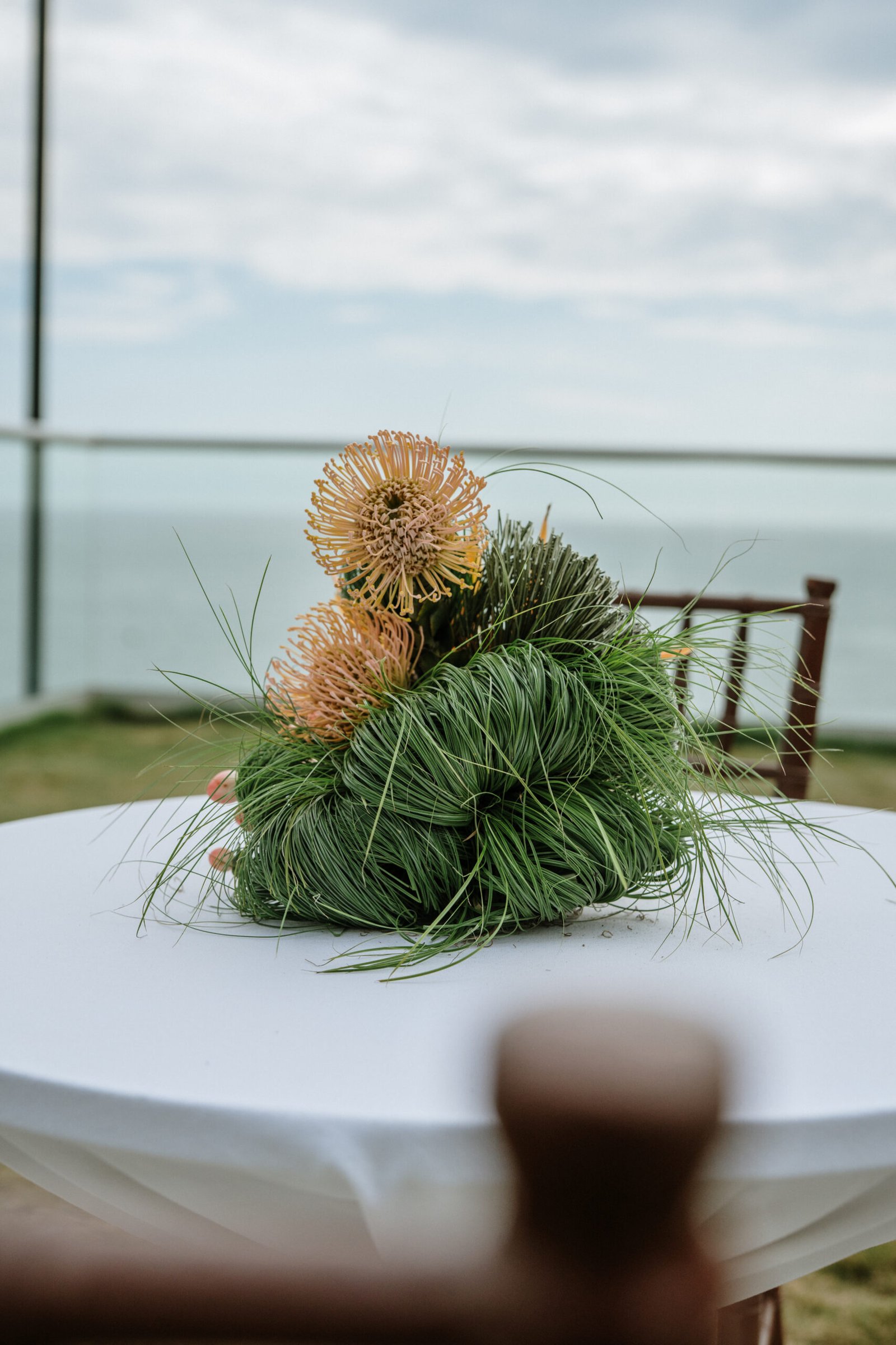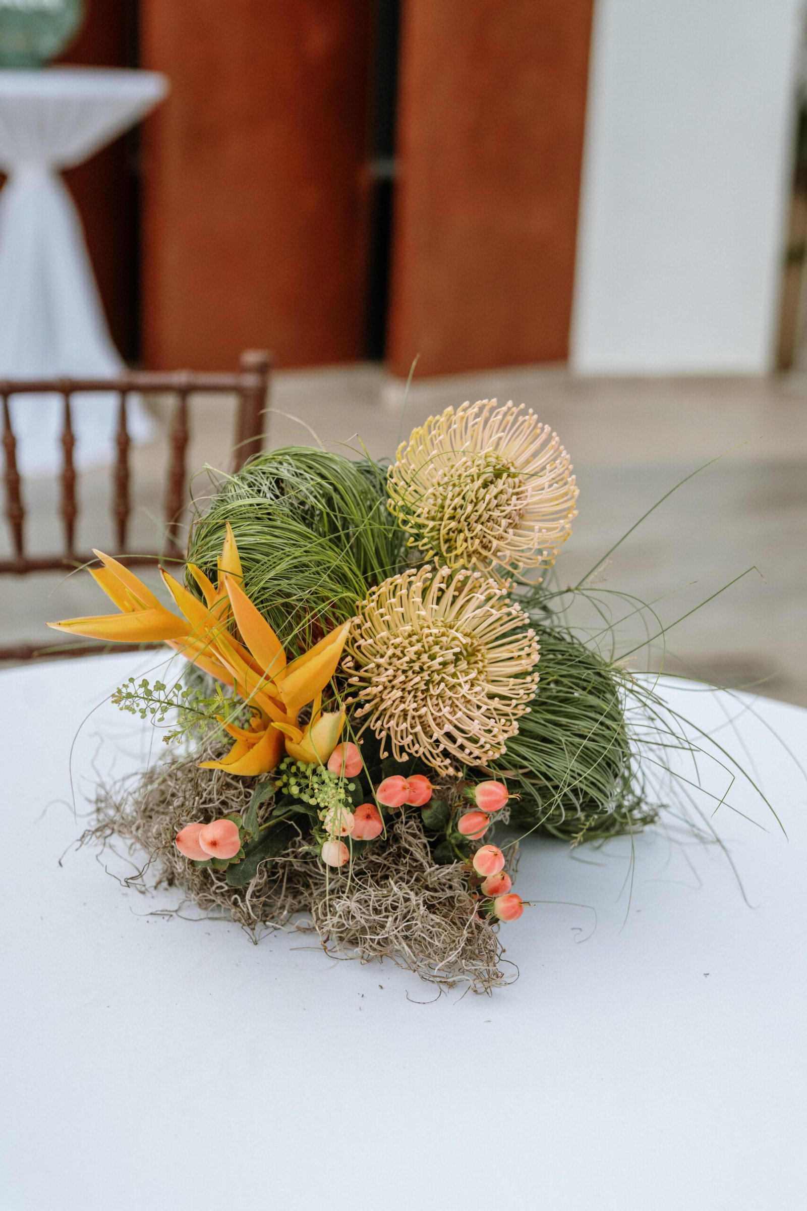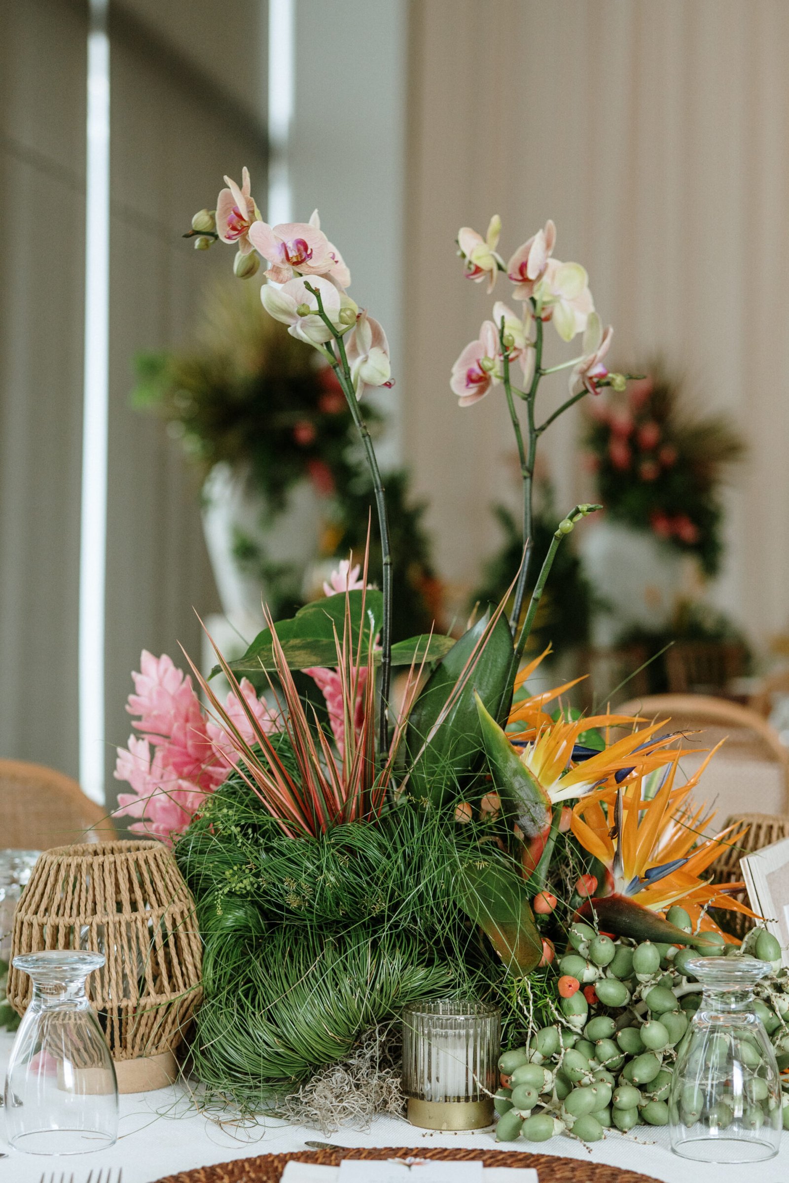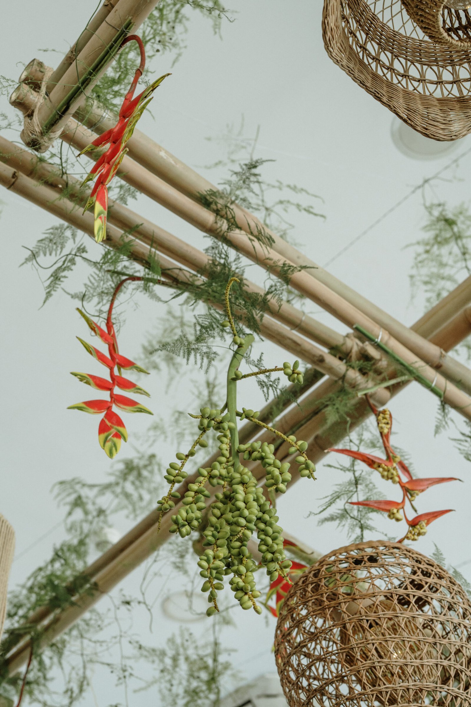 This wedding design explored volume through foliage. It wasn’t about abundance it was about shape! The look was lush but intentional: braided greens, sculptural heliconias, and textured compositions that added air and movement instead of clutter.