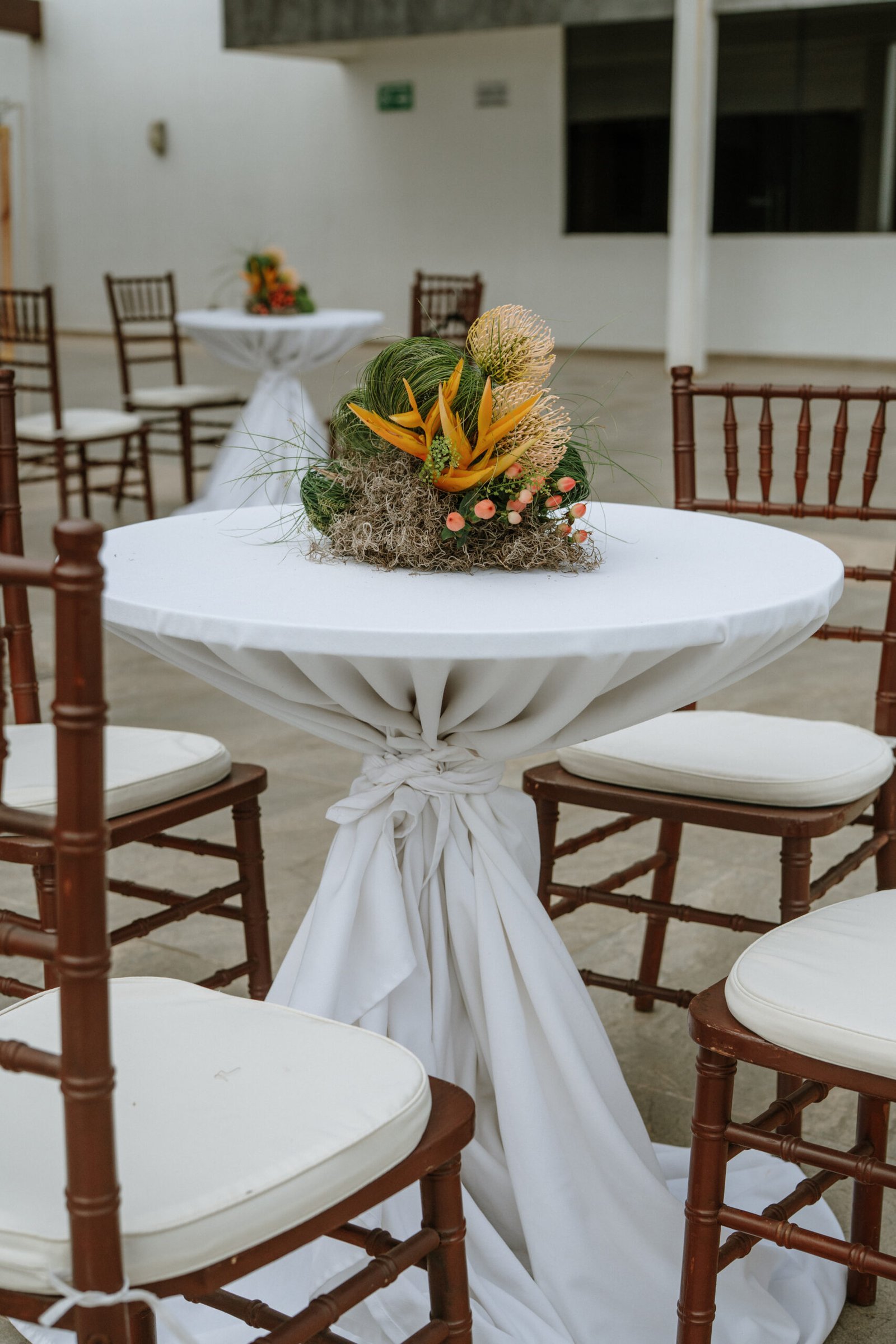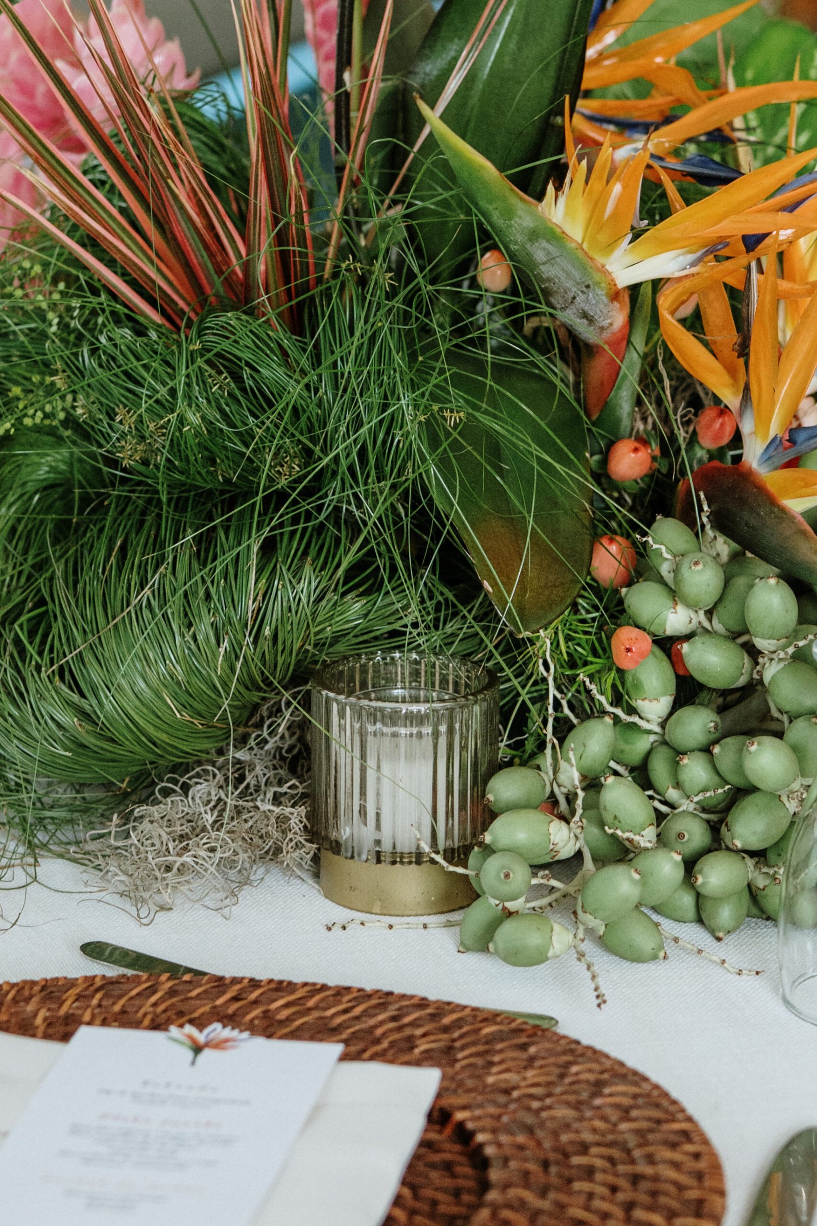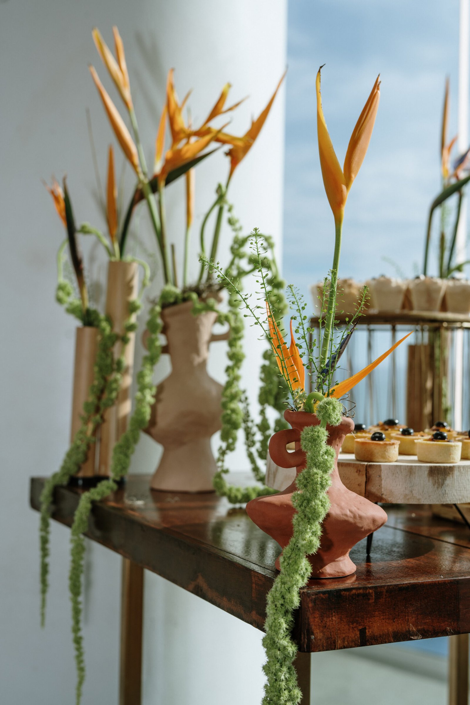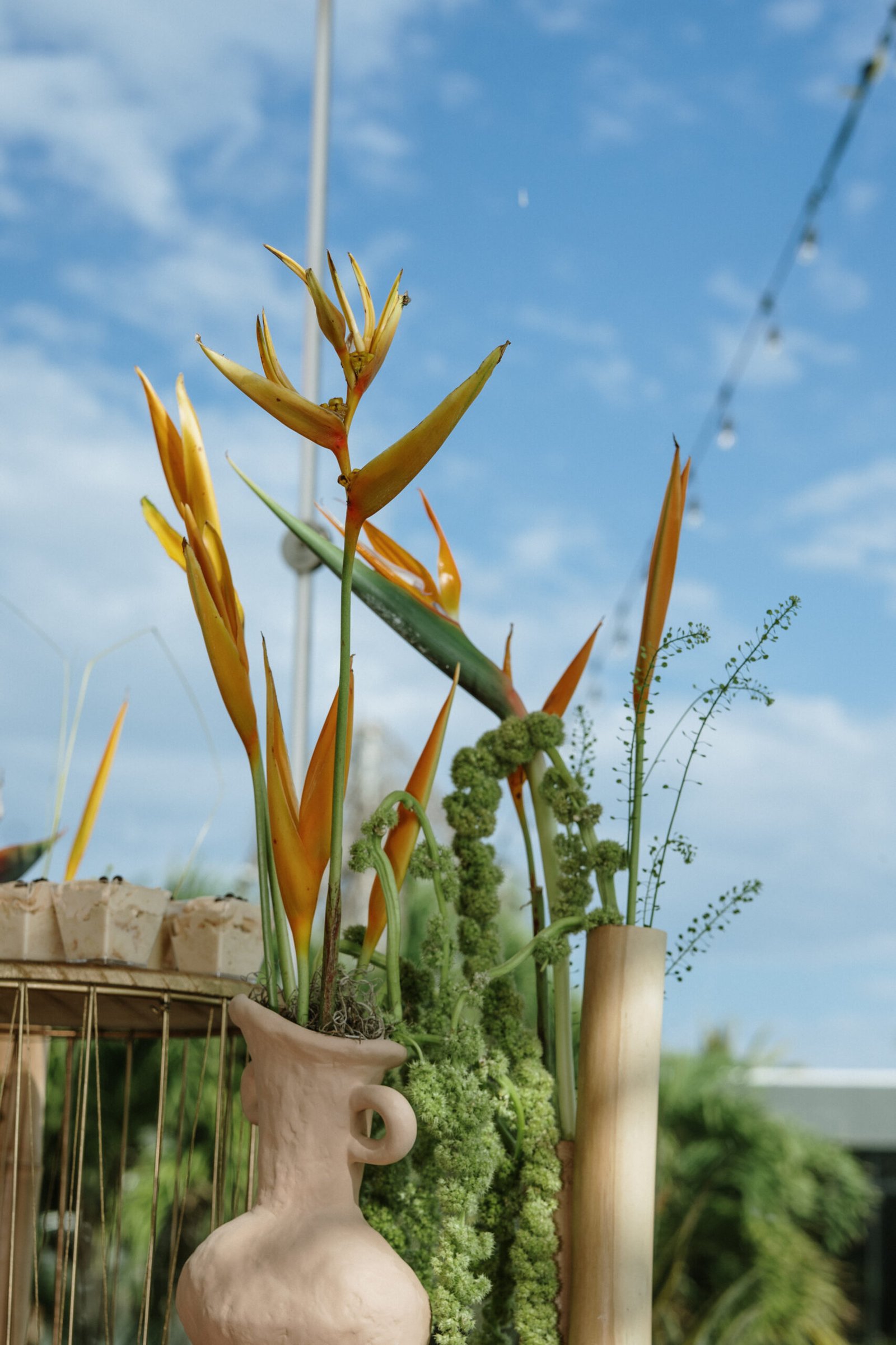 This wedding design explored volume through foliage. It wasn’t about abundance it was about shape! The look was lush but intentional: braided greens, sculptural heliconias, and textured compositions that added air and movement instead of clutter.