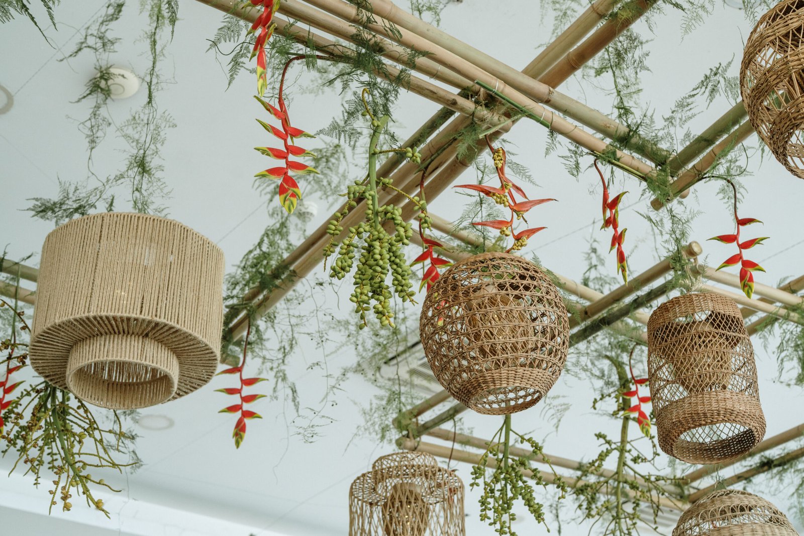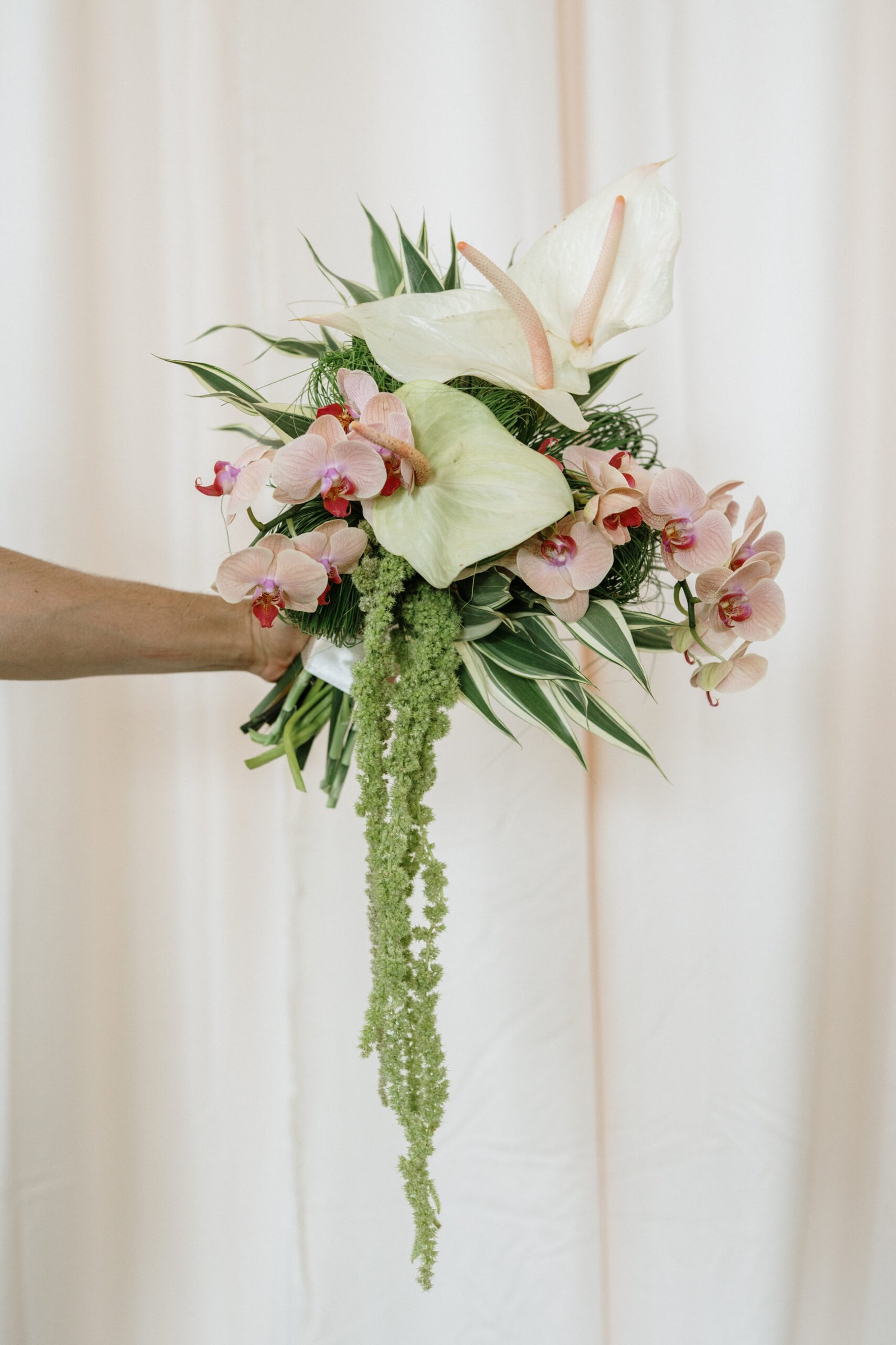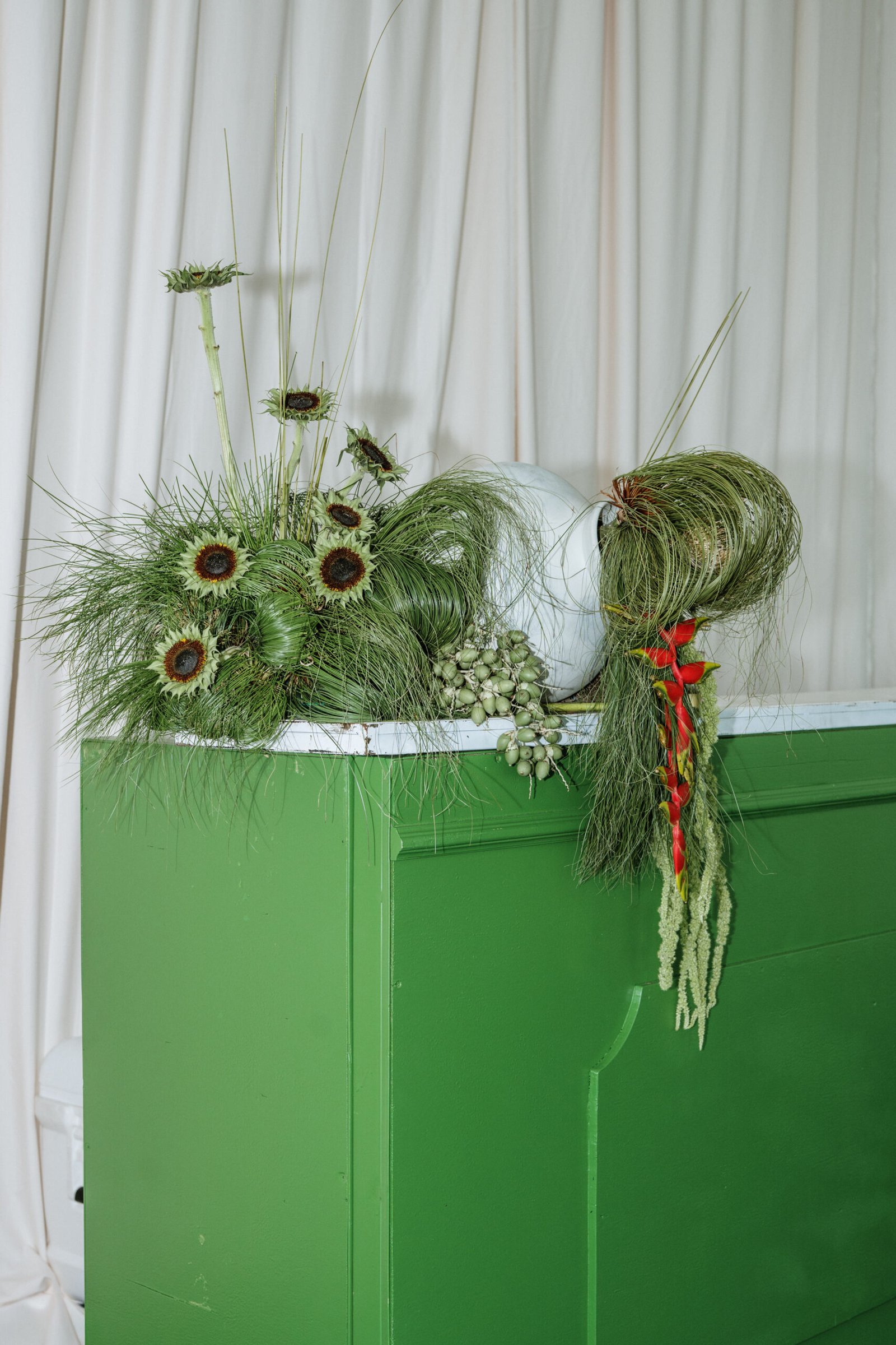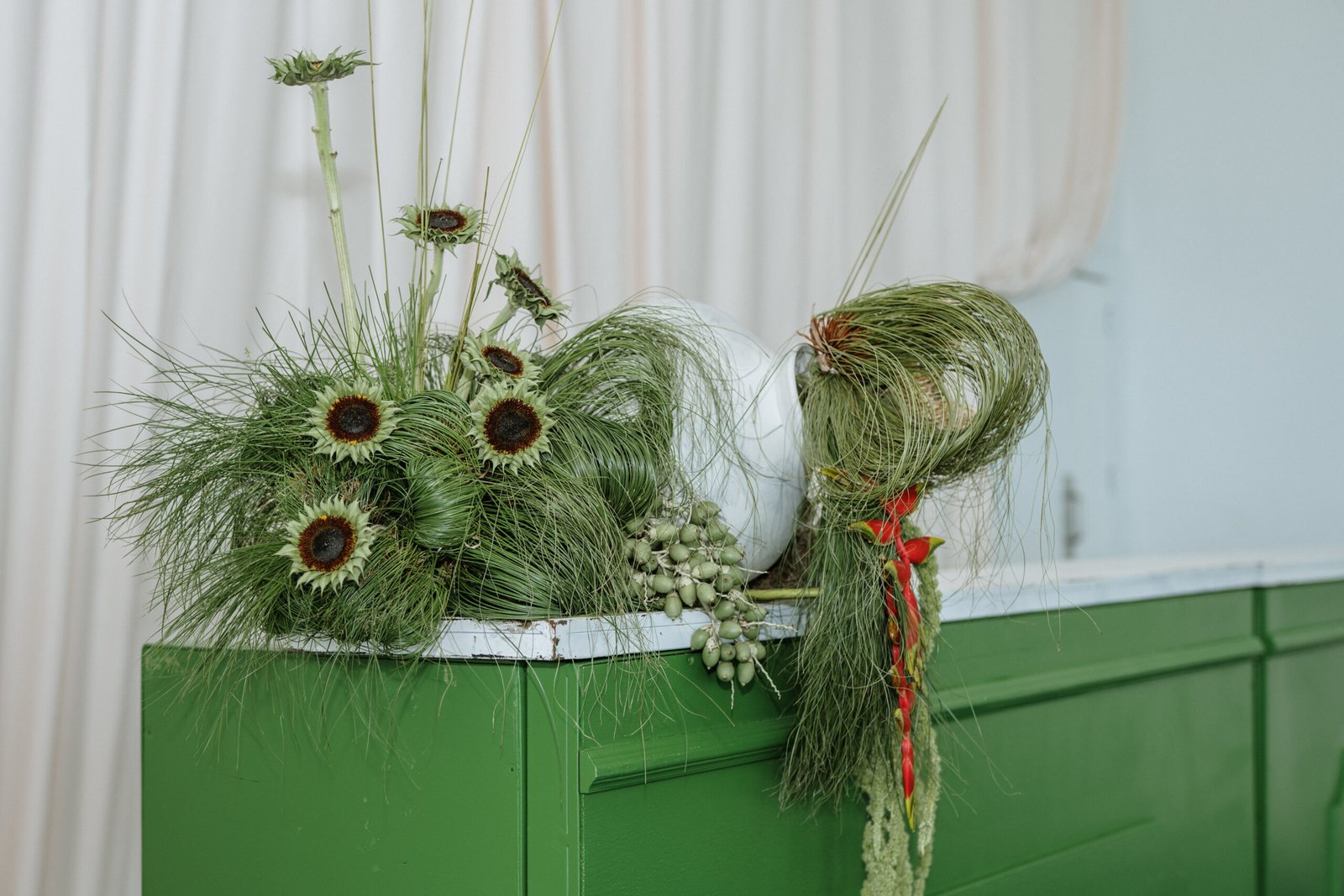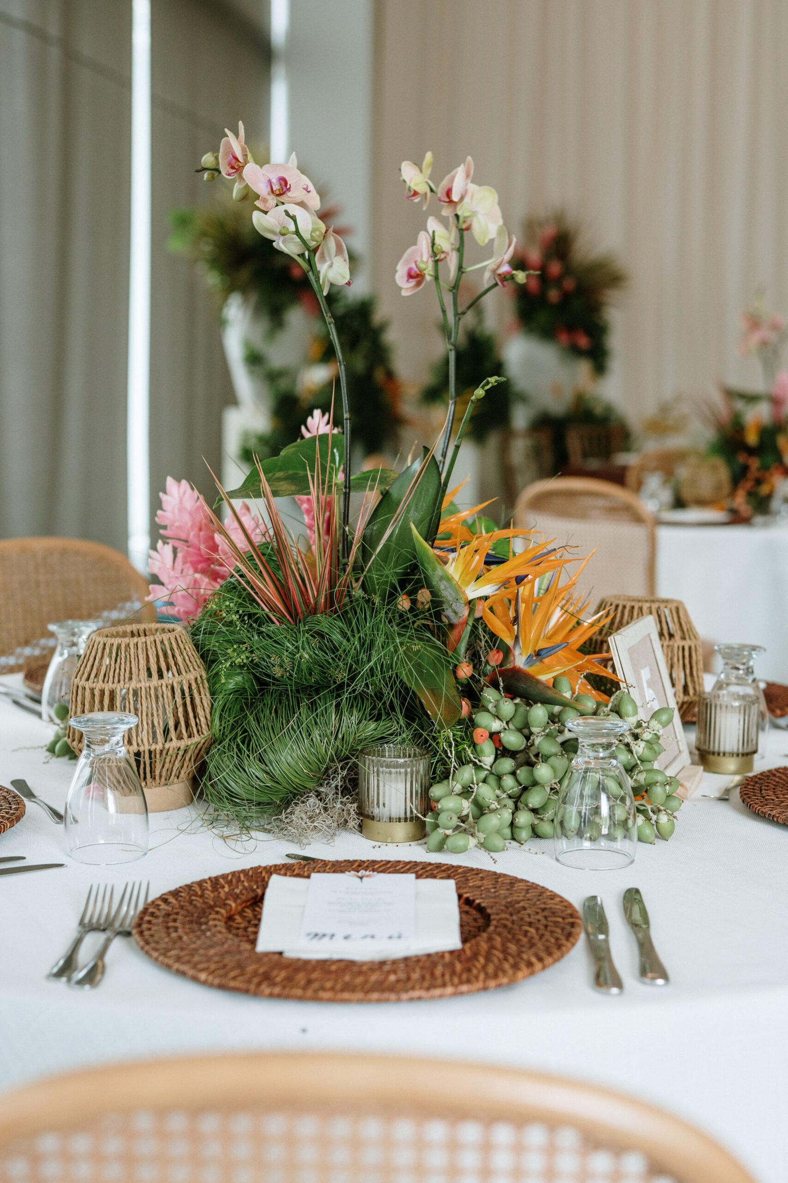 This wedding design explored volume through foliage. It wasn’t about abundance it was about shape! The look was lush but intentional: braided greens, sculptural heliconias, and textured compositions that added air and movement instead of clutter.