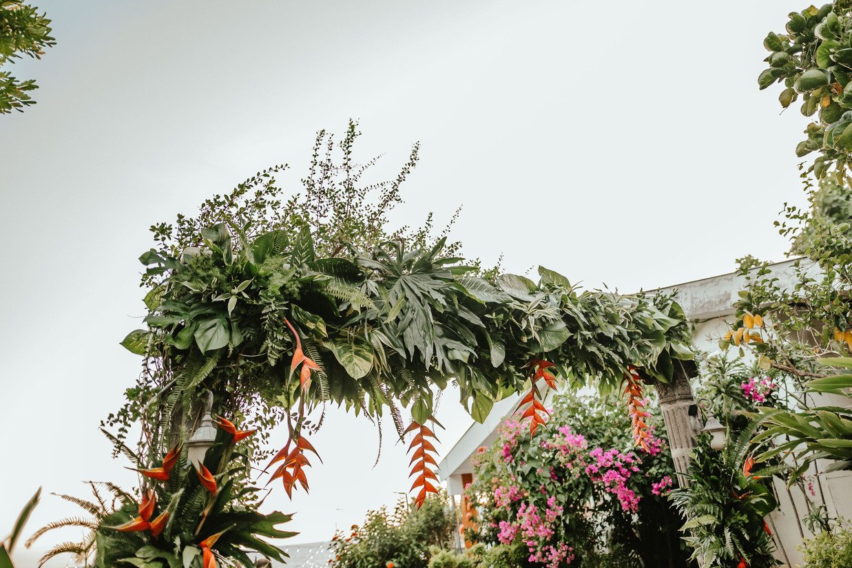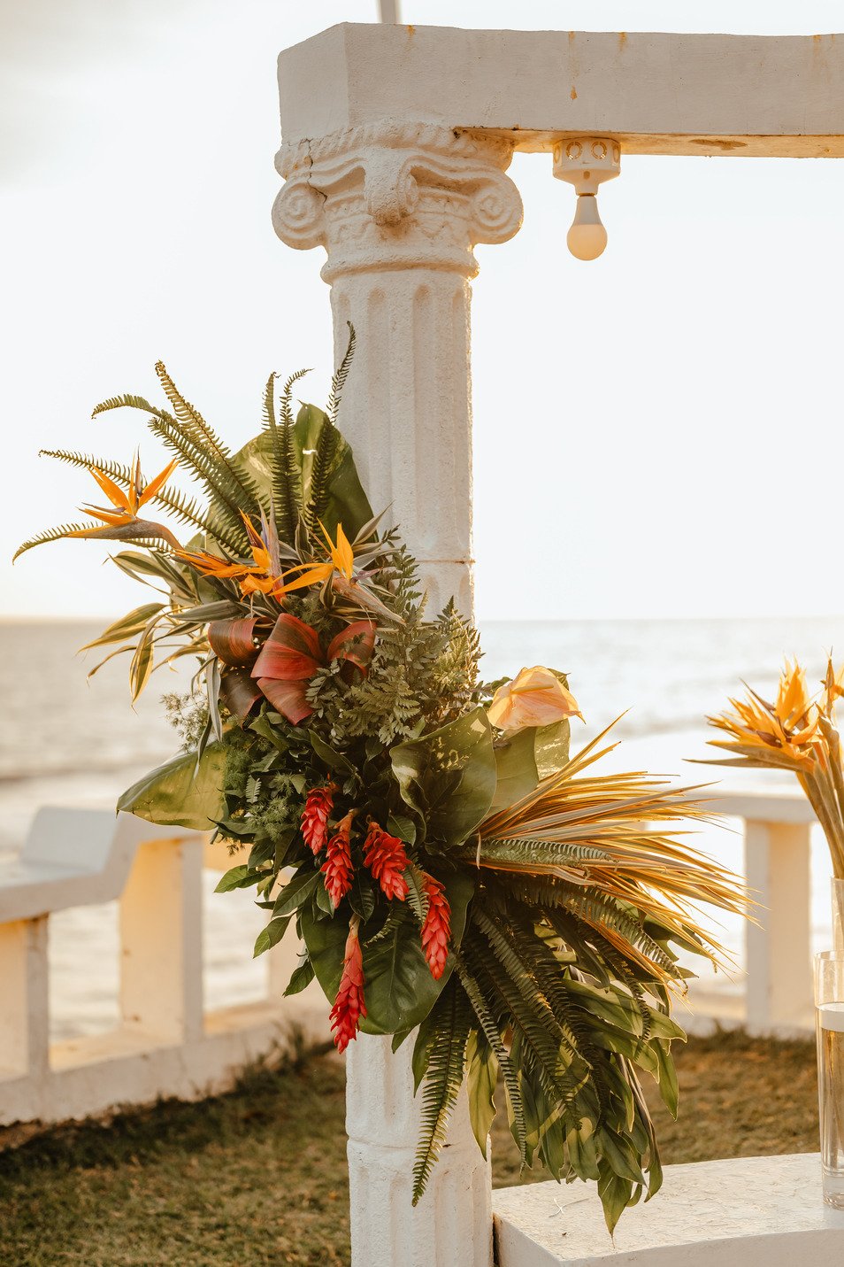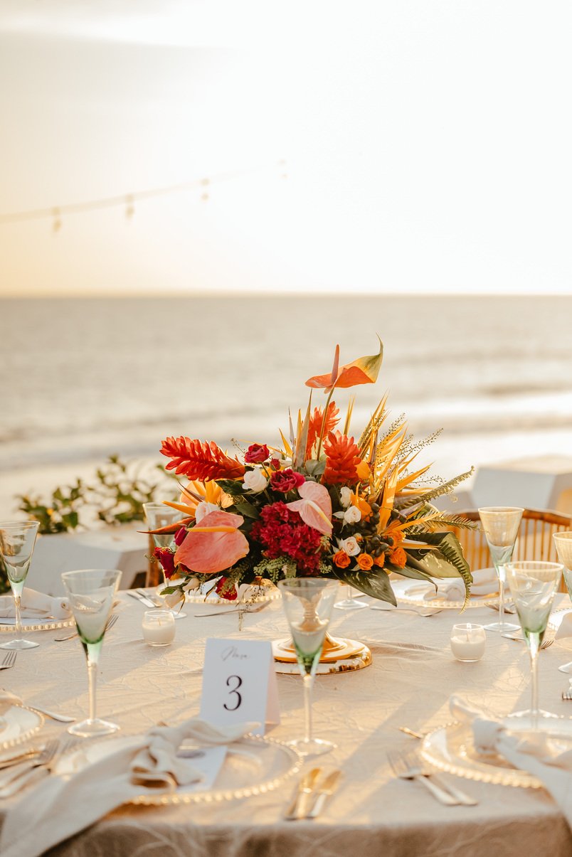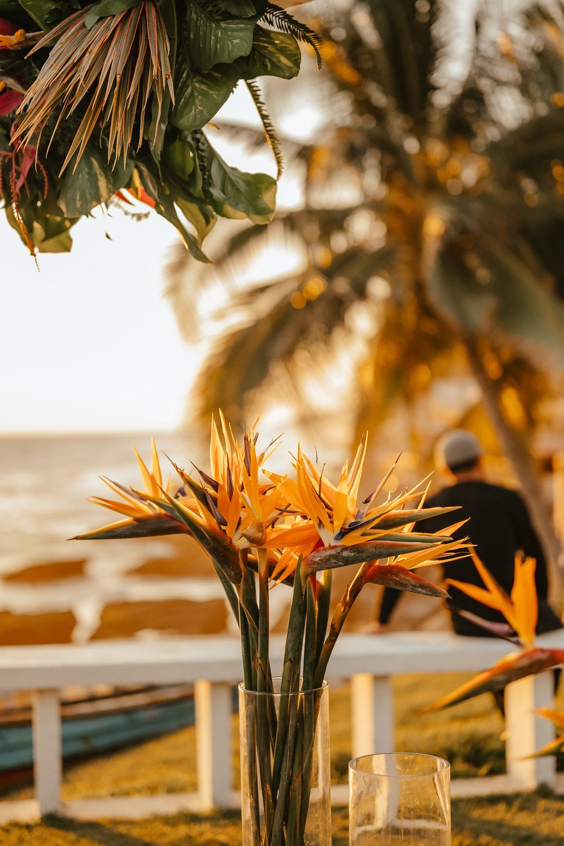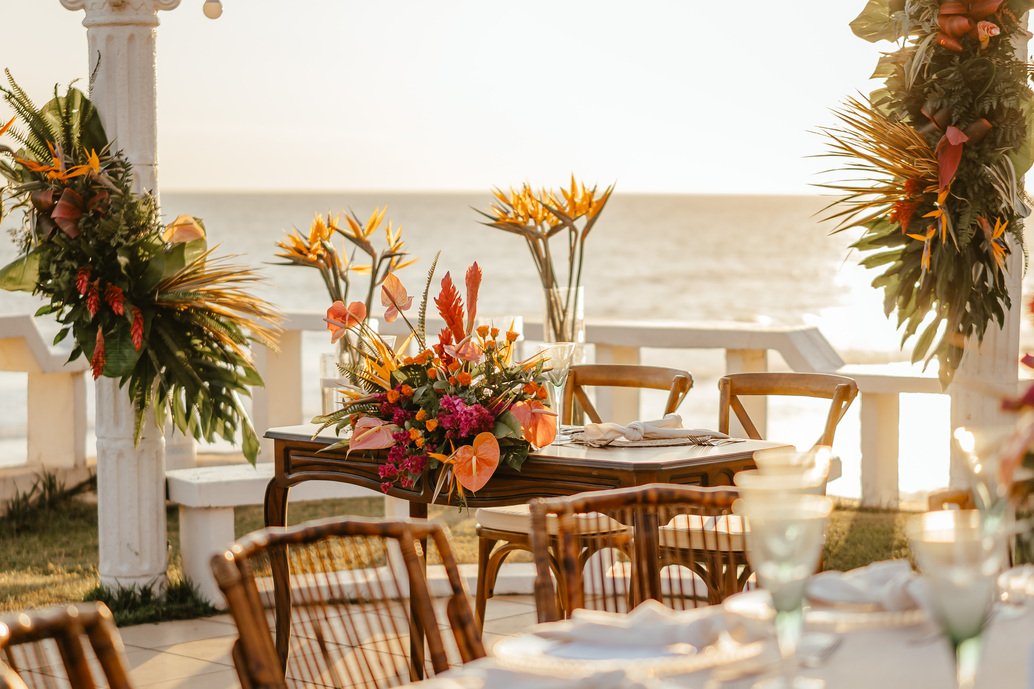 The floral proposal for EU & Alejandro’s seaside wedding was built around the sunset itself. Tropical textures met romantic blooms in a palette designed to melt into the horizon—vibrant, yet soft. From hanging heliconias to bright anthuriums and bougainvillea accents, each element was chosen to echo the warmth of the ocean light and the couple’s love for color, celebration, and beauty in motion.