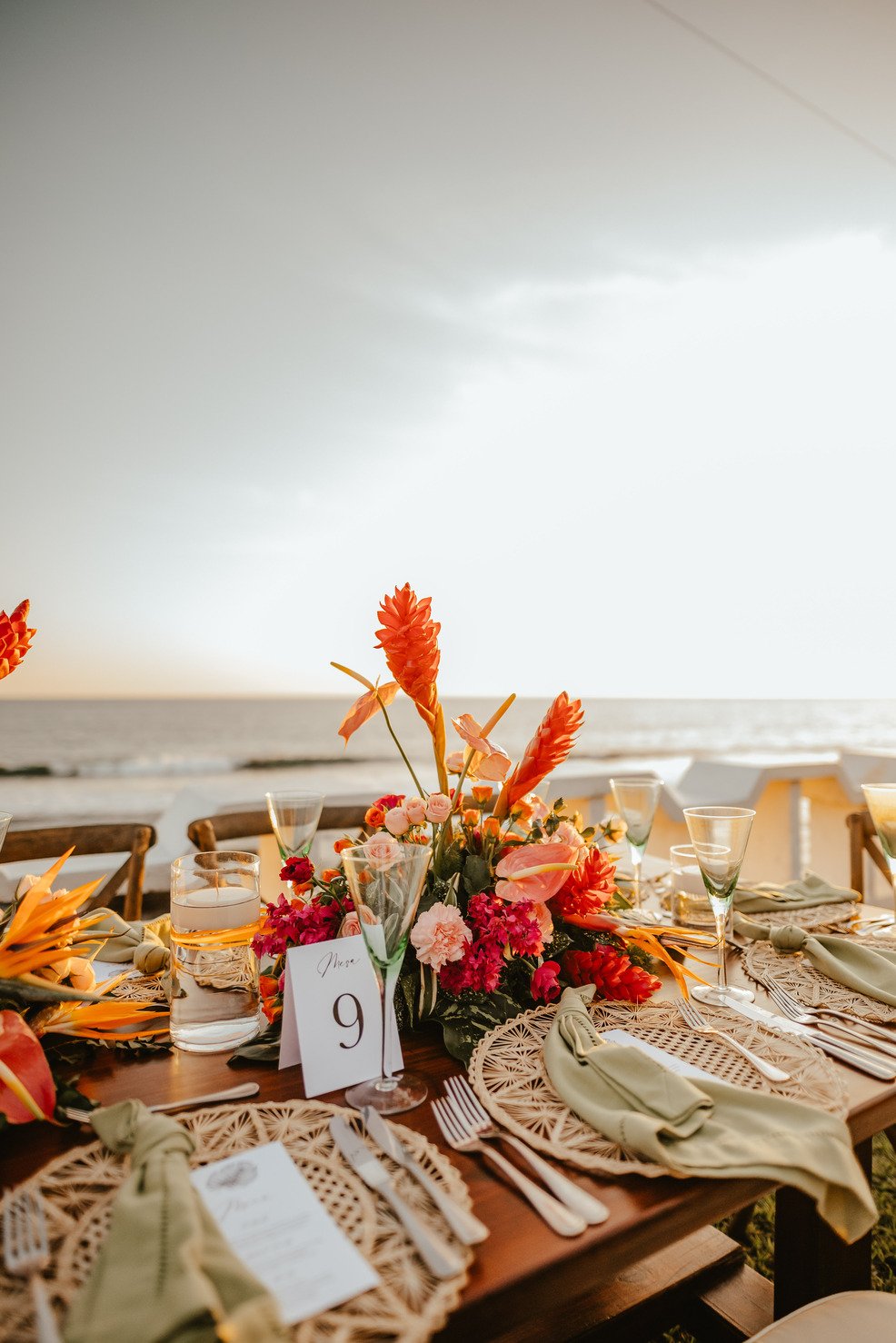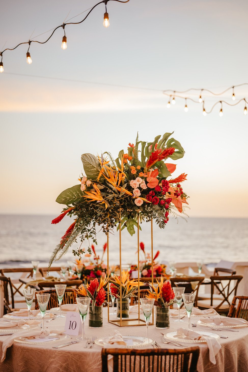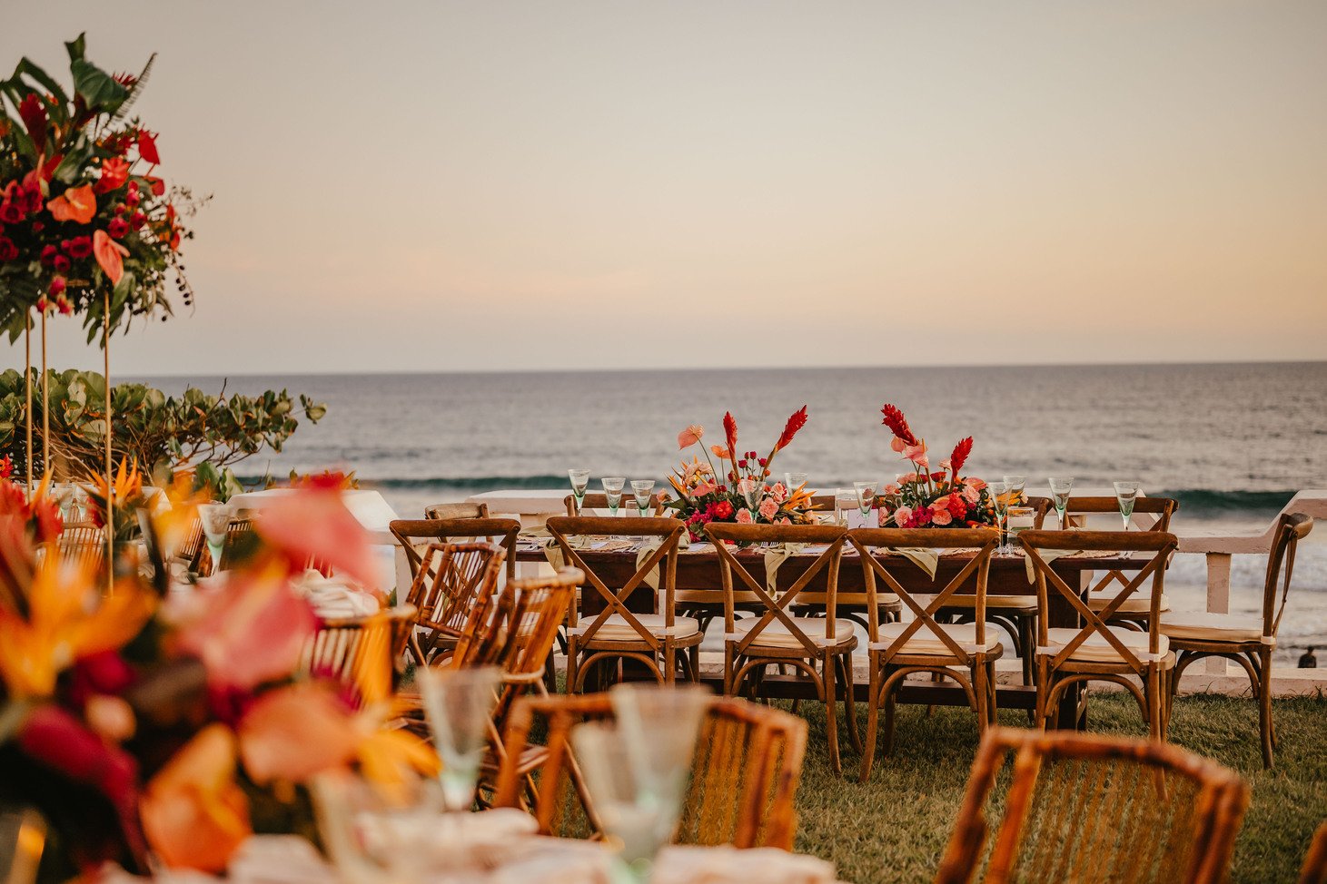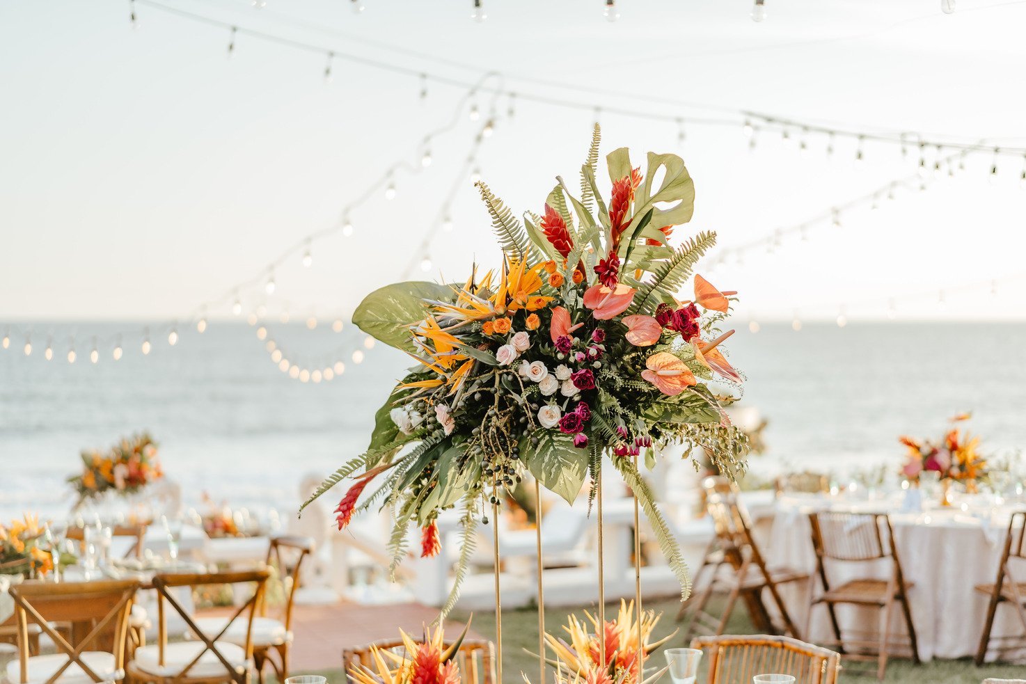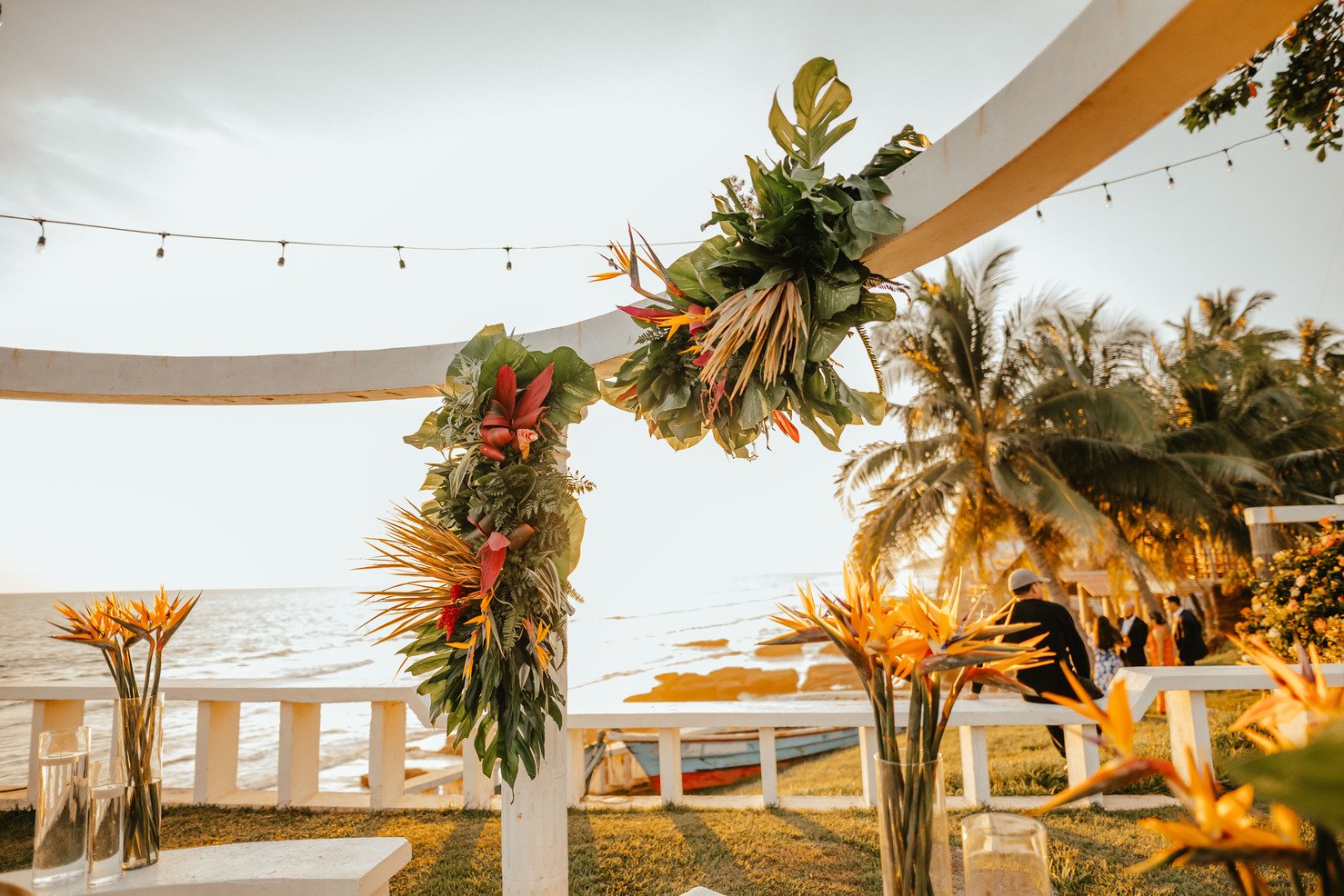 The floral proposal for EU & Alejandro’s seaside wedding was built around the sunset itself. Tropical textures met romantic blooms in a palette designed to melt into the horizon—vibrant, yet soft. From hanging heliconias to bright anthuriums and bougainvillea accents, each element was chosen to echo the warmth of the ocean light and the couple’s love for color, celebration, and beauty in motion.