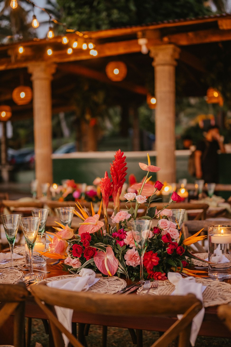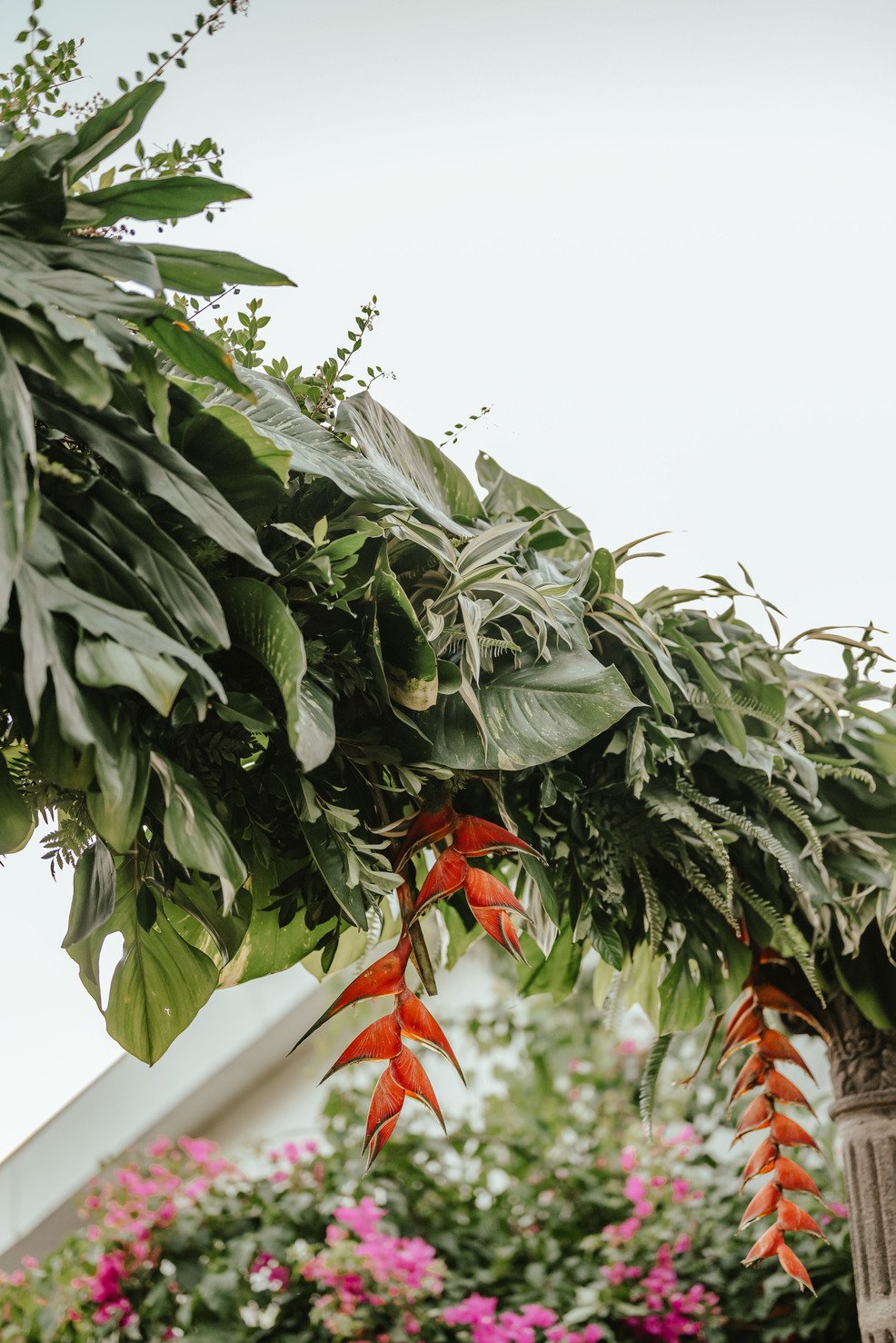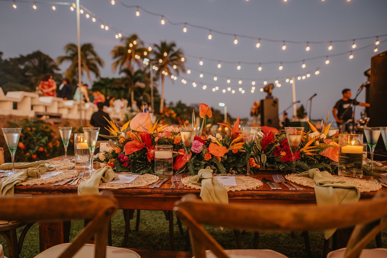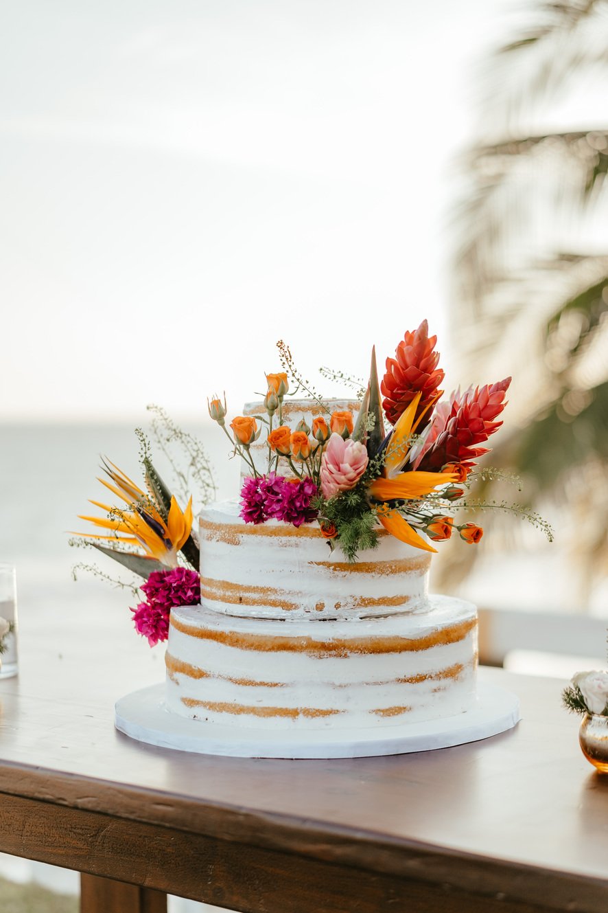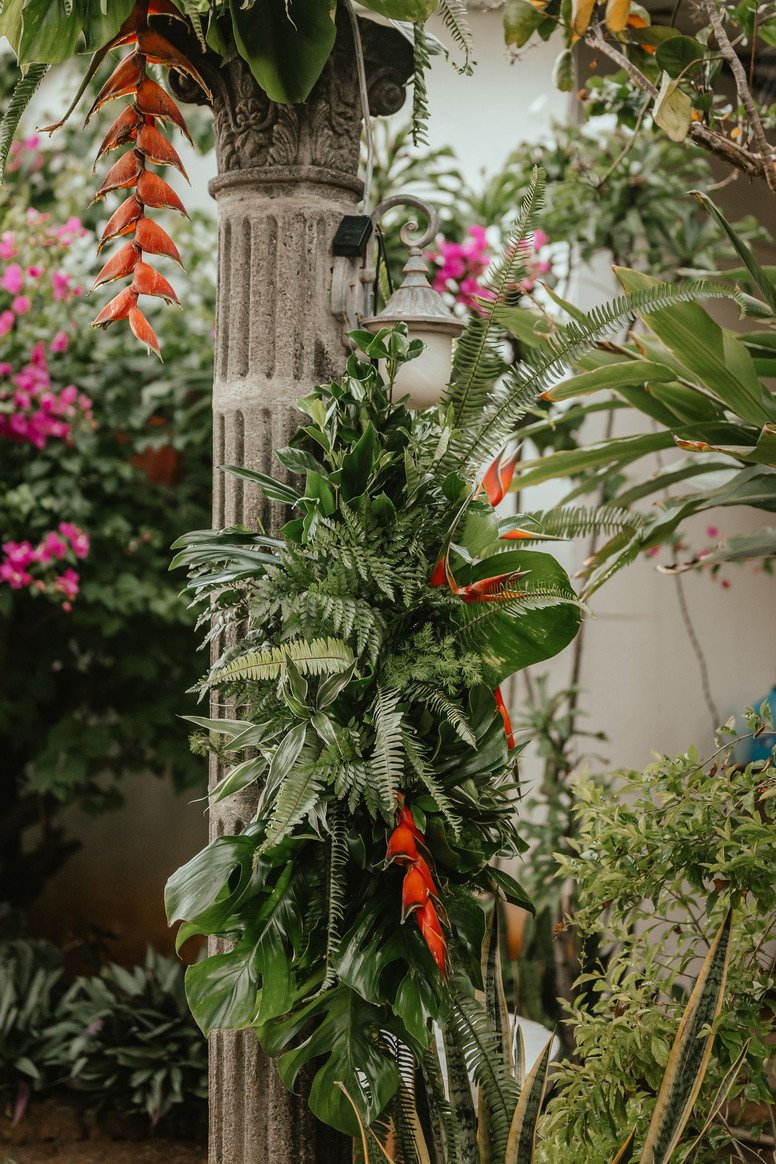 The floral proposal for EU & Alejandro’s seaside wedding was built around the sunset itself. Tropical textures met romantic blooms in a palette designed to melt into the horizon—vibrant, yet soft. From hanging heliconias to bright anthuriums and bougainvillea accents, each element was chosen to echo the warmth of the ocean light and the couple’s love for color, celebration, and beauty in motion.