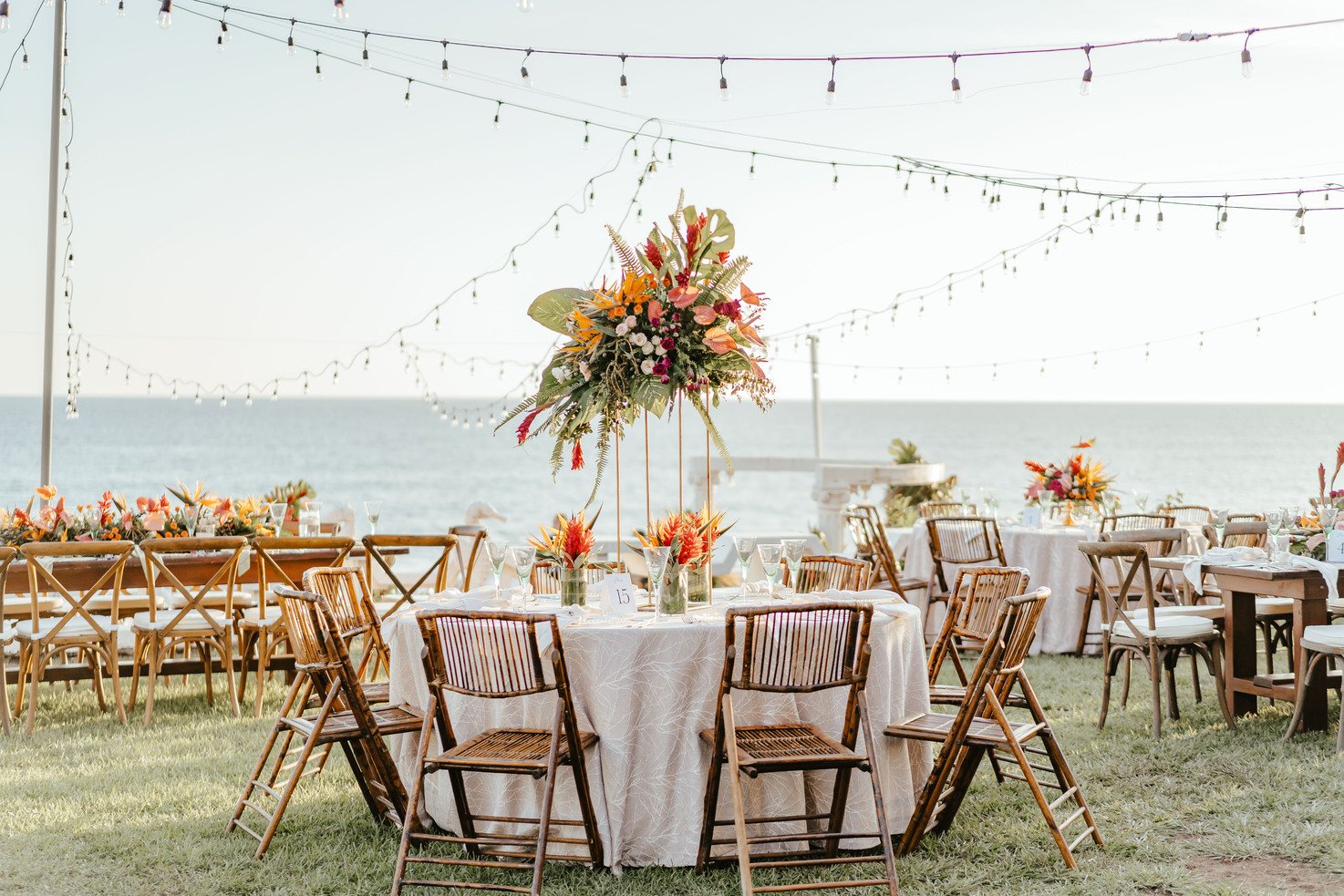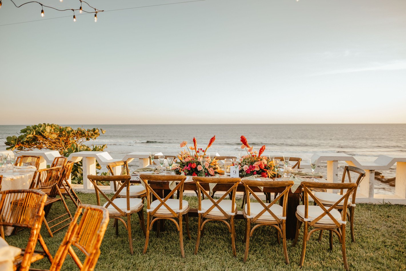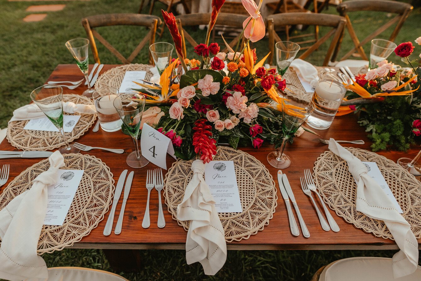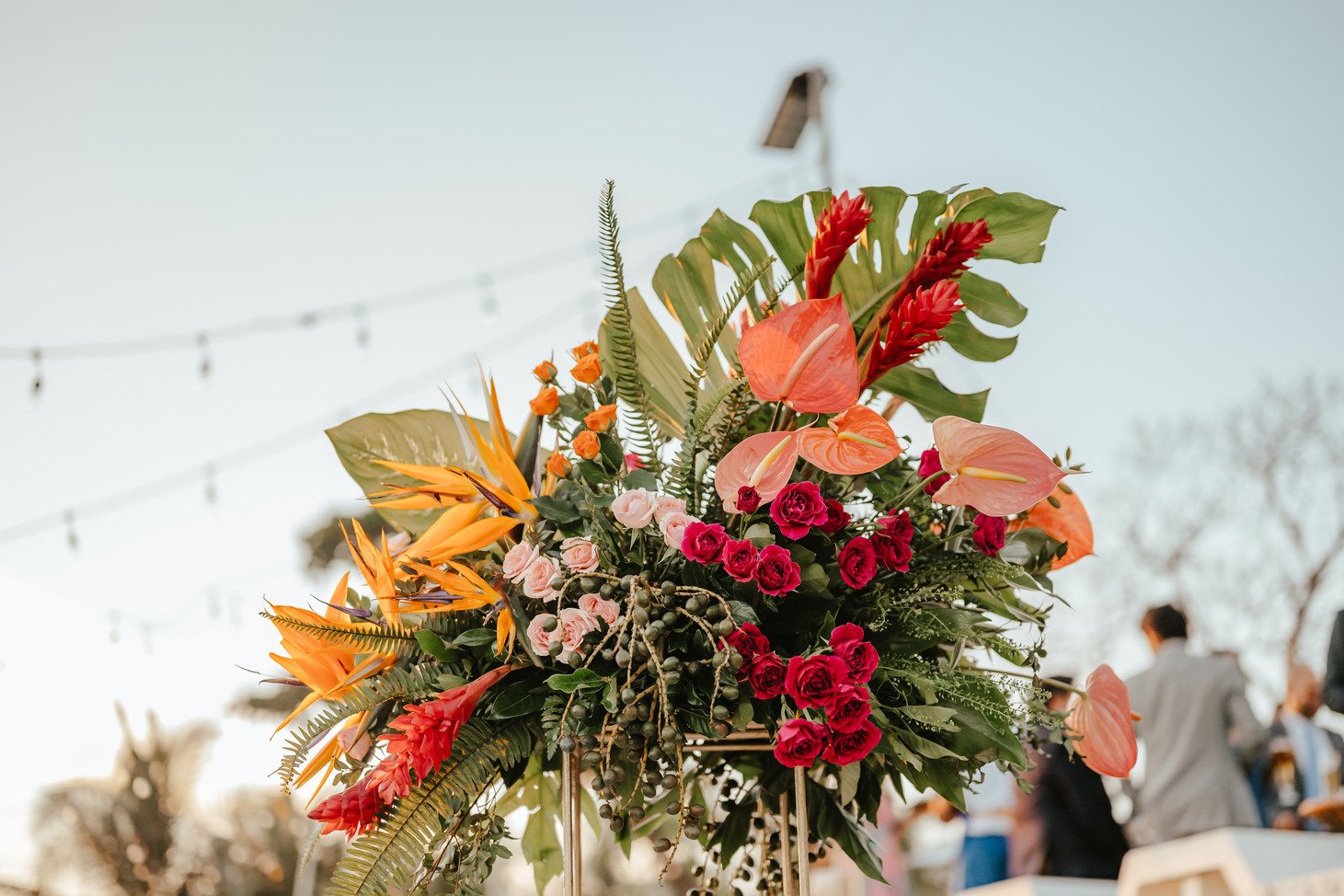 The floral proposal for EU & Alejandro’s seaside wedding was built around the sunset itself. Tropical textures met romantic blooms in a palette designed to melt into the horizon—vibrant, yet soft. From hanging heliconias to bright anthuriums and bougainvillea accents, each element was chosen to echo the warmth of the ocean light and the couple’s love for color, celebration, and beauty in motion.