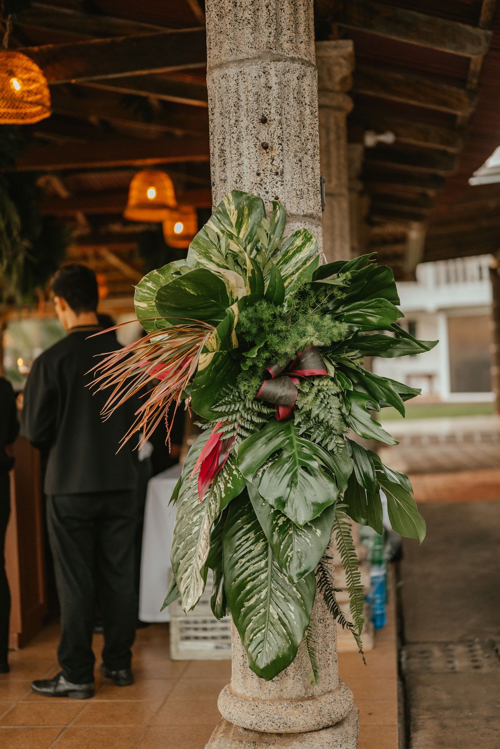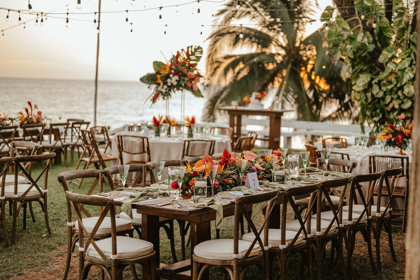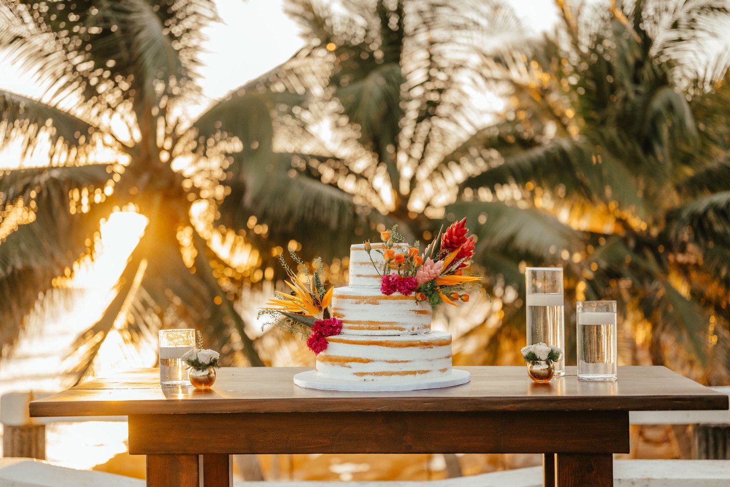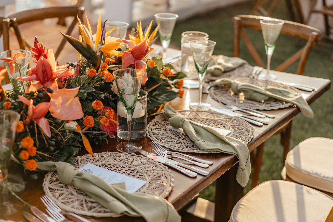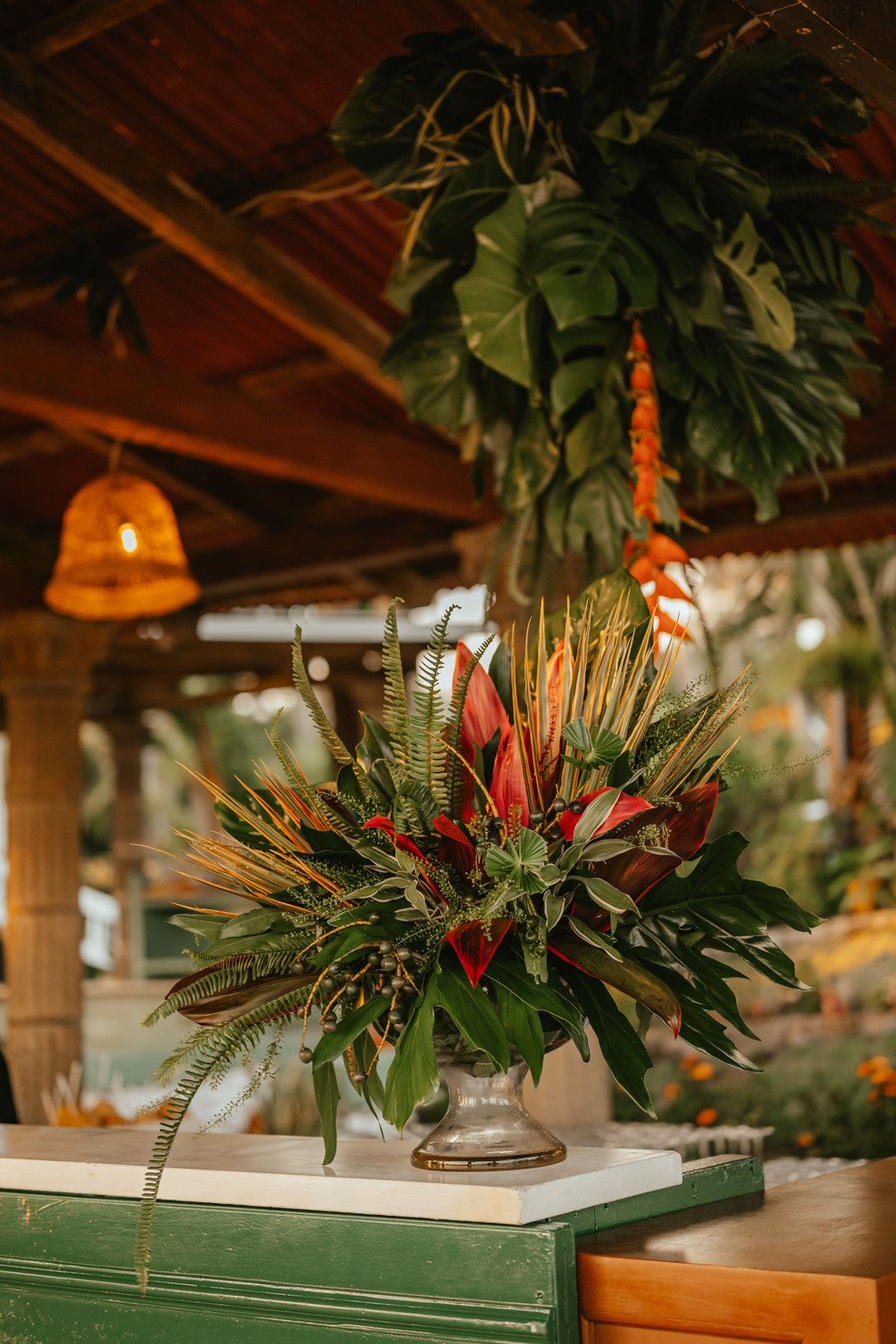 The floral proposal for EU & Alejandro’s seaside wedding was built around the sunset itself. Tropical textures met romantic blooms in a palette designed to melt into the horizon—vibrant, yet soft. From hanging heliconias to bright anthuriums and bougainvillea accents, each element was chosen to echo the warmth of the ocean light and the couple’s love for color, celebration, and beauty in motion.