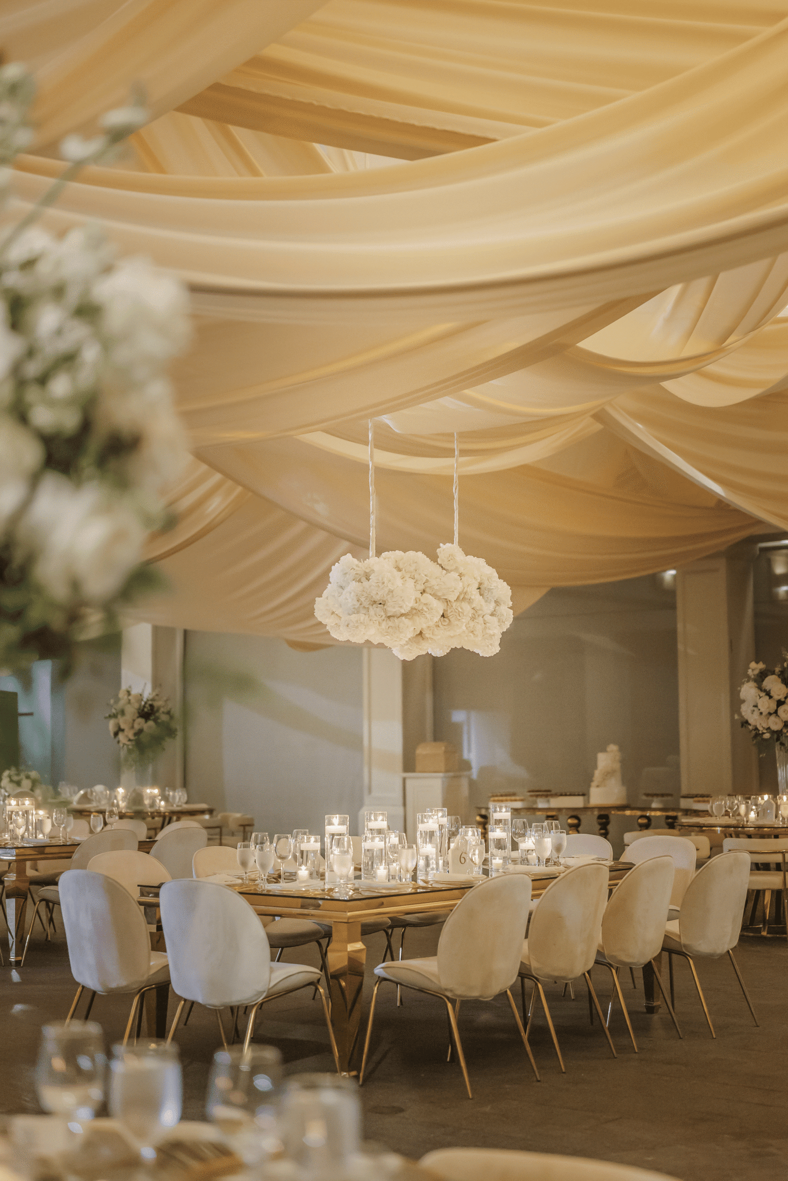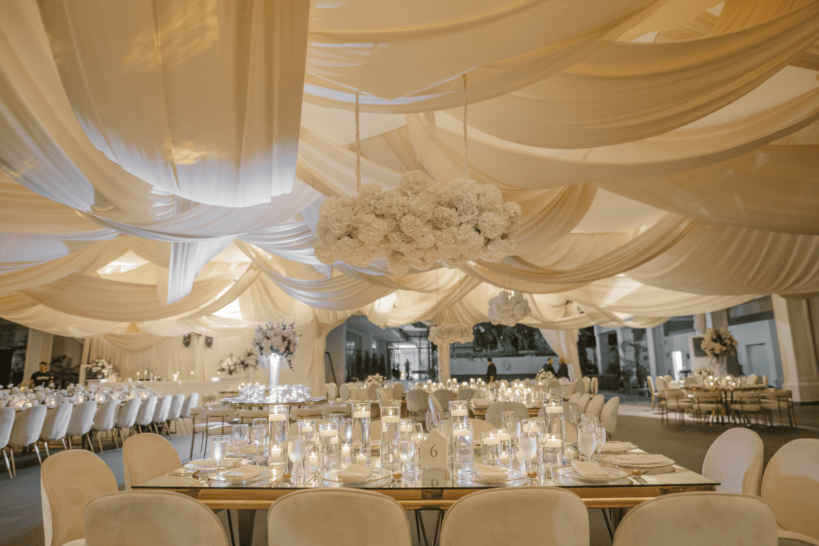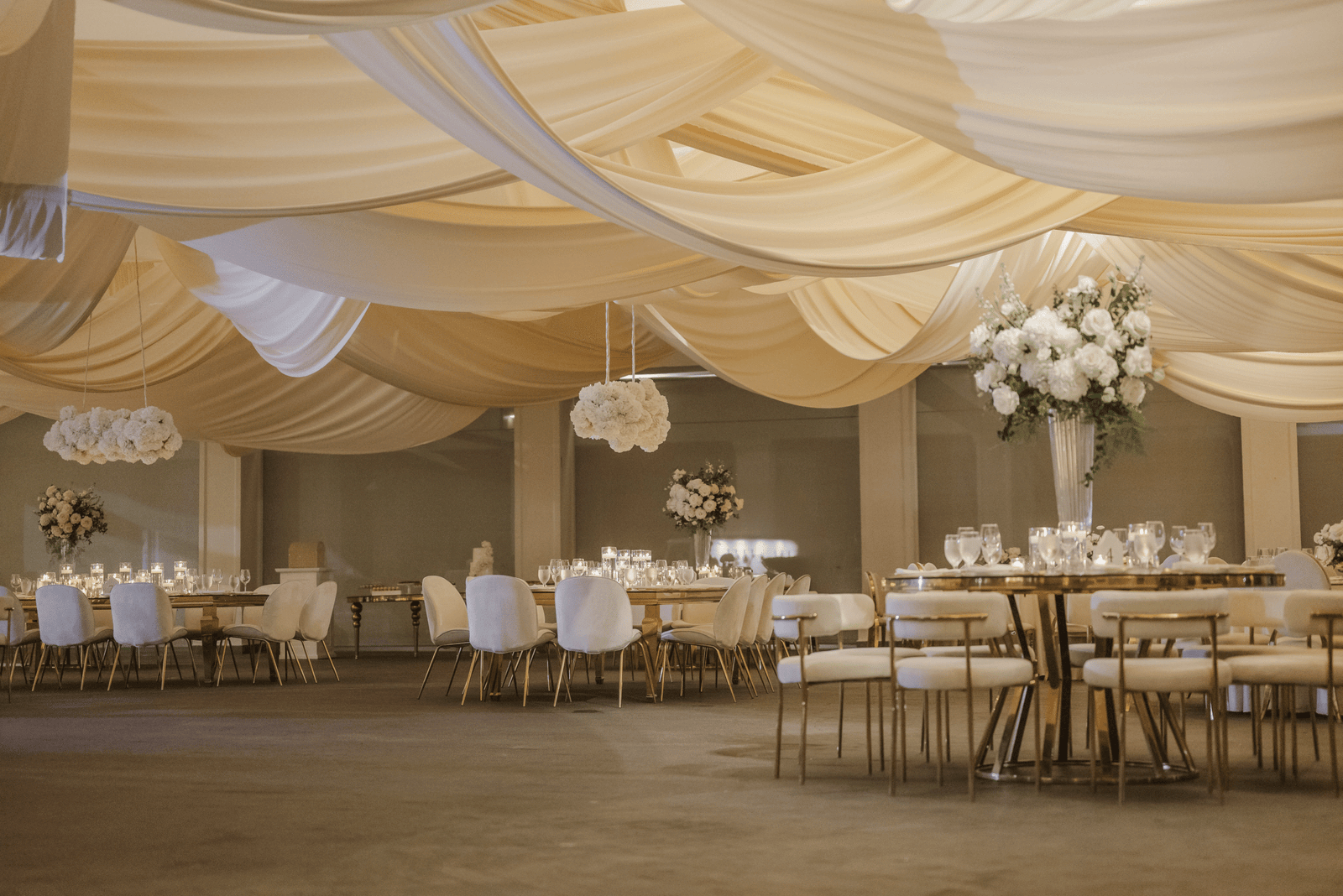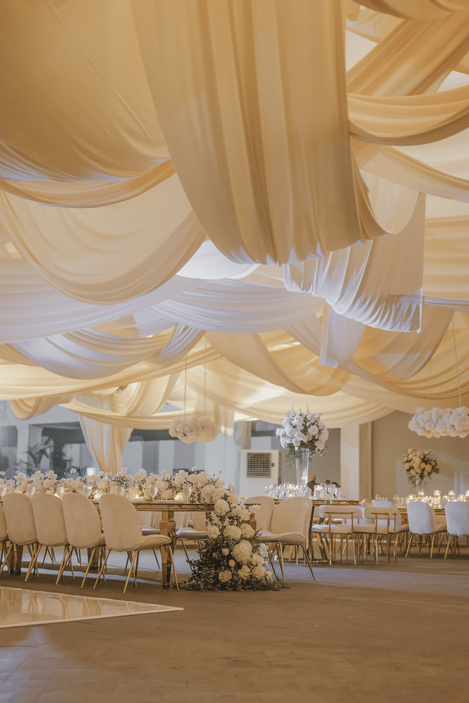The heart of the design was a layered ivory draped ceiling that wrapped the entire venue in movement and warmth, creating a sense of depth and light that transformed the atmosphere completely.