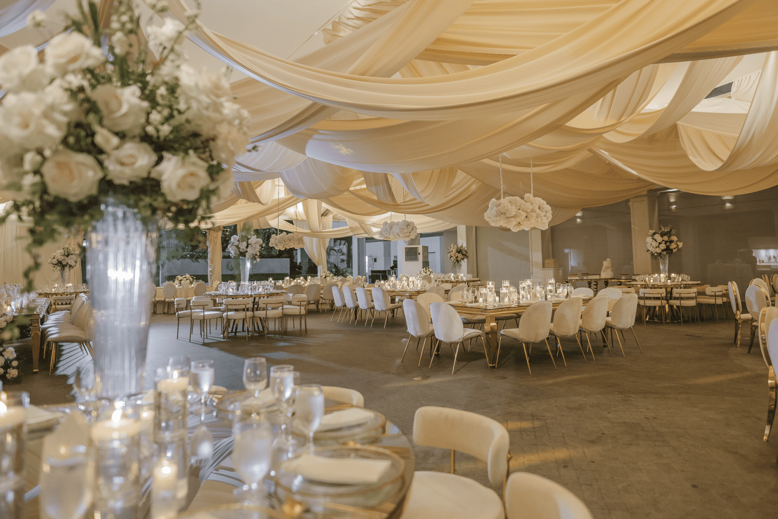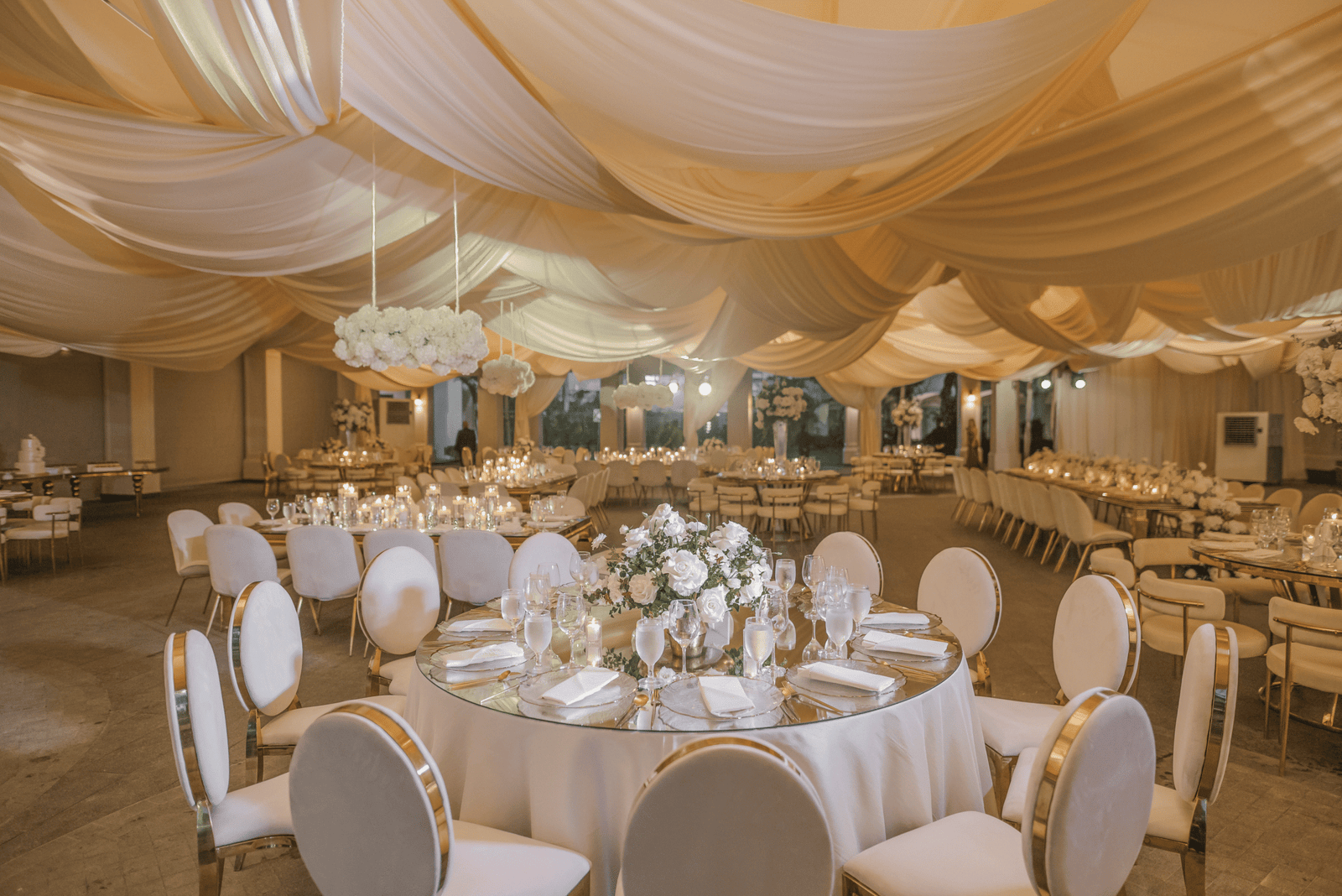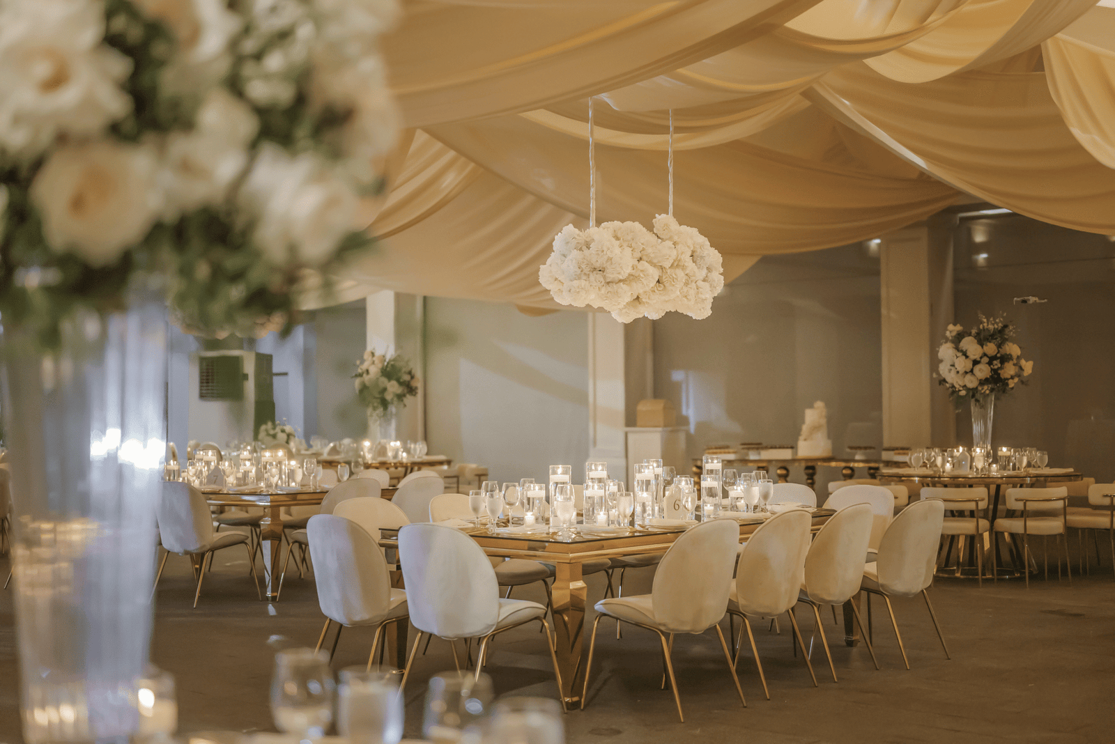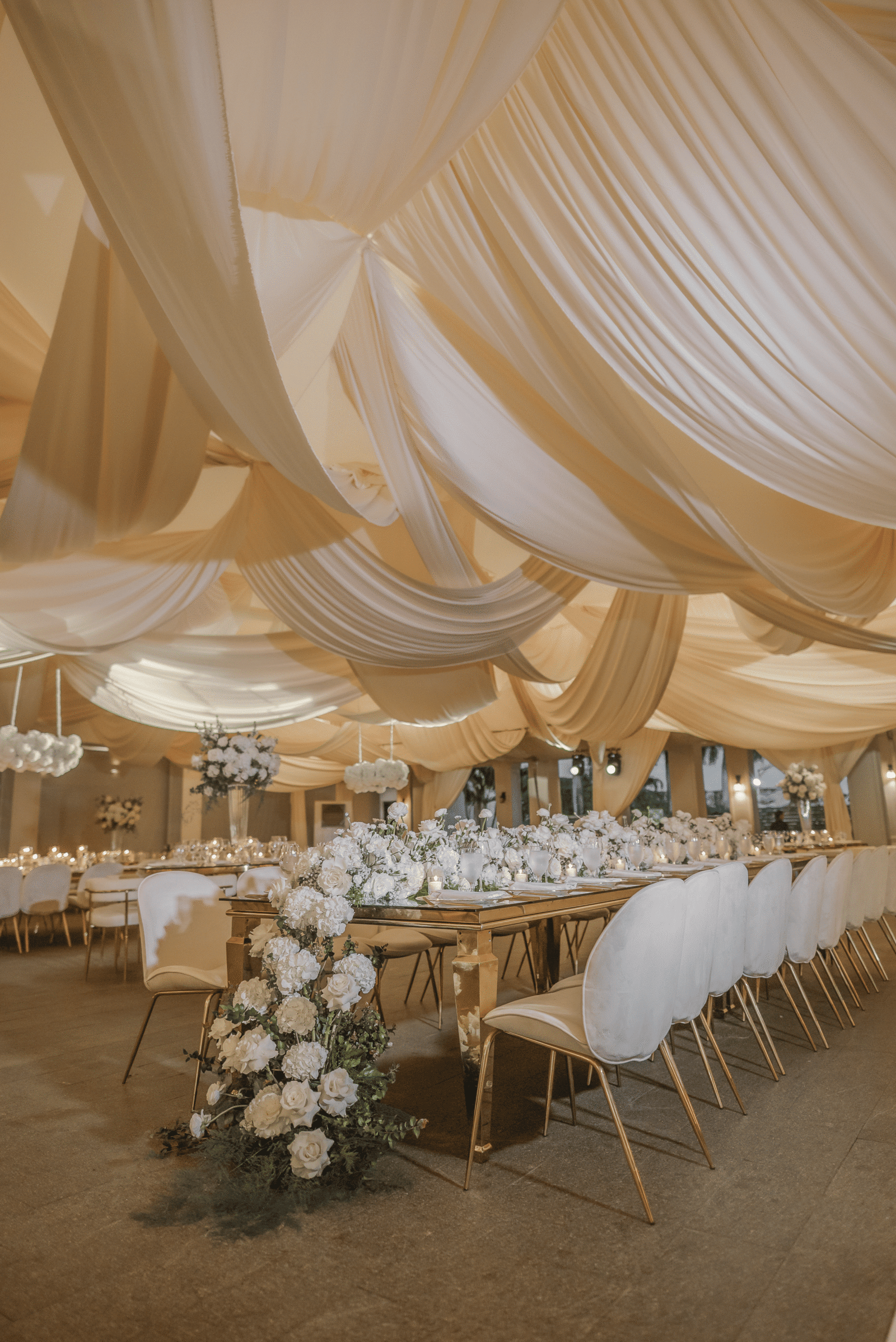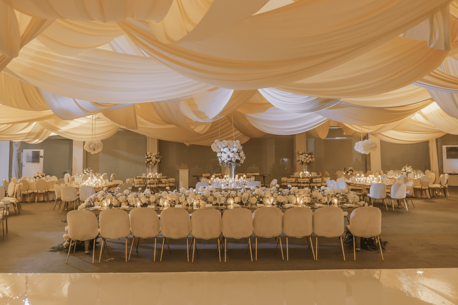 The heart of the design was a layered ivory draped ceiling that wrapped the entire venue in movement and warmth, creating a sense of depth and light that transformed the atmosphere completely.