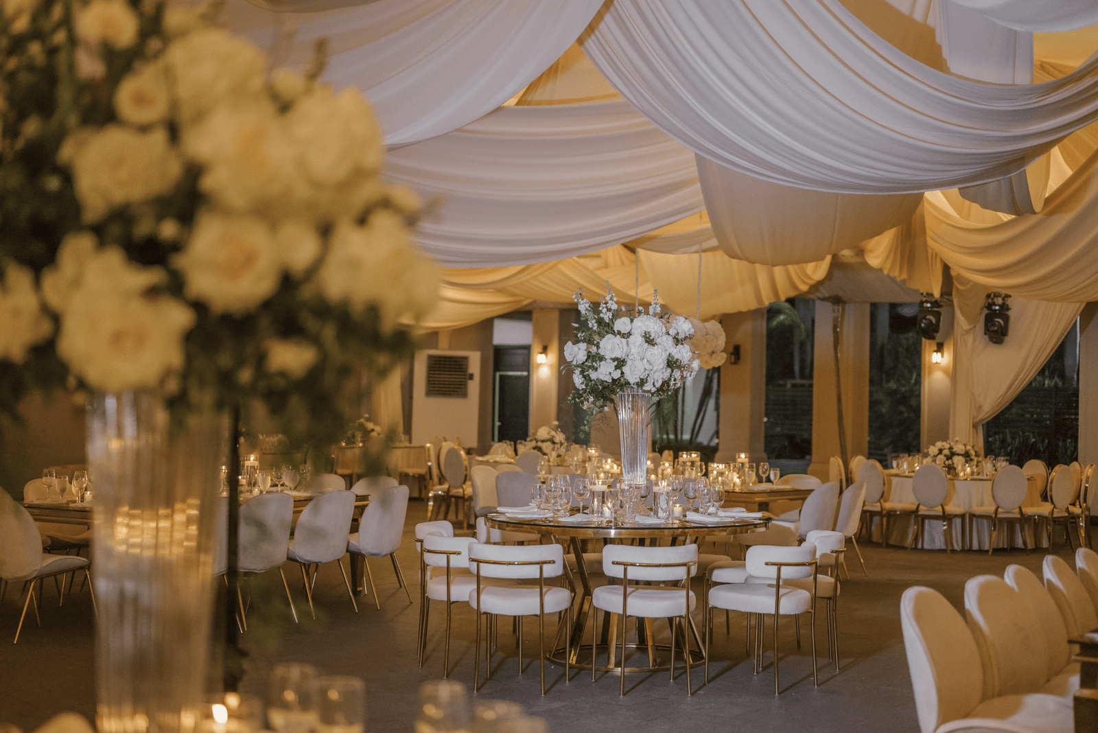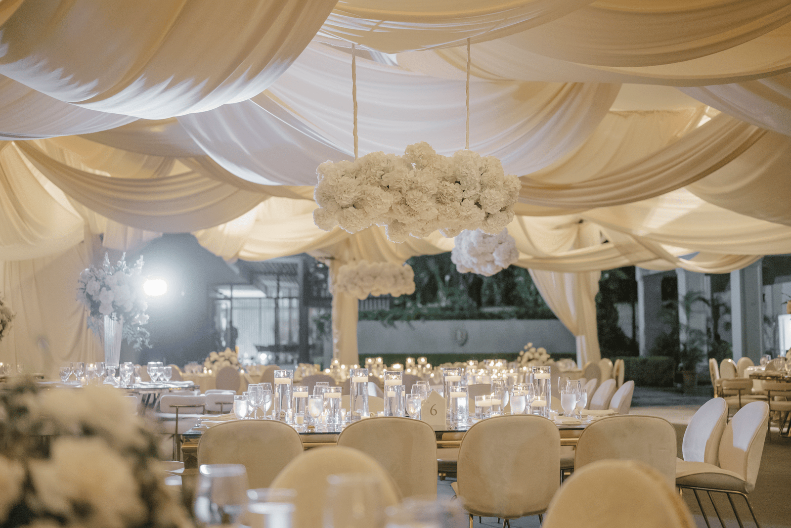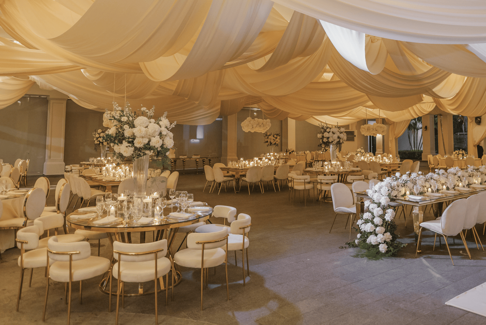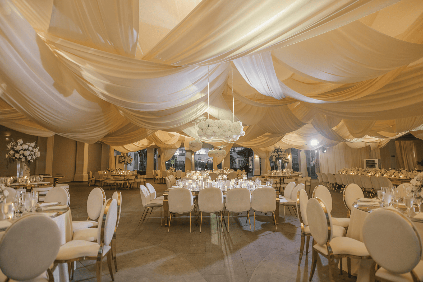 The heart of the design was a layered ivory draped ceiling that wrapped the entire venue in movement and warmth, creating a sense of depth and light that transformed the atmosphere completely.