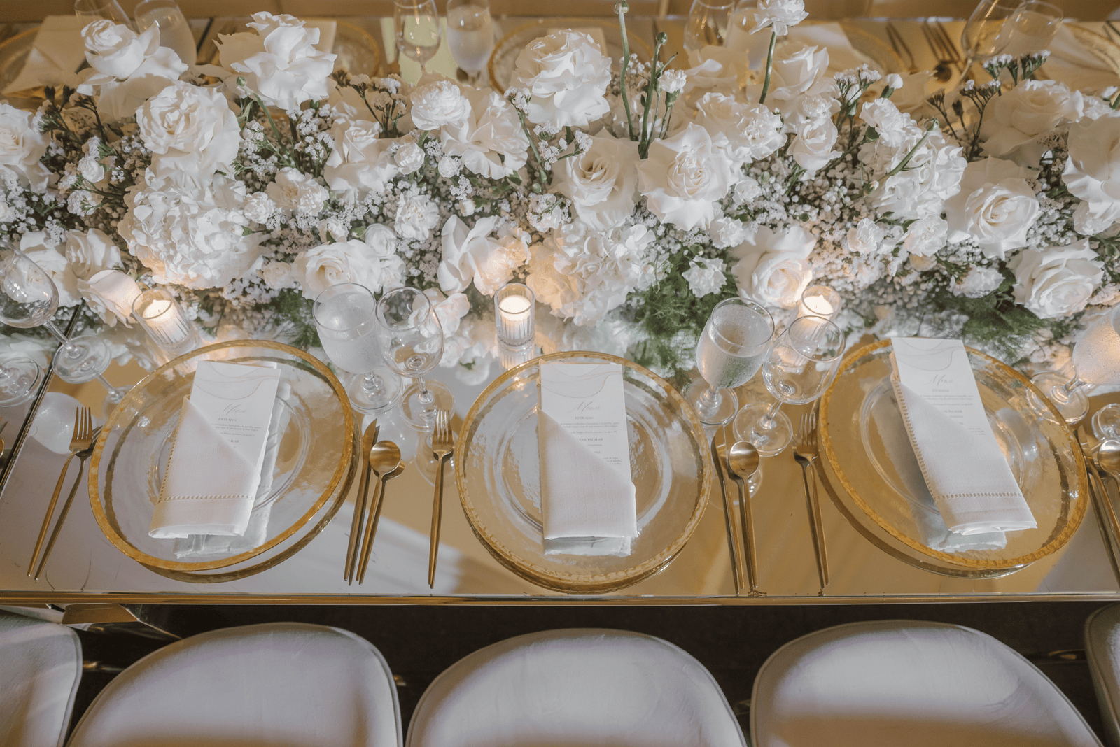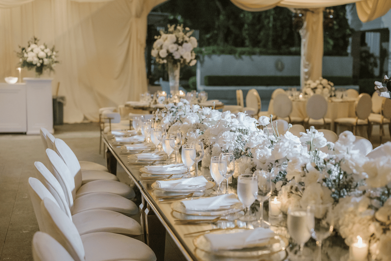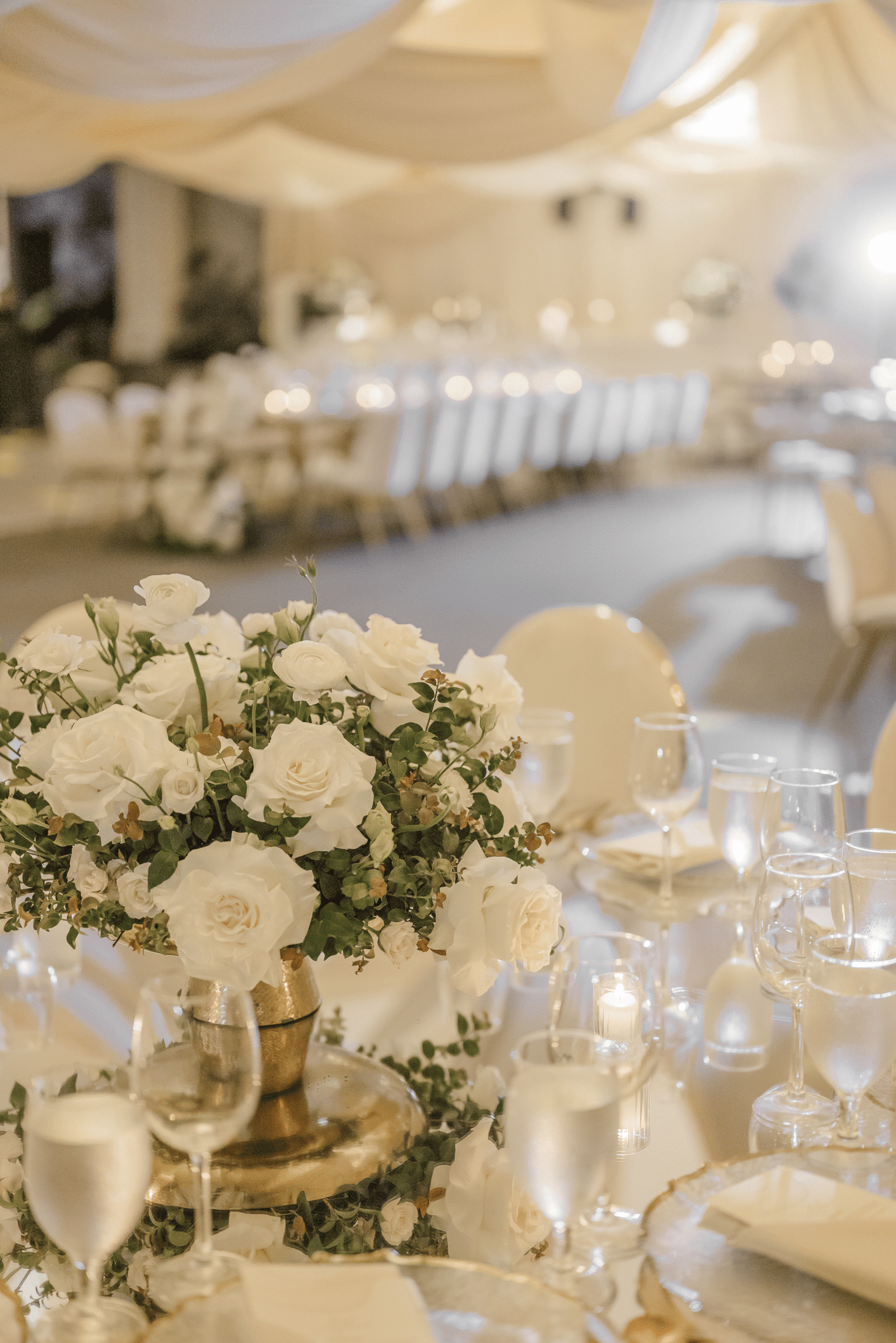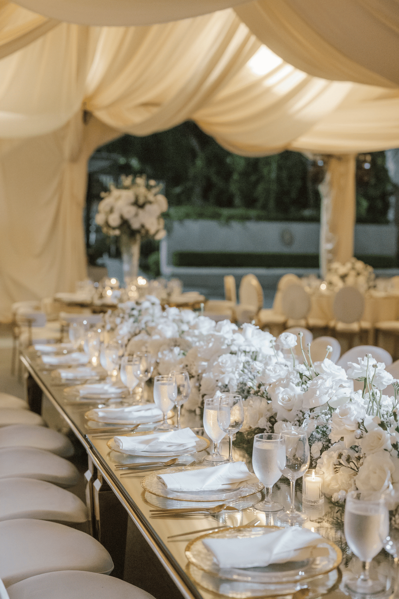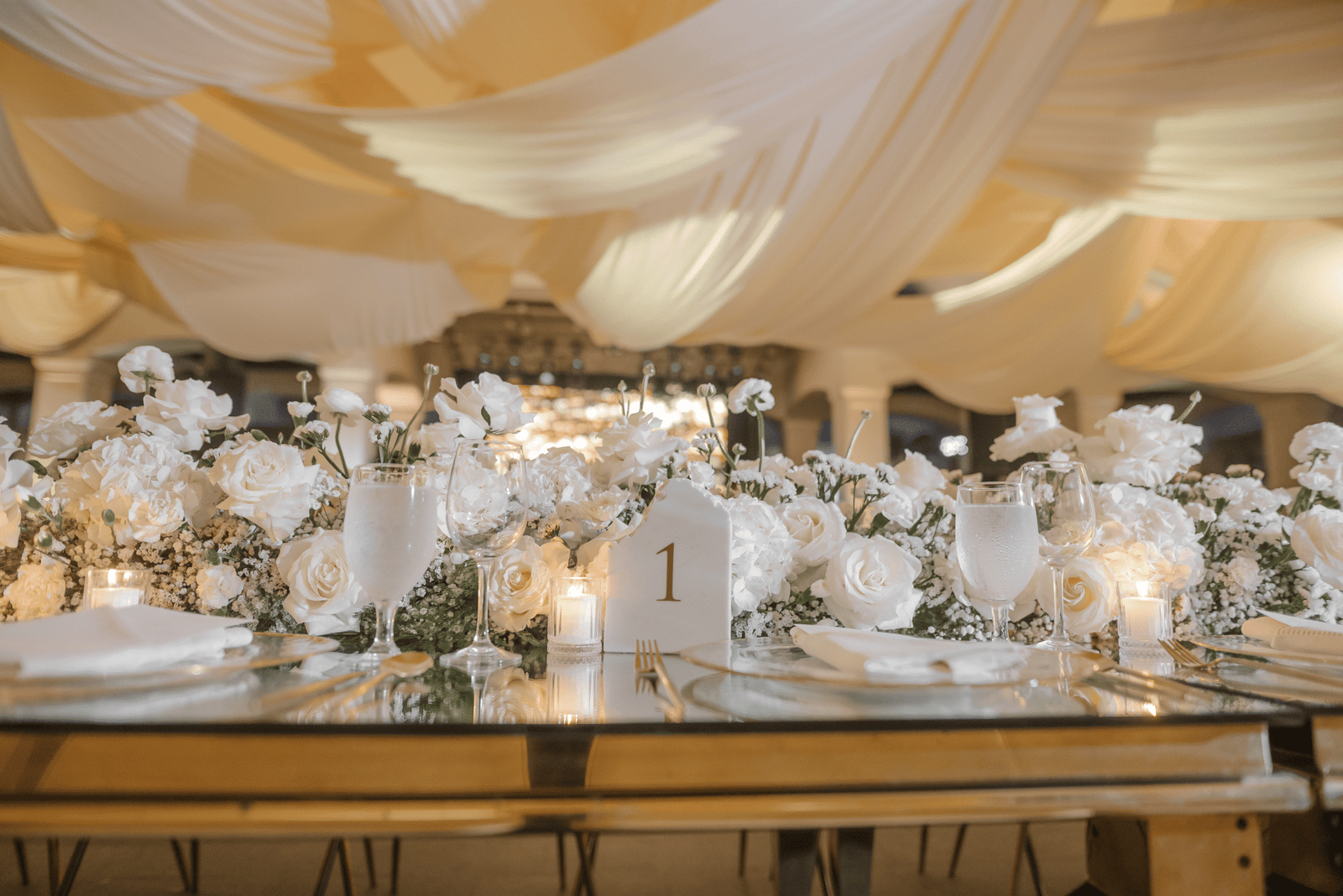 The floral design followed the same philosophy: white blooms in natural, flowing compositions that echoed the softness above. Every element — from lighting to fabrics — worked together to create a space that felt alive, romantic, and endlessly warm.