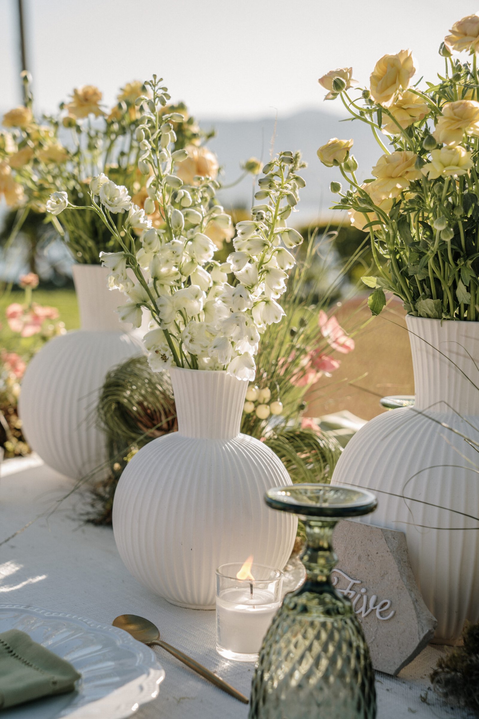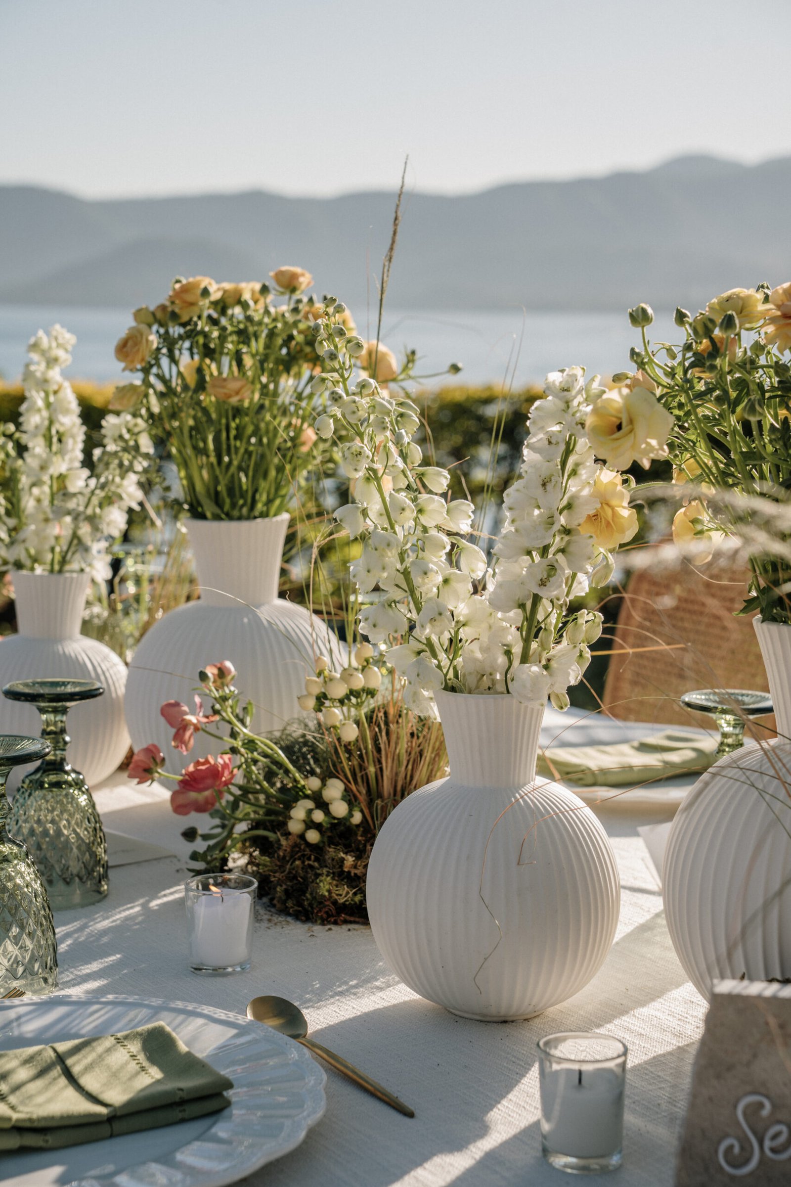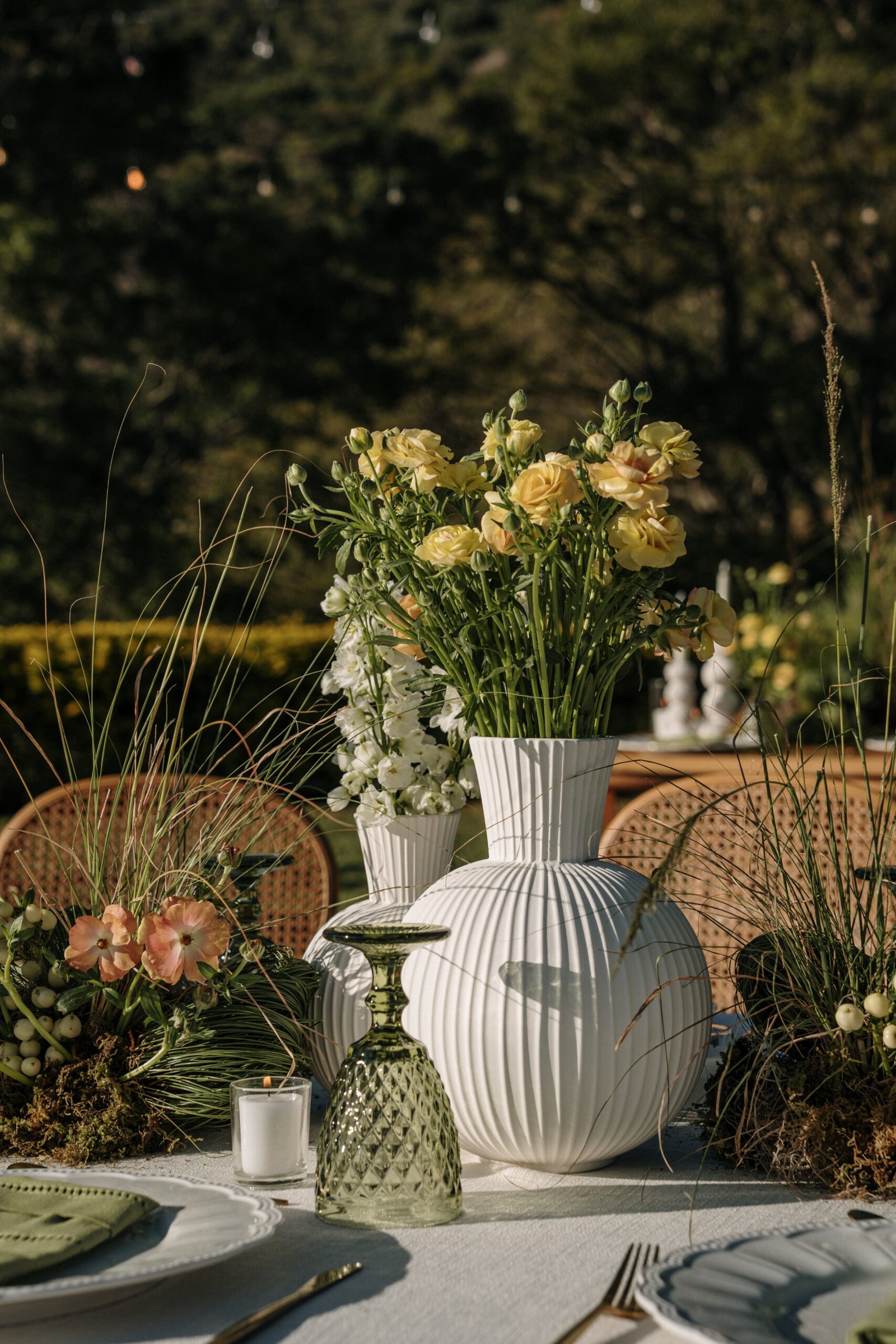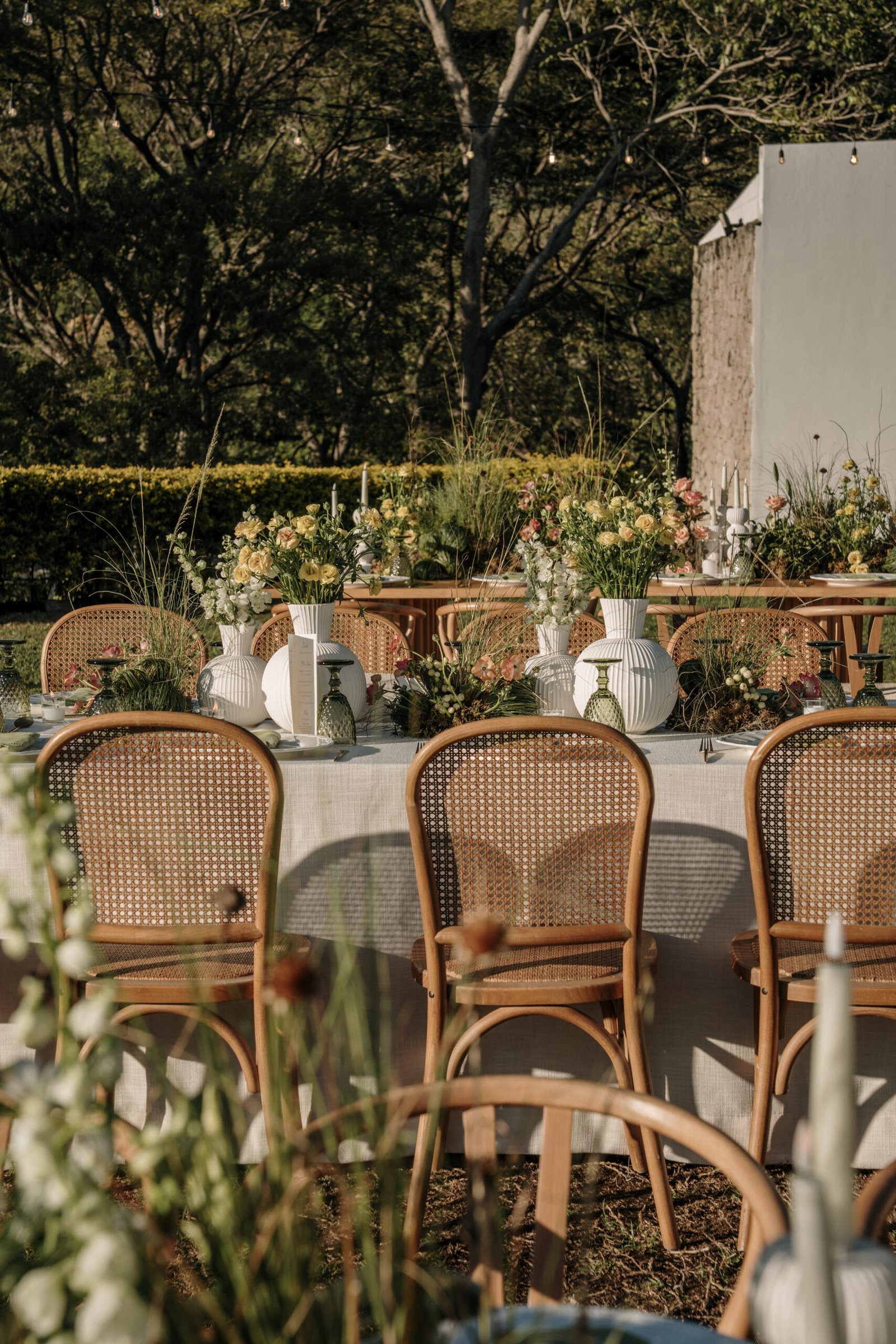 The mix of color warm peaches, soft yellows, ivory tones and textured greens gave the event an effortless vibrancy, grounded by earthy bases and handmade vases. It was an homage to natural forms, to wild elegance, and to letting nature take the lead.