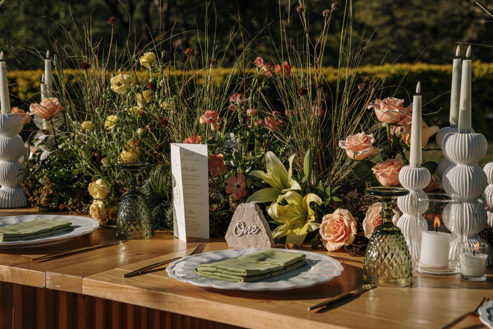 This design was conceived as an organic, garden to table experience something that felt alive, intentional, and immersed in nature. We leaned into wild beauty, asymmetrical compositions, and raw textures to create floral moments that looked like they were growing in place. From the sculptural greenery forms to the treated foliage that mimicked natural movement, each element was placed to feel spontaneous but sophisticated.