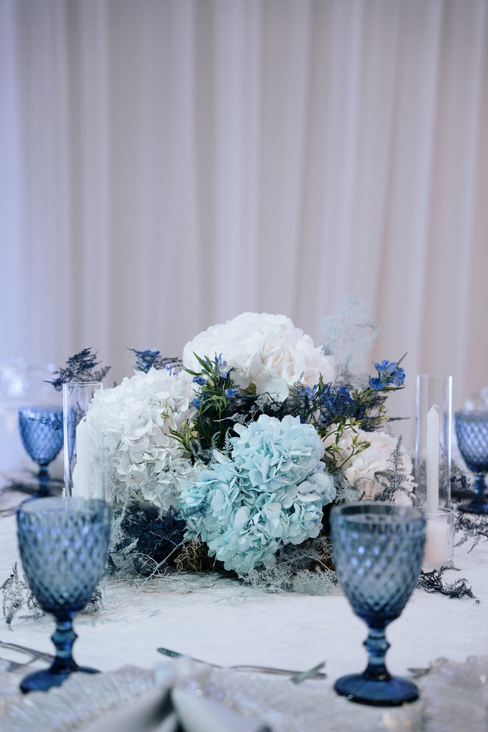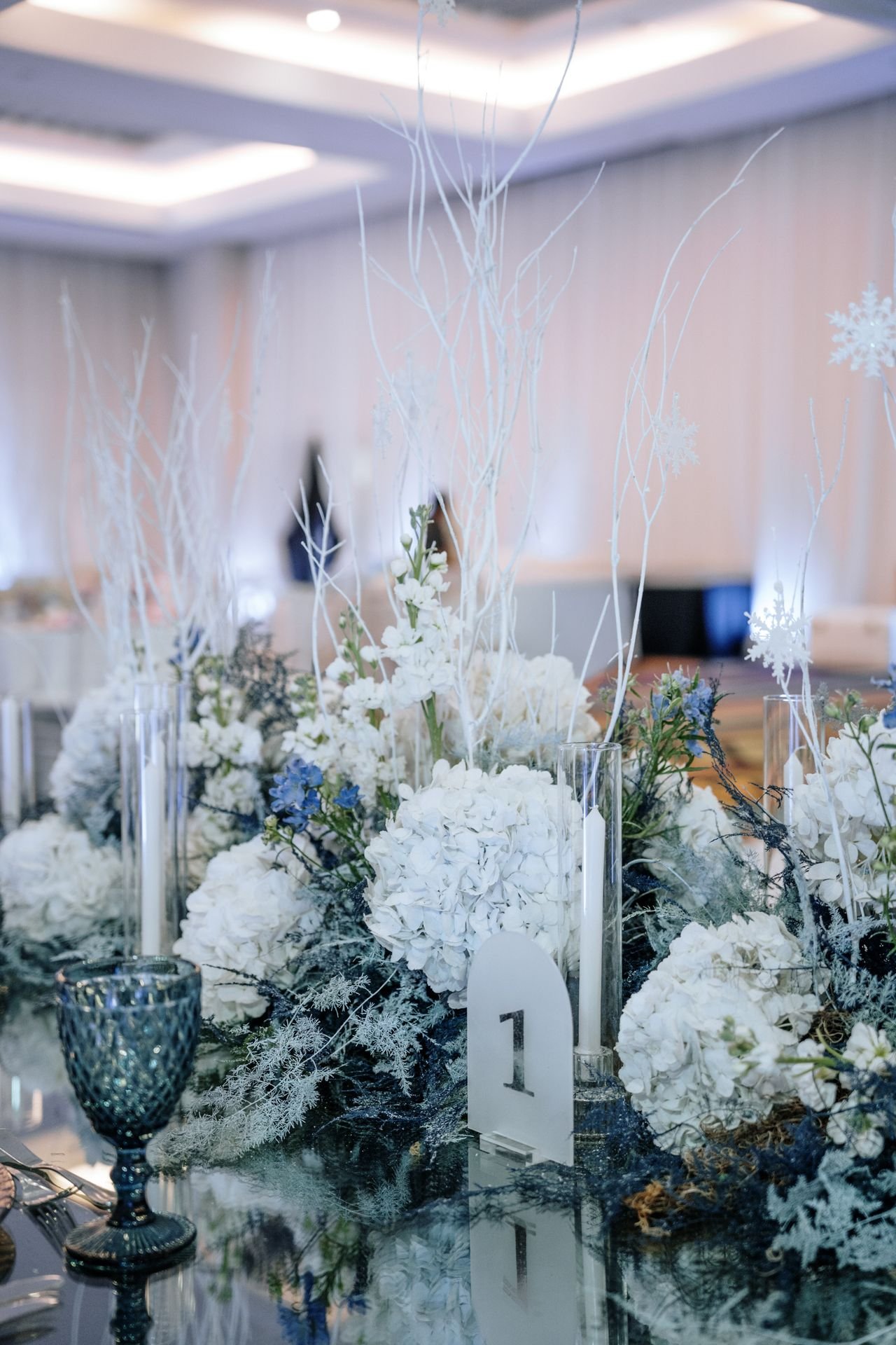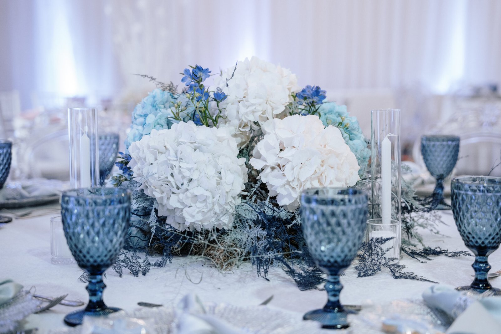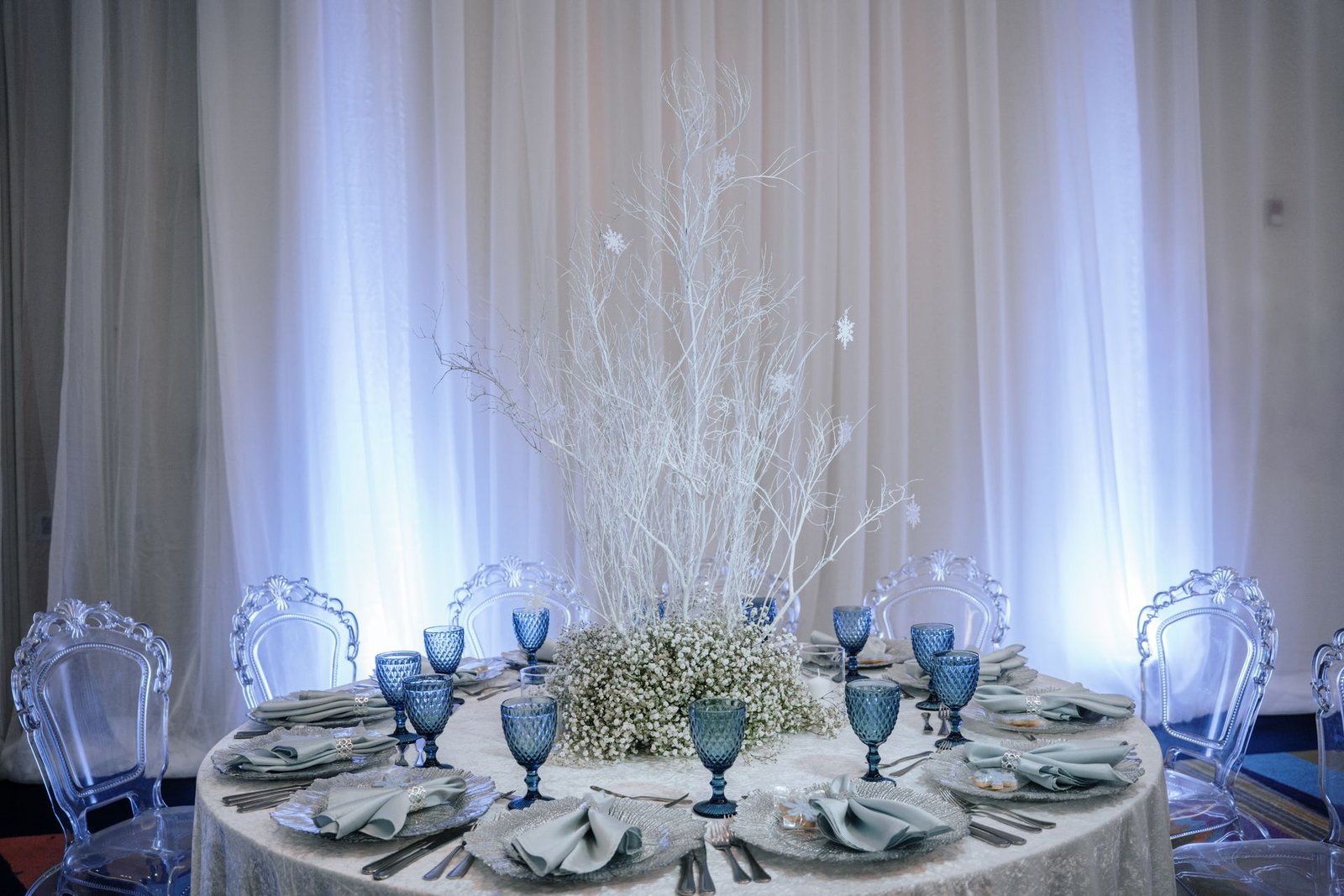 For this 15th birthday celebration, the goal was to create a space that felt dreamy and wintery — without being literal. Inspired by the soft side of winter, we used powder blues, snowy whites, and frosted textures to bring the theme to life. Every detail — from the bleached branches to the floral textures and crystal accents — worked together to build a design that whispered instead of shouted. Icy tones, airy textures, and just enough bloom to feel alive. The result was a frozen-inspired design that felt floral, elegant, and refreshingly different.