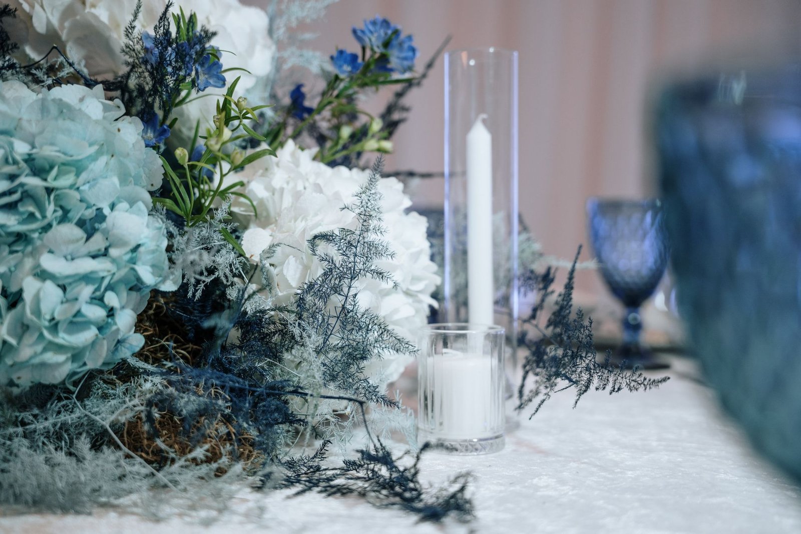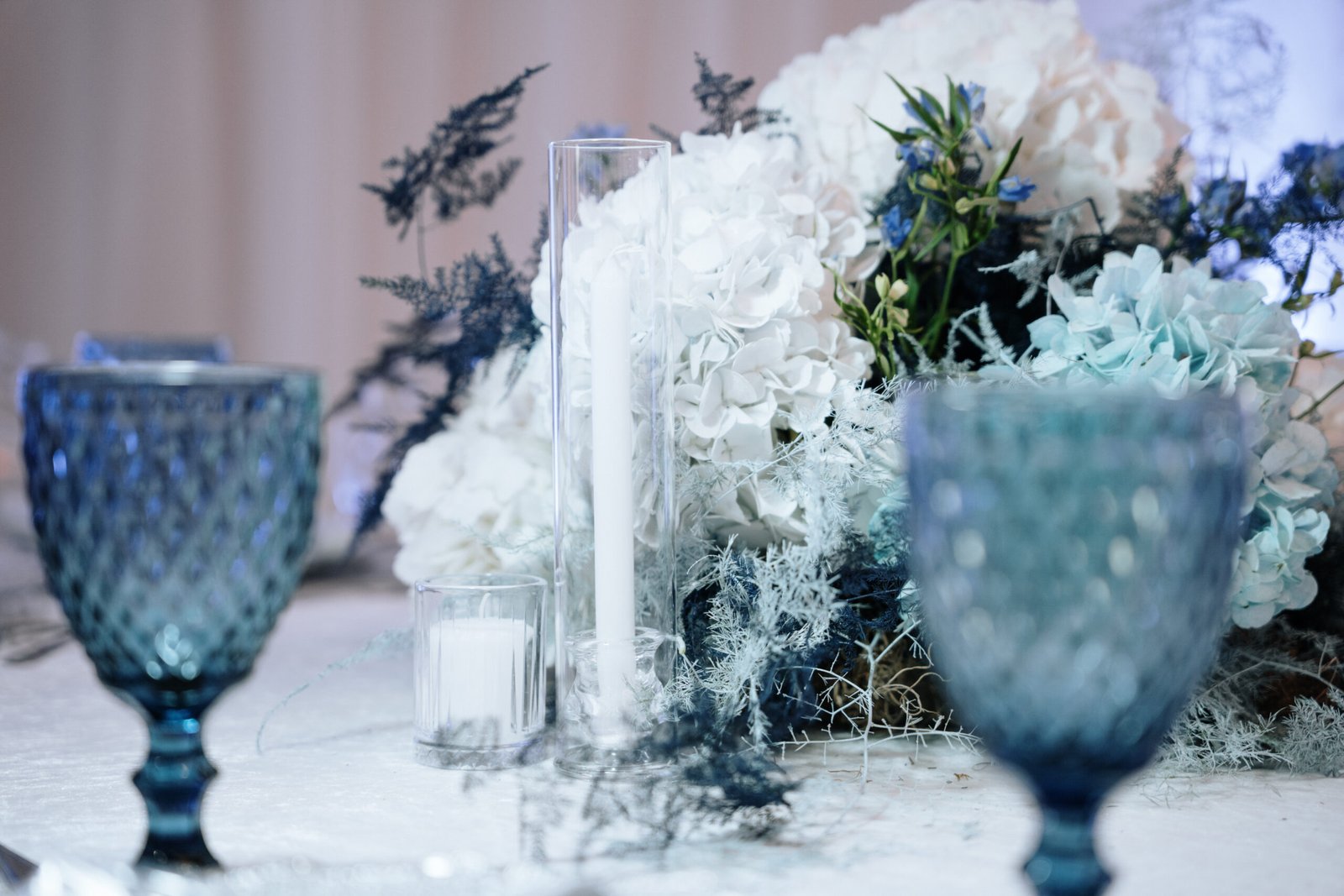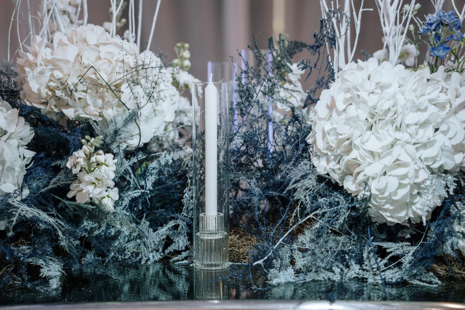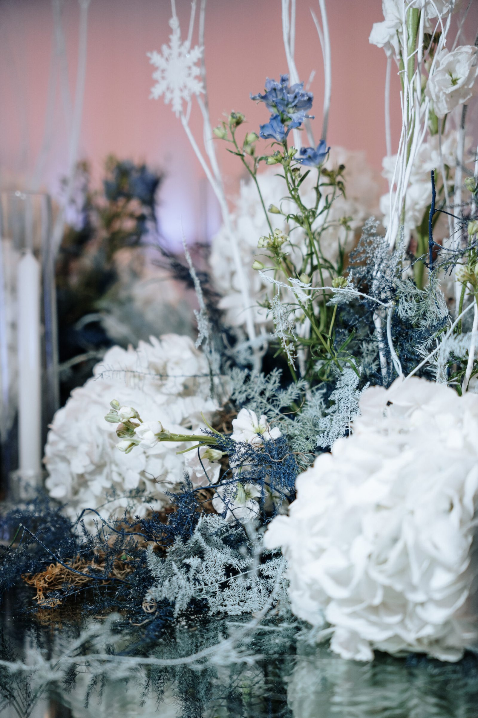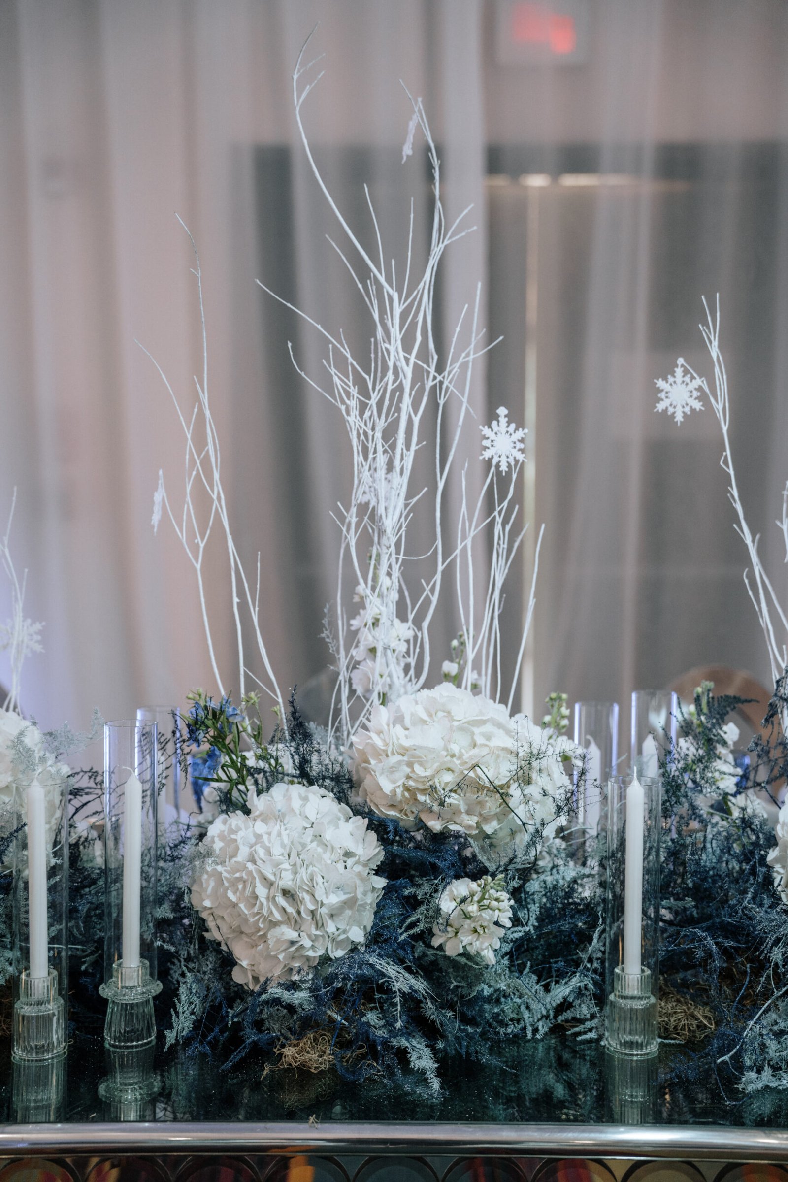 For this 15th birthday celebration, the goal was to create a space that felt dreamy and wintery — without being literal. Inspired by the soft side of winter, we used powder blues, snowy whites, and frosted textures to bring the theme to life. Every detail — from the bleached branches to the floral textures and crystal accents — worked together to build a design that whispered instead of shouted. Icy tones, airy textures, and just enough bloom to feel alive. The result was a frozen-inspired design that felt floral, elegant, and refreshingly different.
