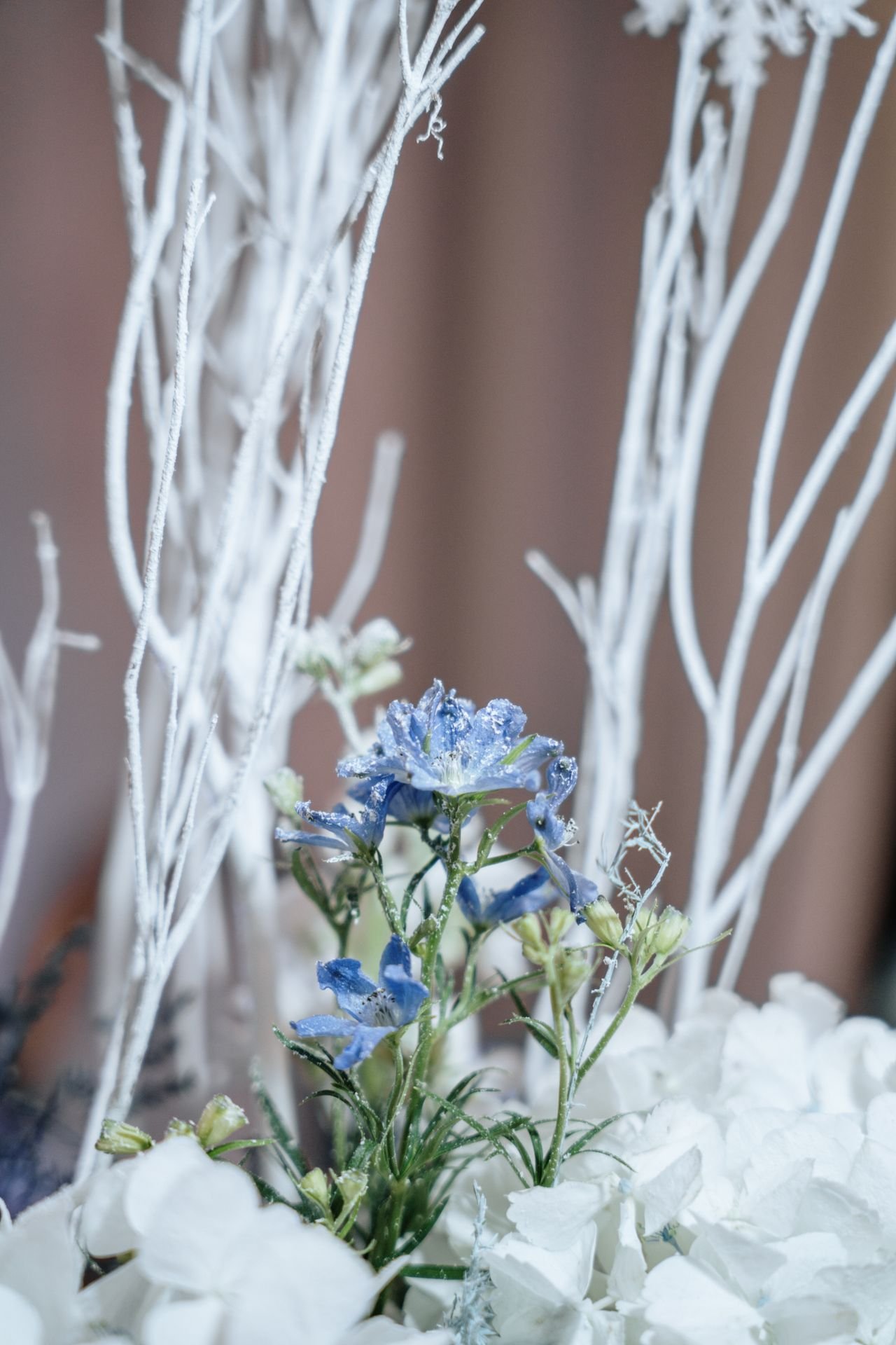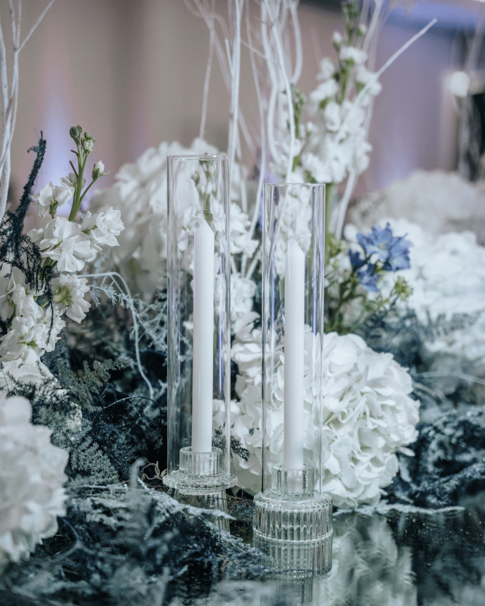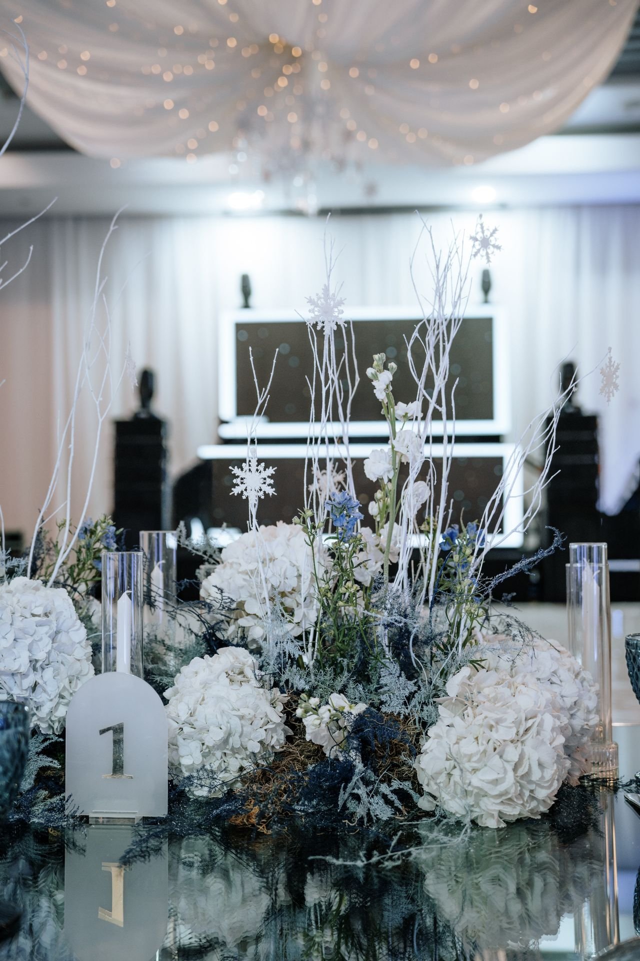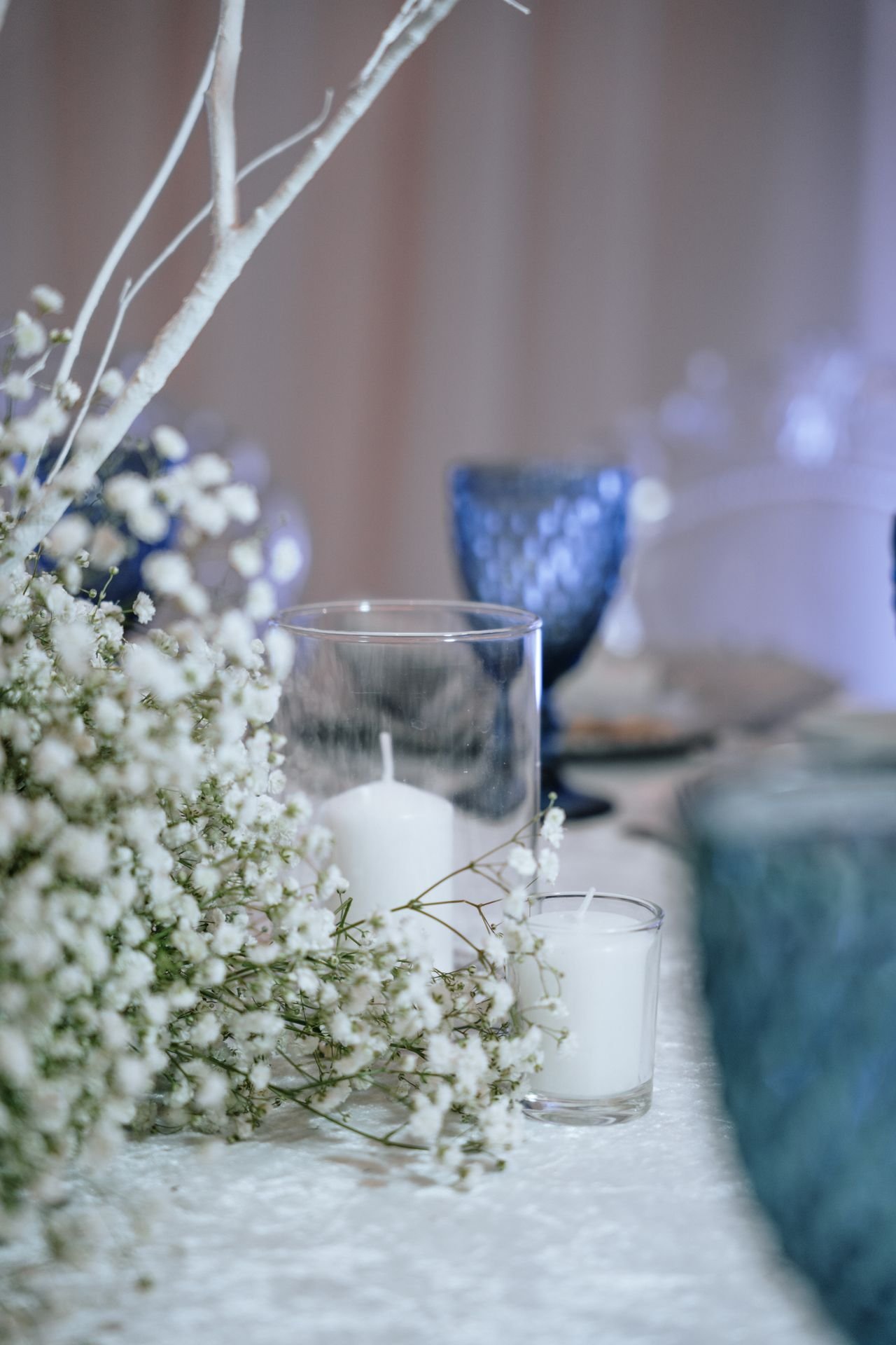 For this 15th birthday celebration, the goal was to create a space that felt dreamy and wintery — without being literal. Inspired by the soft side of winter, we used powder blues, snowy whites, and frosted textures to bring the theme to life. Every detail — from the bleached branches to the floral textures and crystal accents — worked together to build a design that whispered instead of shouted. Icy tones, airy textures, and just enough bloom to feel alive. The result was a frozen-inspired design that felt floral, elegant, and refreshingly different.
