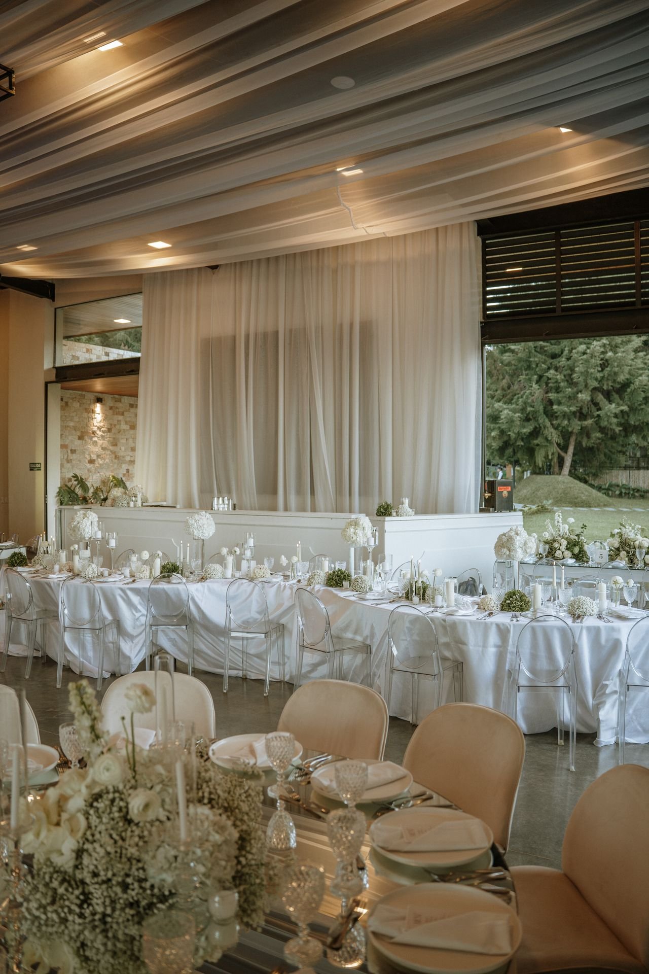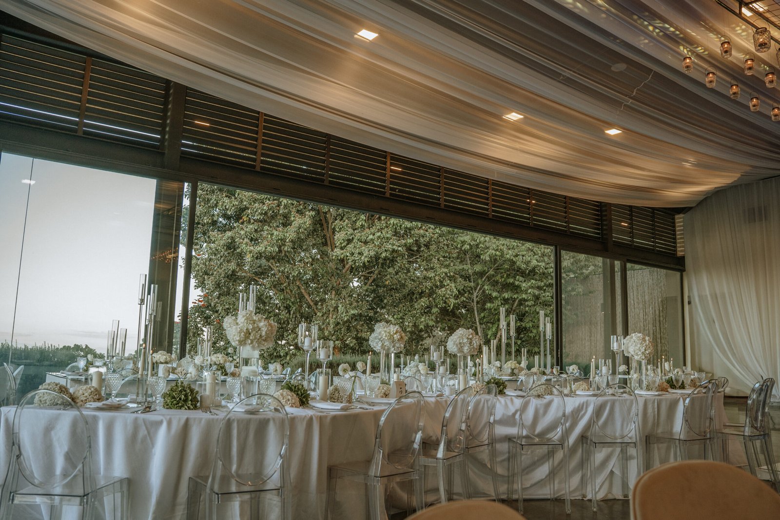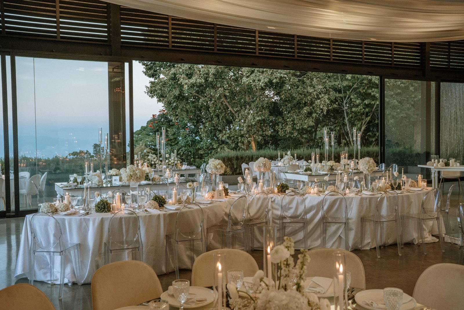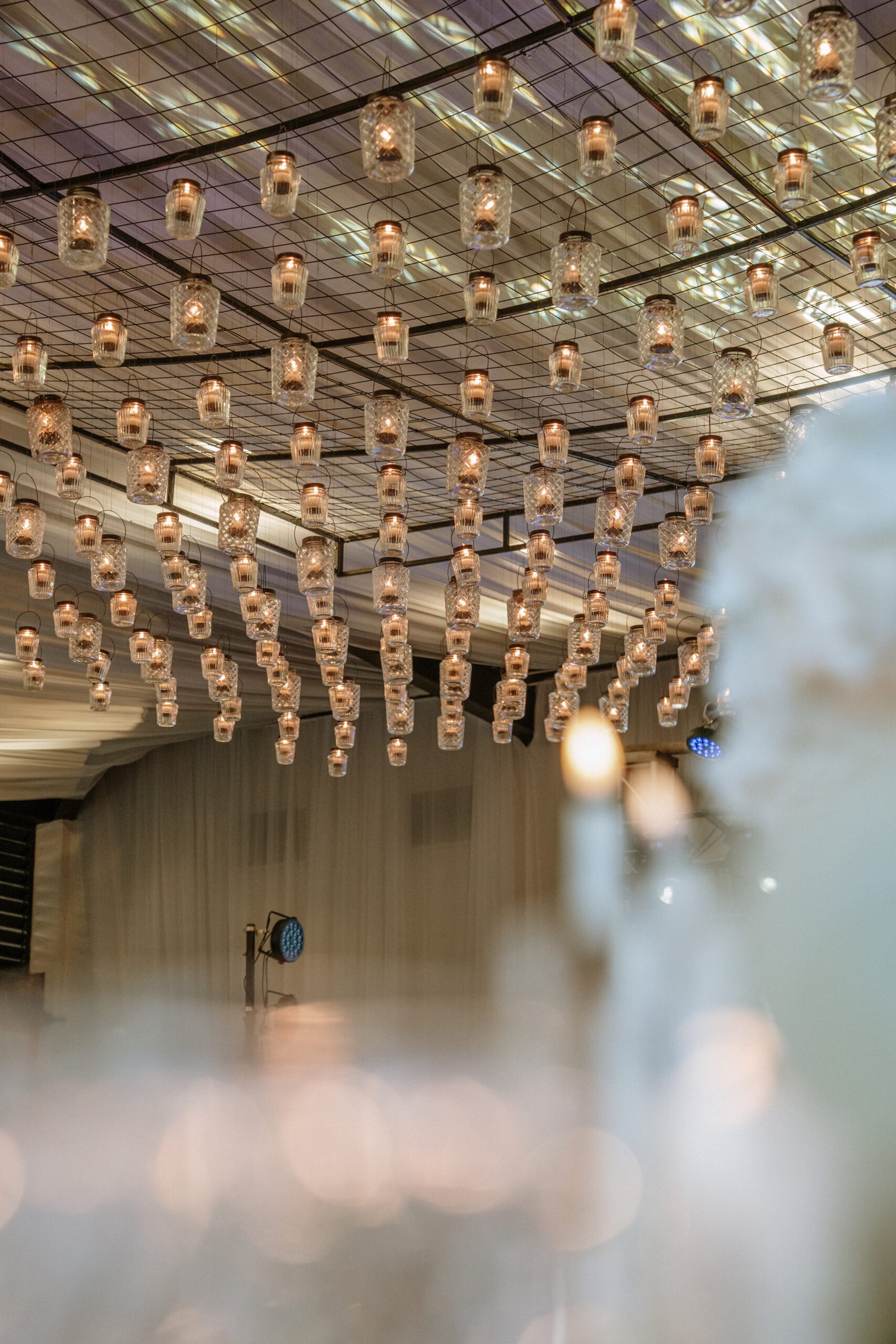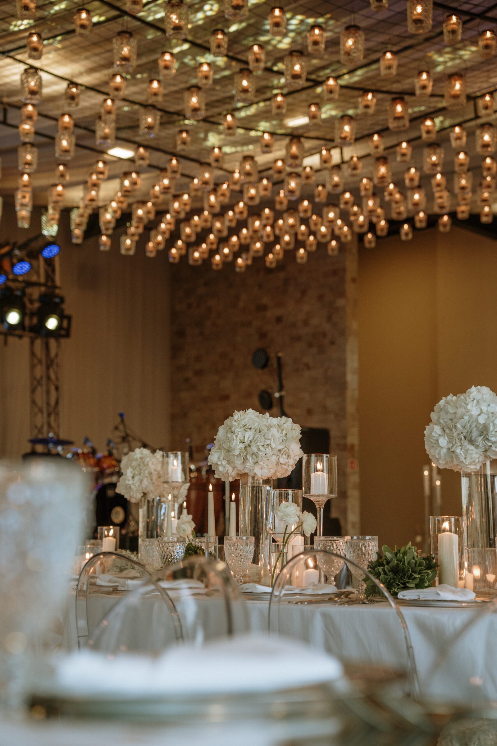 The atmosphere felt intentional but never forced. The floral work was clean, airy, and cohesive, complemented by glass cylinders, transparent chairs, and soft textiles The floating candle ceiling became the anchor point indoors, offering ambient warmth and elevating the entire room.