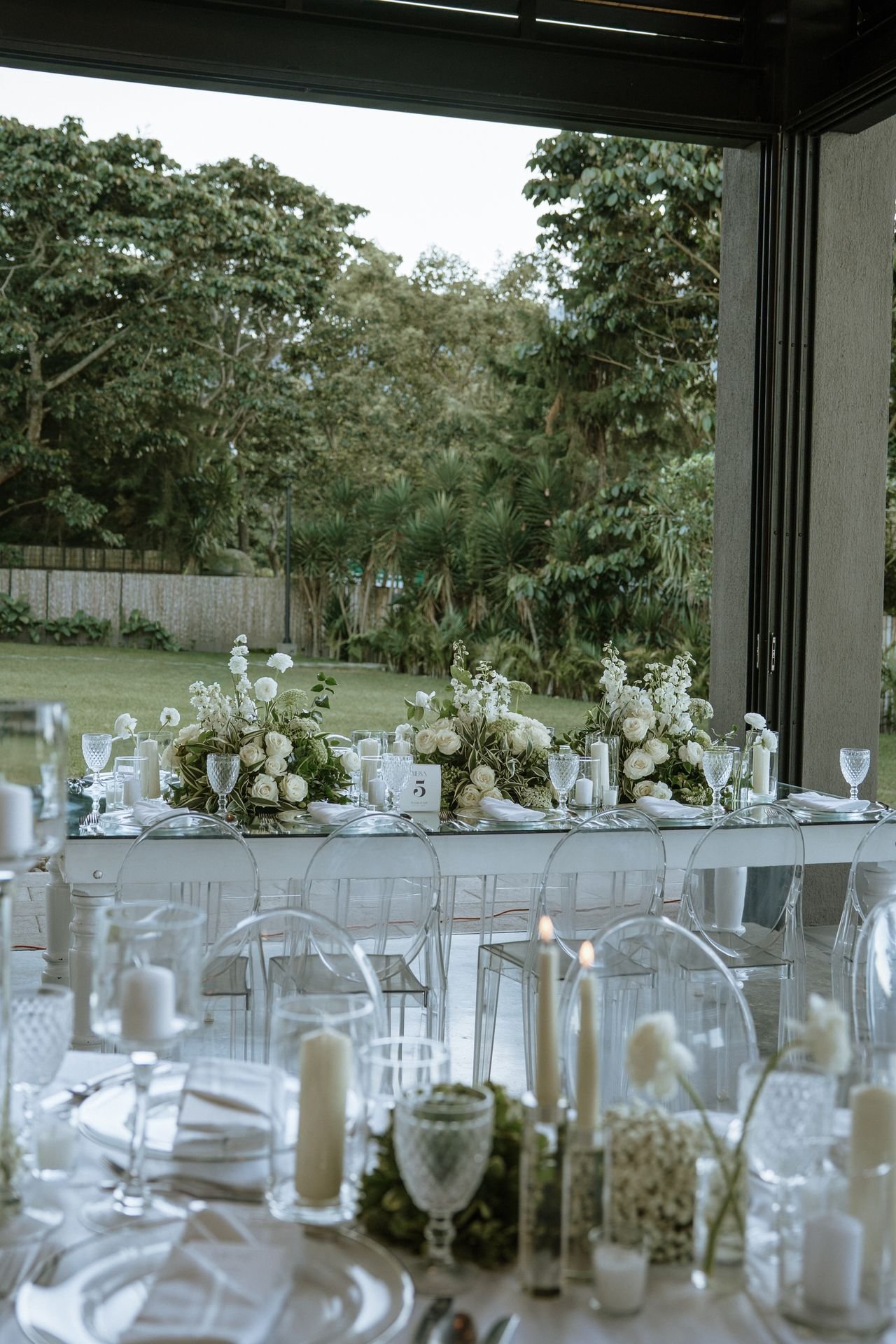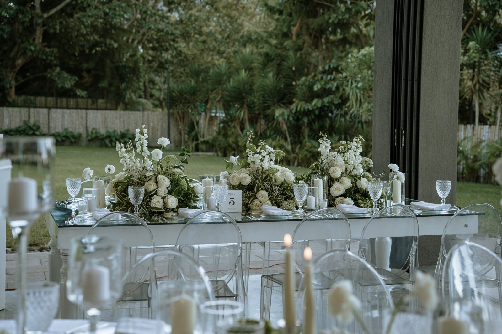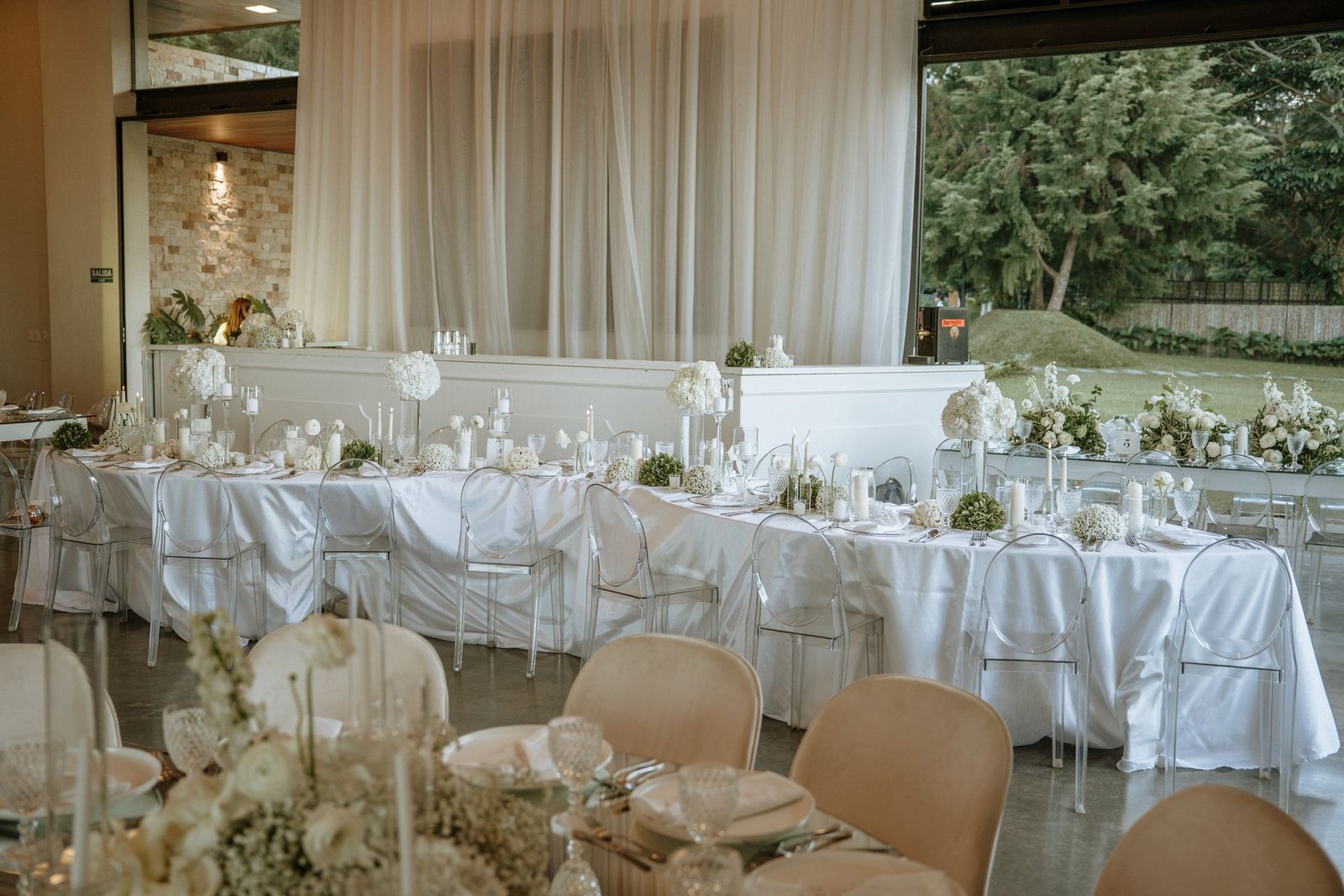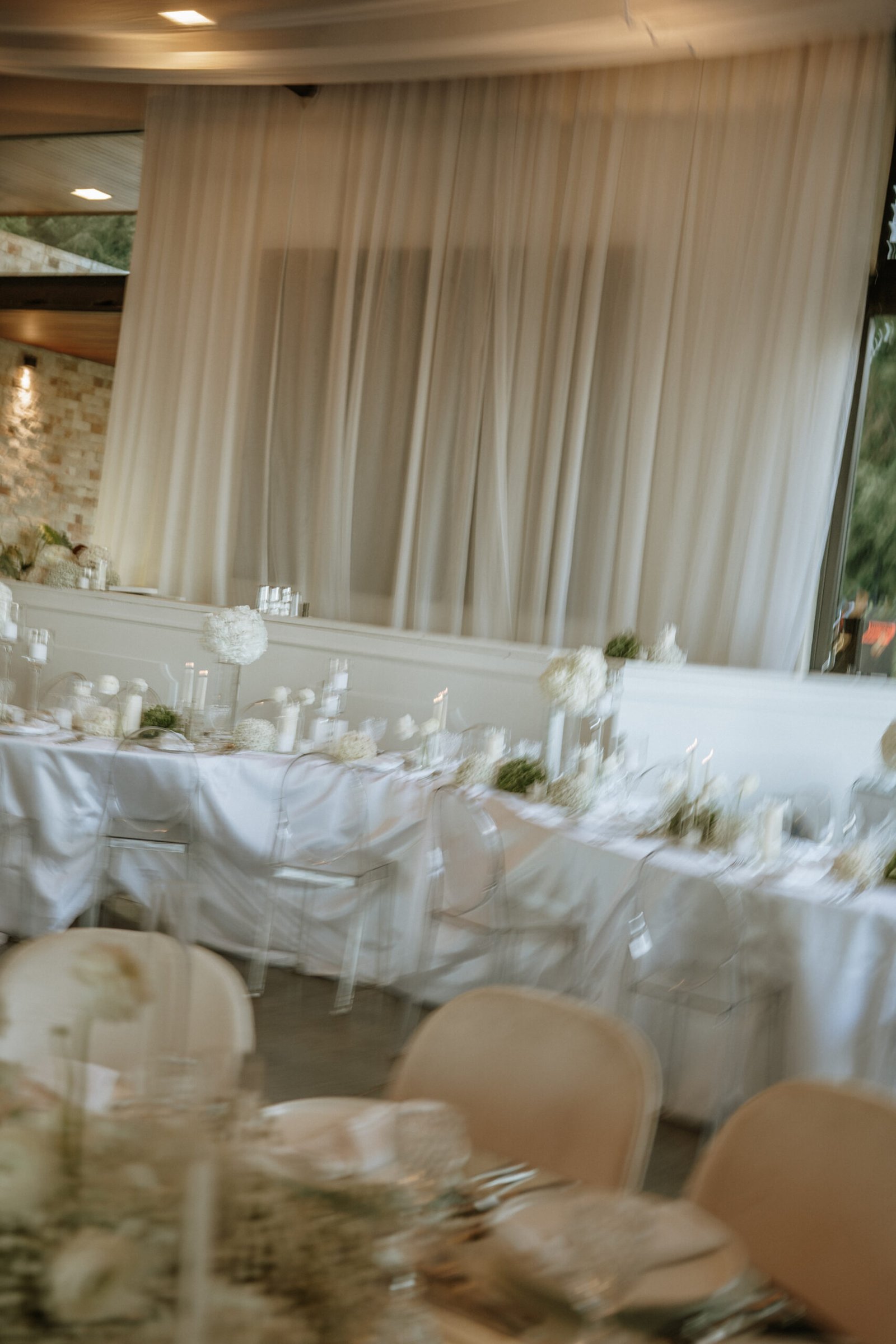 The atmosphere felt intentional but never forced. The floral work was clean, airy, and cohesive, complemented by glass cylinders, transparent chairs, and soft textiles The floating candle ceiling became the anchor point indoors, offering ambient warmth and elevating the entire room.