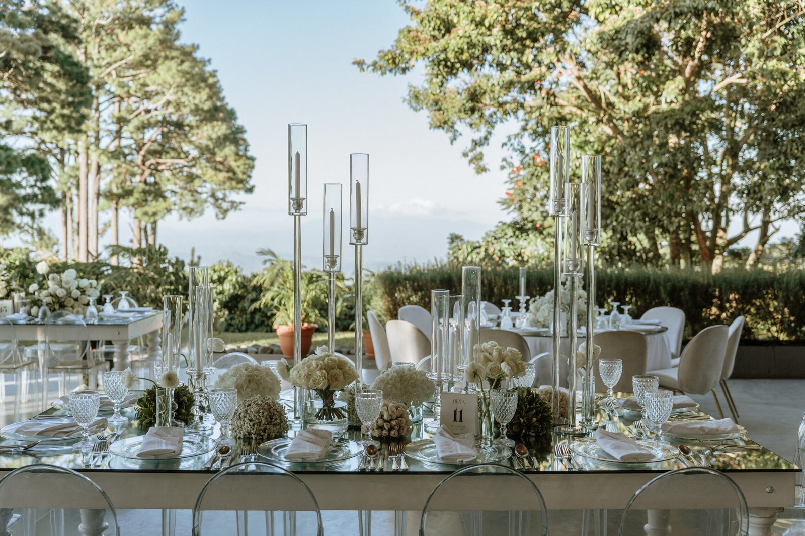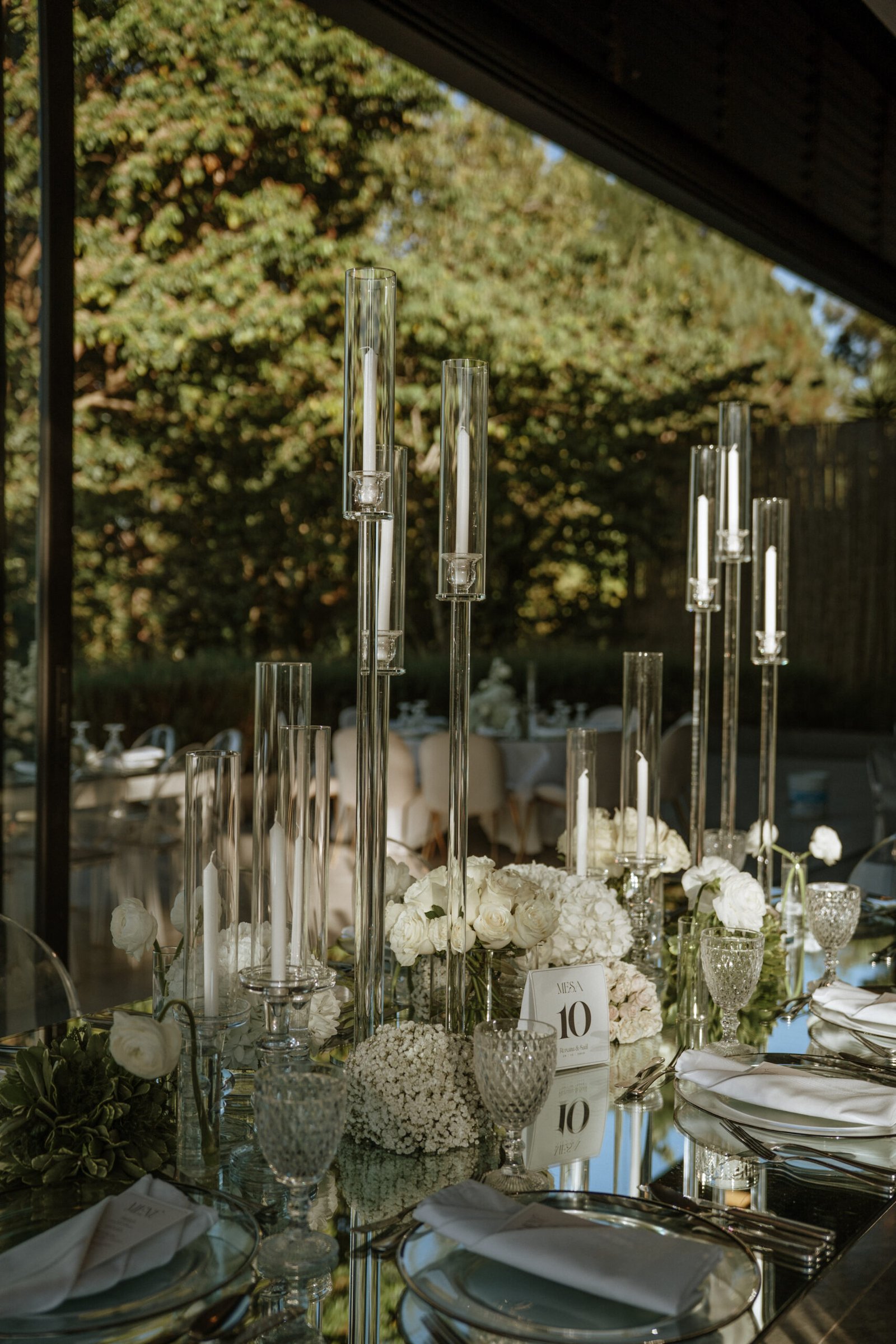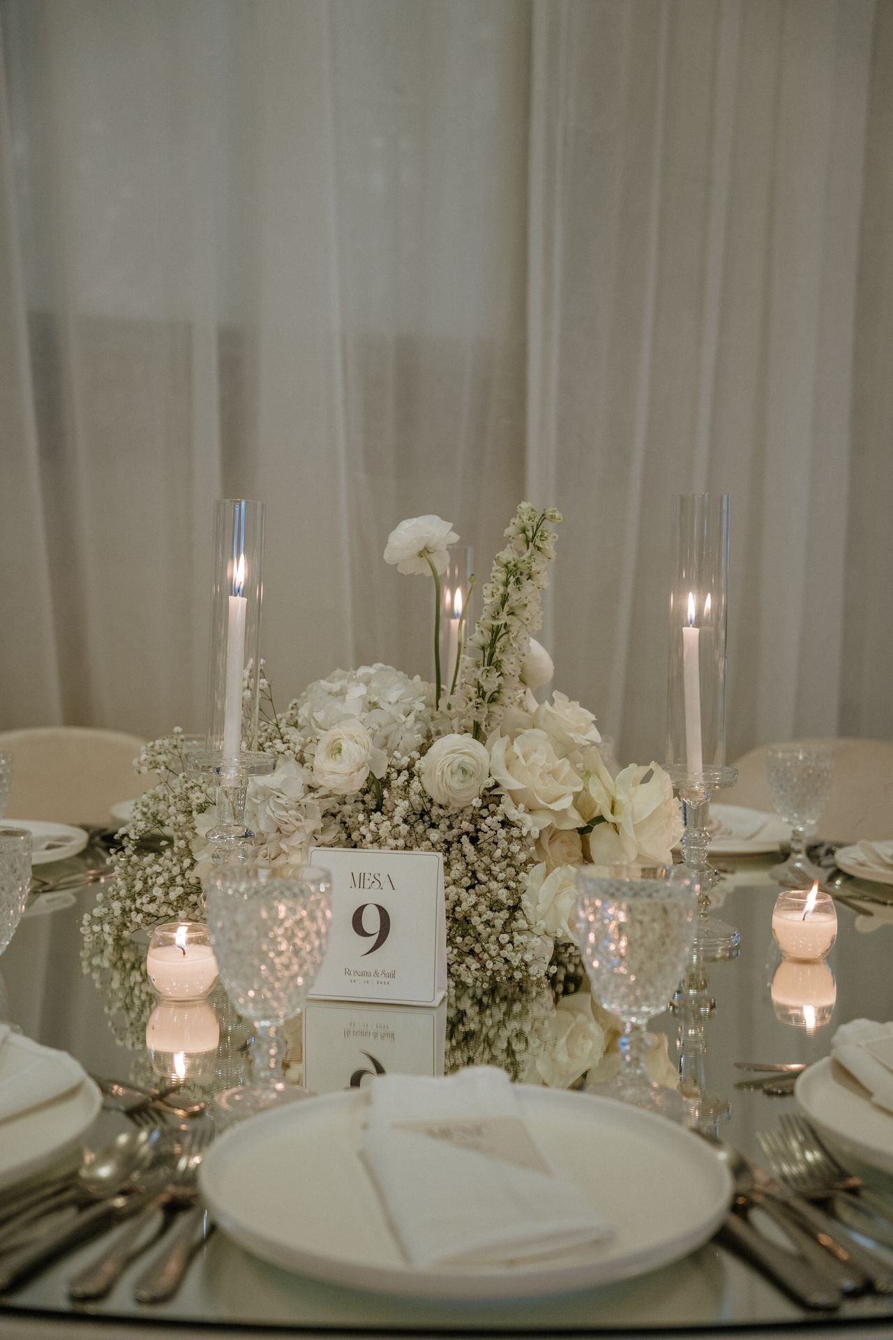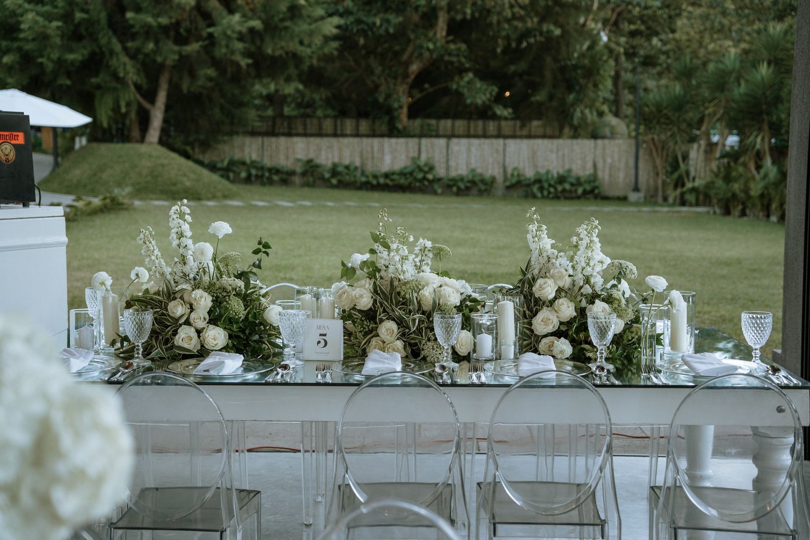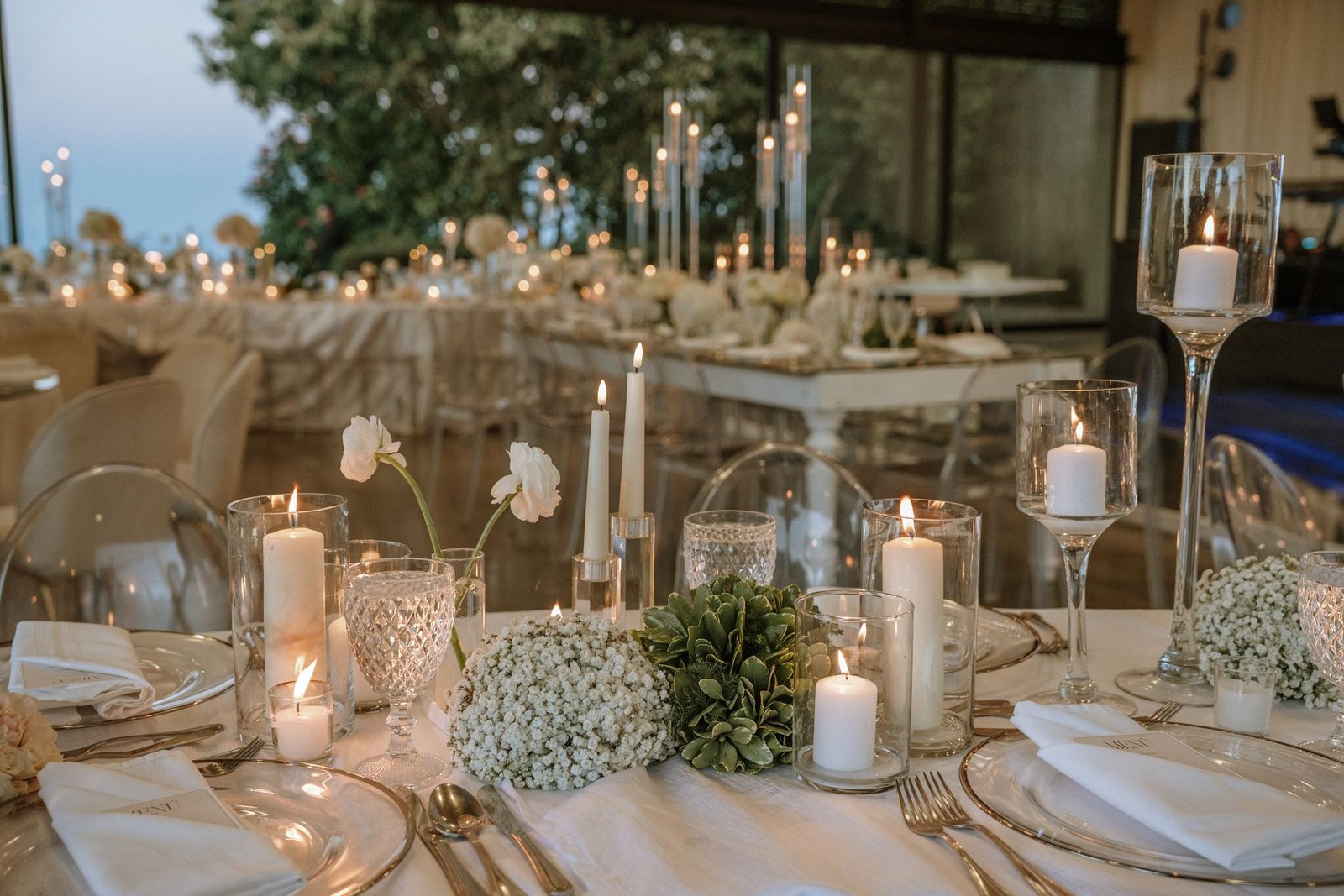 The atmosphere felt intentional but never forced. The floral work was clean, airy, and cohesive, complemented by glass cylinders, transparent chairs, and soft textiles The floating candle ceiling became the anchor point indoors, offering ambient warmth and elevating the entire room.