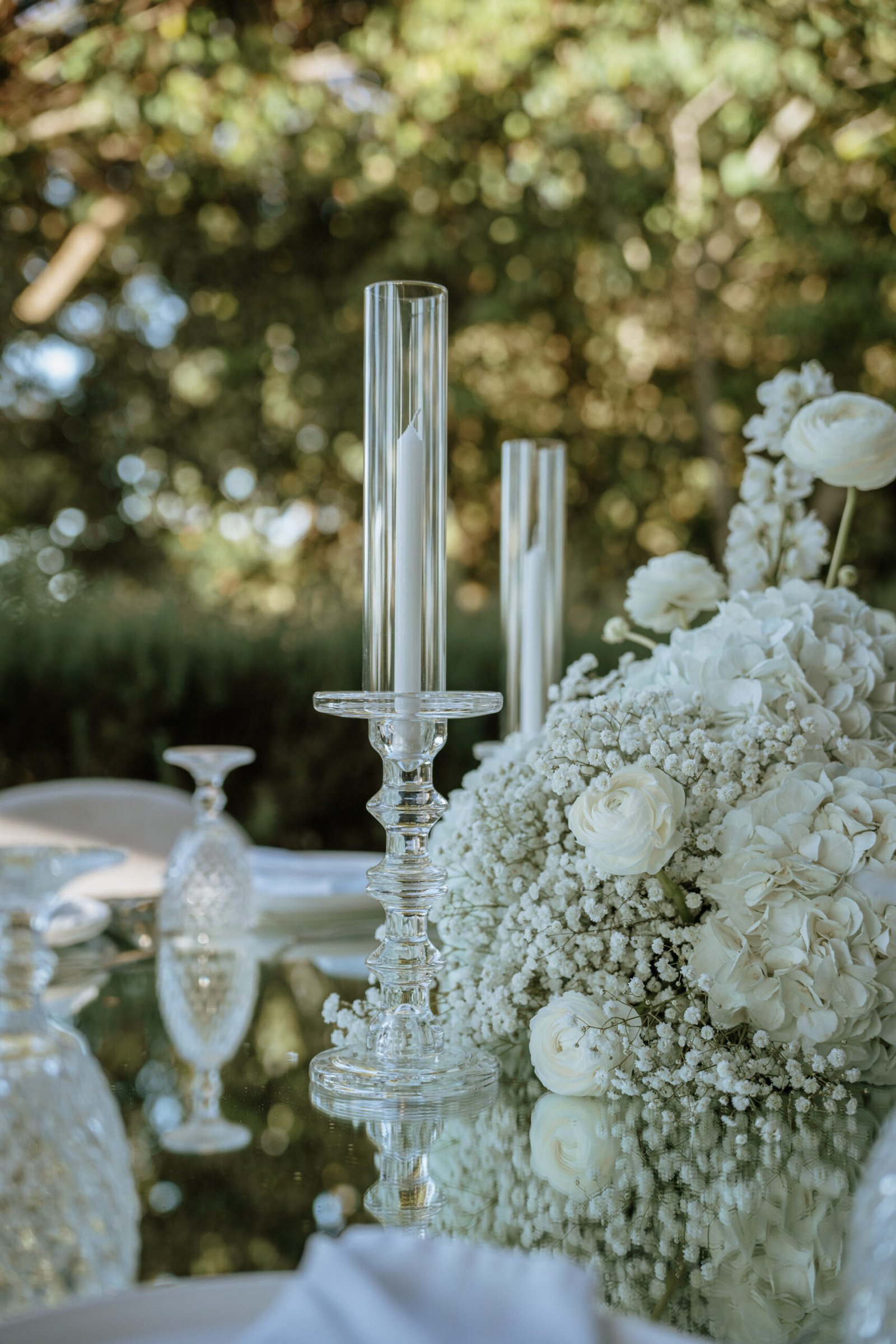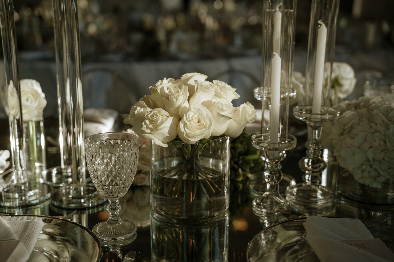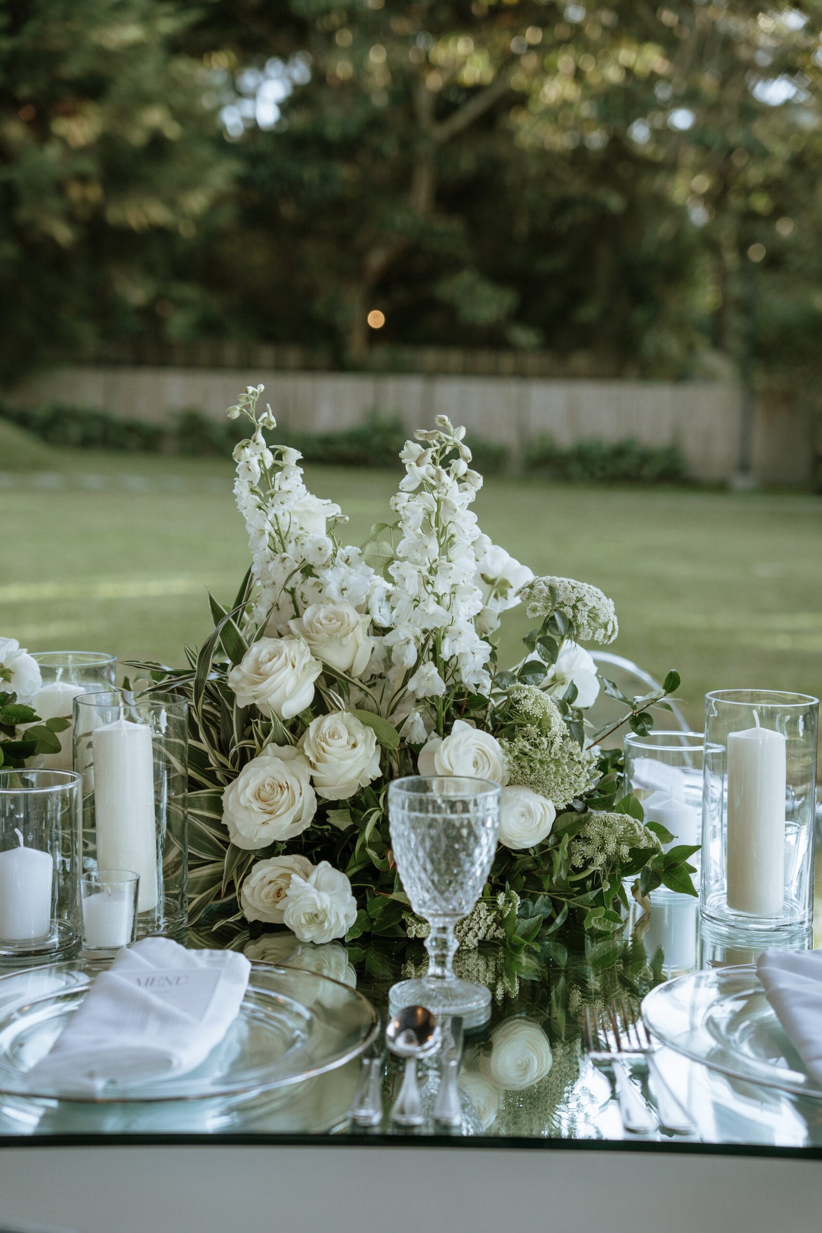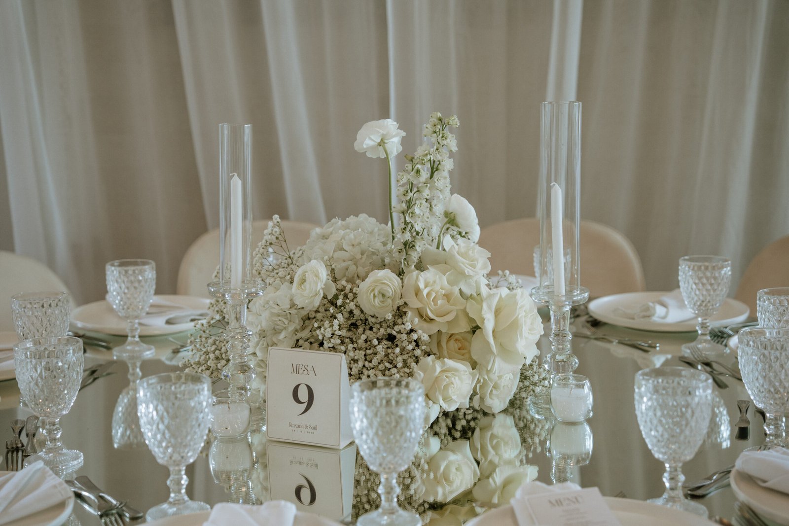 The atmosphere felt intentional but never forced. The floral work was clean, airy, and cohesive, complemented by glass cylinders, transparent chairs, and soft textiles The floating candle ceiling became the anchor point indoors, offering ambient warmth and elevating the entire room.