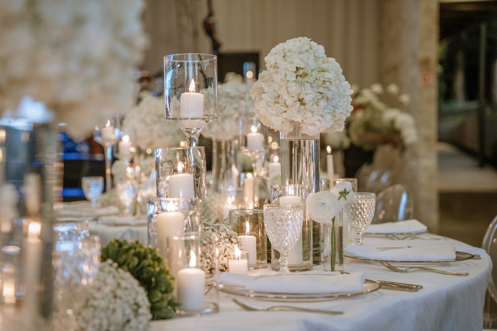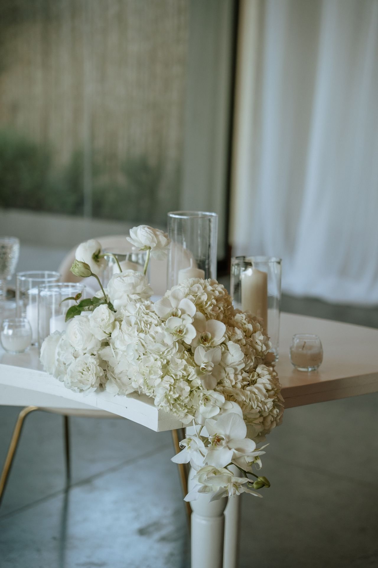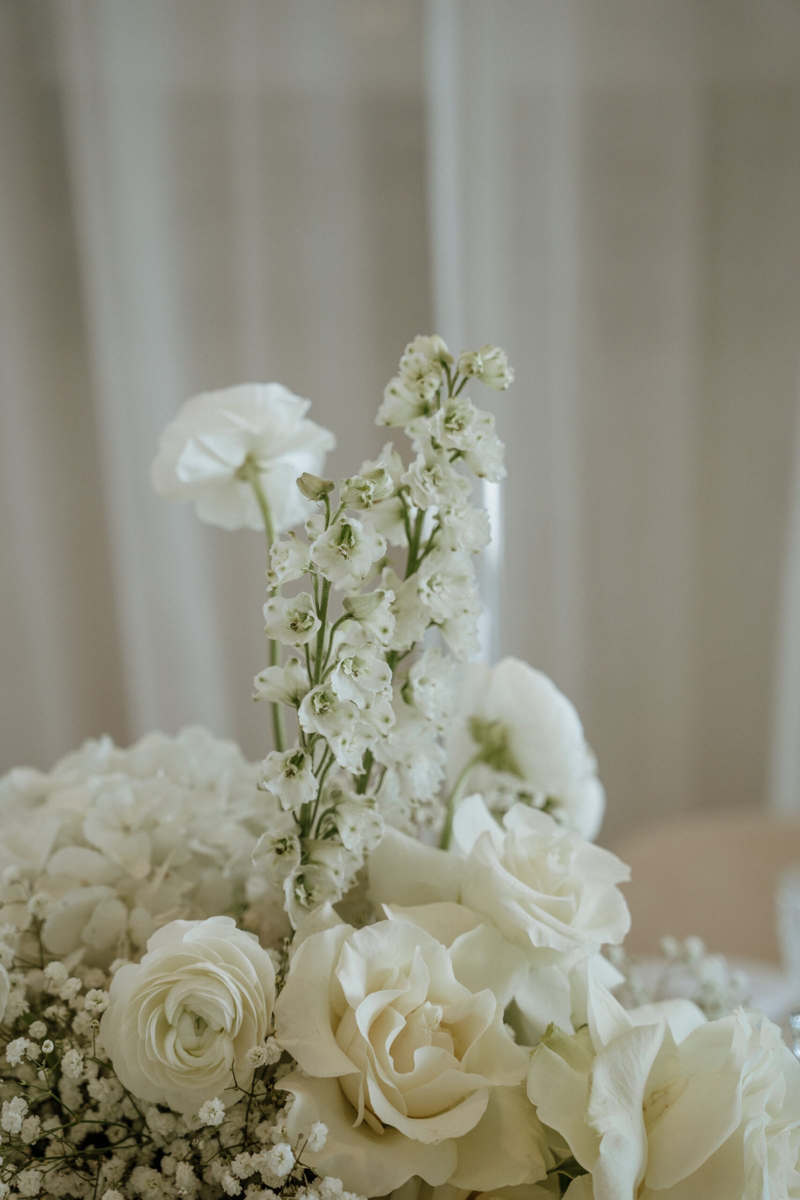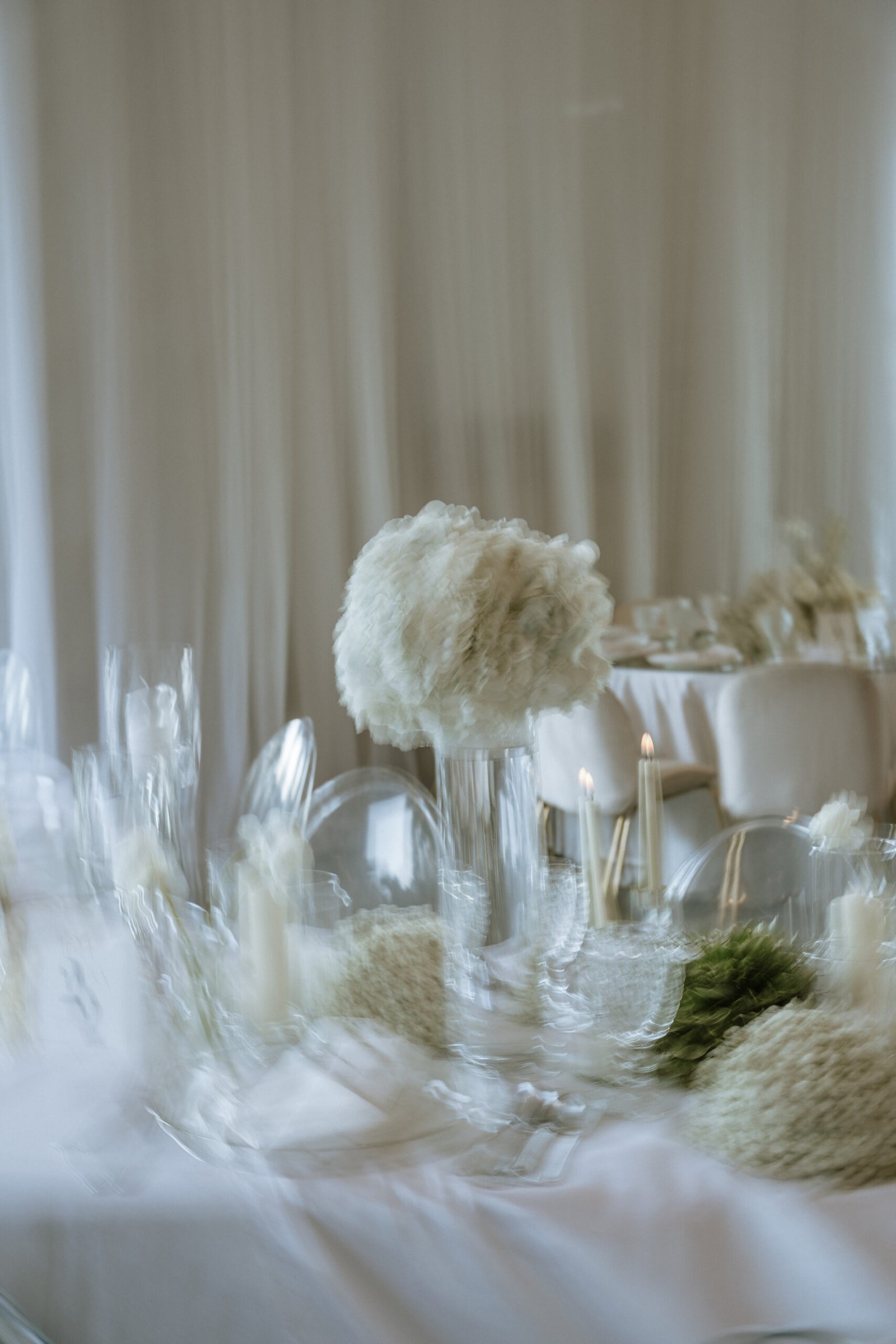 This wedding design focused on the beauty of restraint — sculptural floral compositions, layered in texture, brought a quiet boldness to the space. While the overall palette remained strictly white, each arrangement explored form and rhythm: some pieces played with verticality and structure, while others rested low and lush.