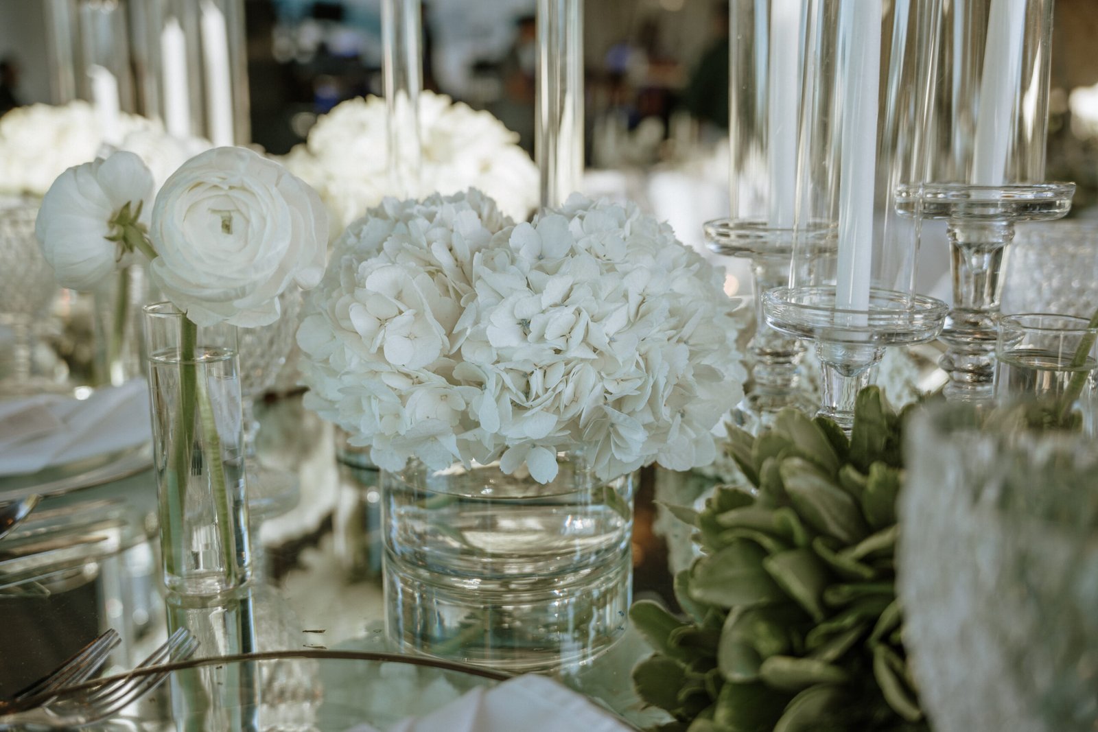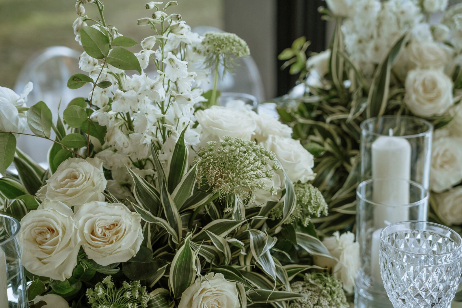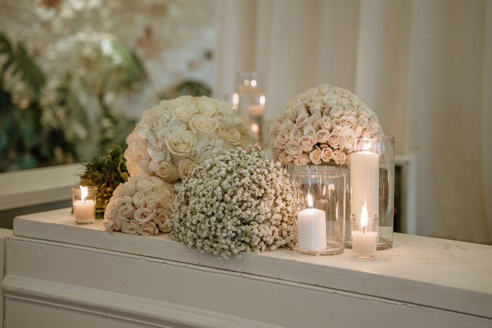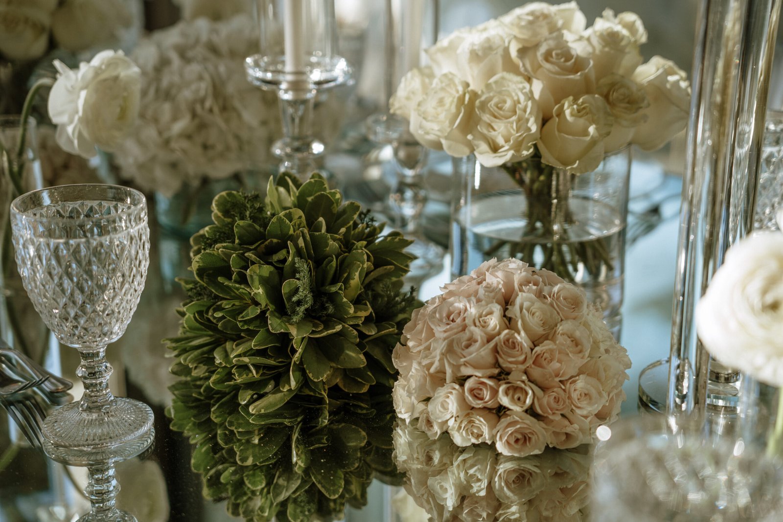 This wedding design focused on the beauty of restraint — sculptural floral compositions, layered in texture, brought a quiet boldness to the space. While the overall palette remained strictly white, each arrangement explored form and rhythm: some pieces played with verticality and structure, while others rested low and lush.